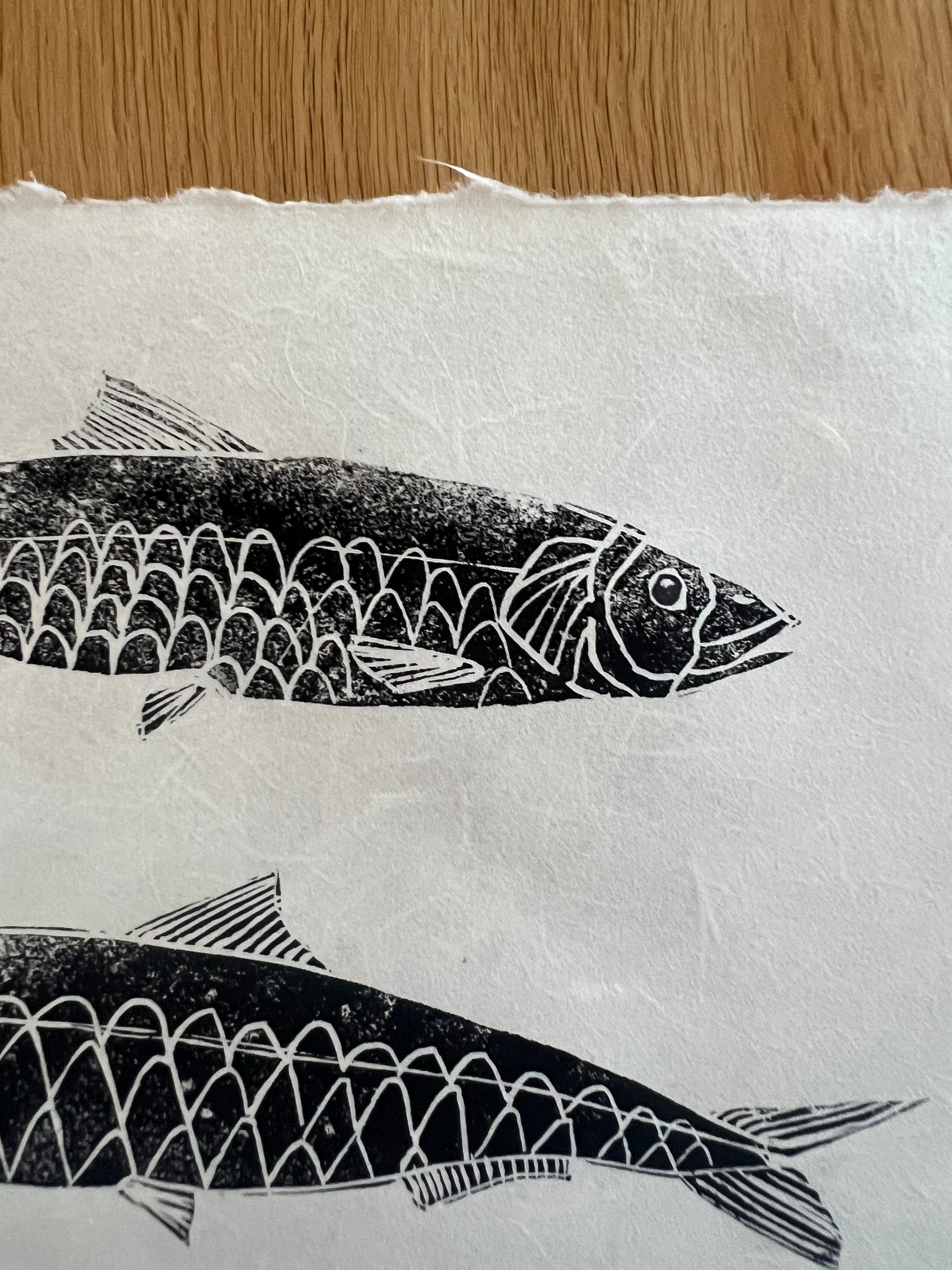 This 10 x 10 inch sardines print is hand-pulled from an original linocut block and printed in black acrylic ink on handmade Thai mulberry paper. The composition features three sardines arranged to highlight their distinctive shapes, scales, and flowing forms. I've used exactly the same technique I'd use to print a real sardine, including hand painting the eyes after printing. The work is also wet mounted to a second sheet of Thai mulberry paper to give it strength.