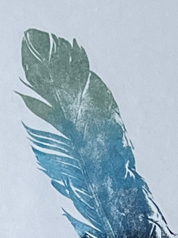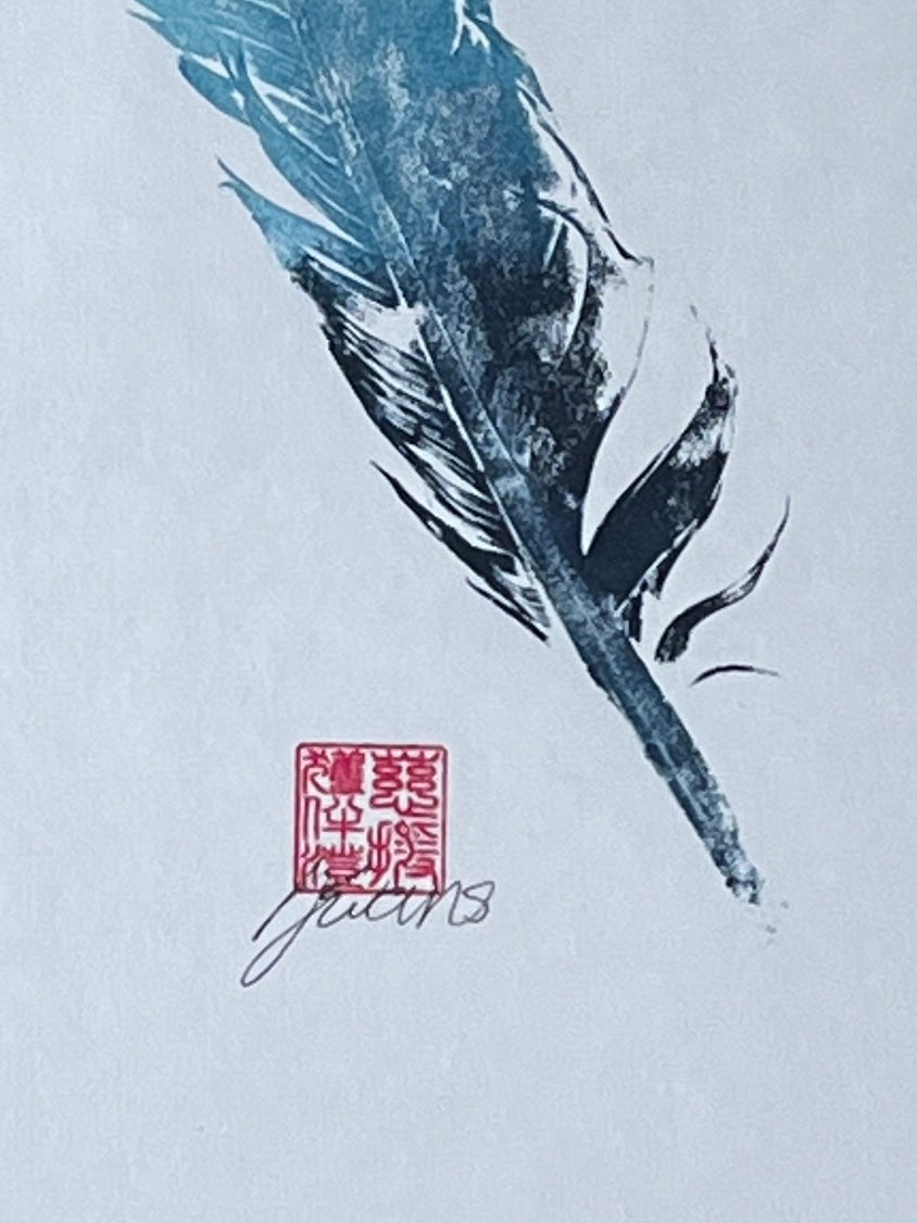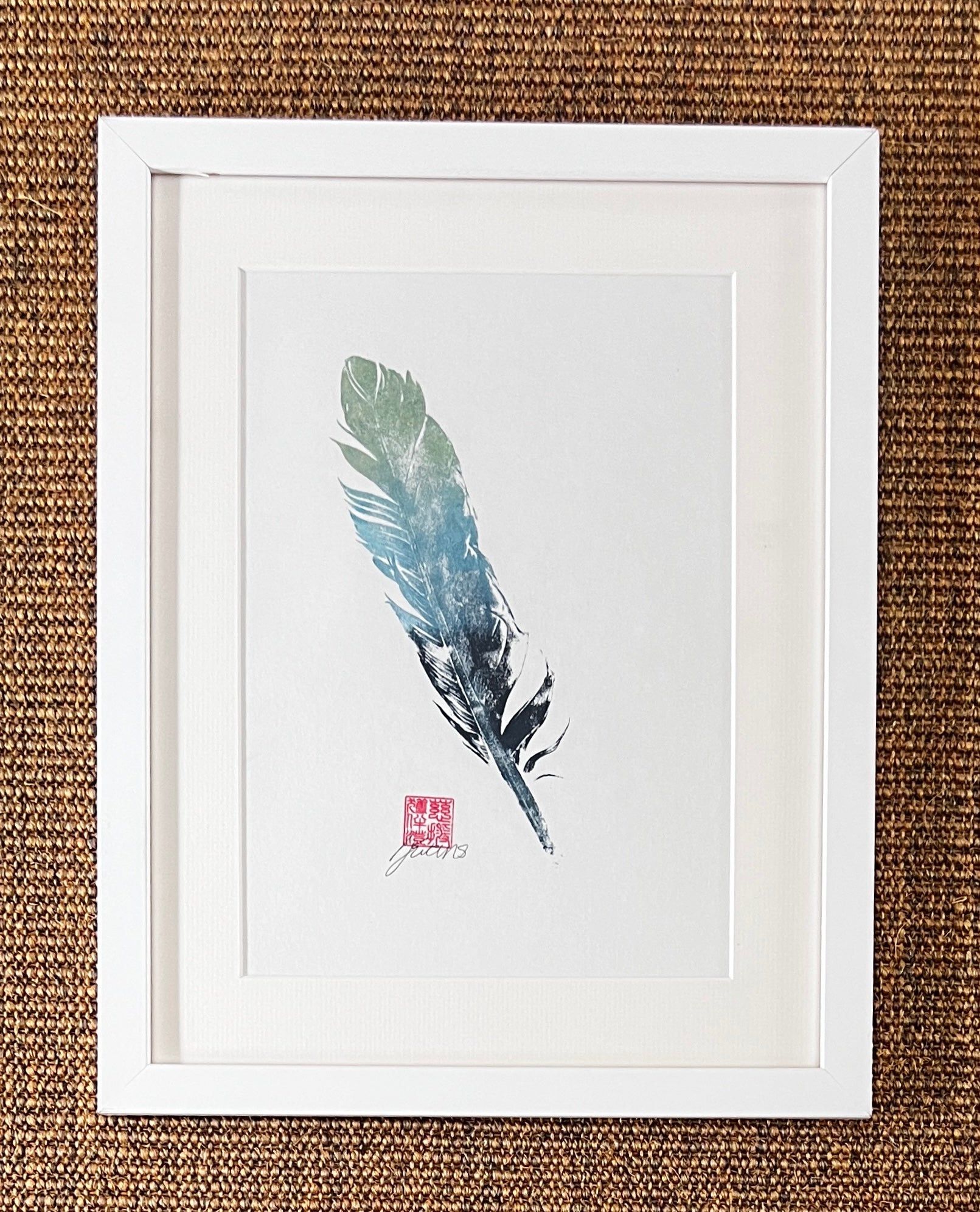 I've always loved printing feathers they make a very effective print and are popular amongst my clients. This one is printed on Chinese Xuan paper and the backing paper is Japanese Masa paper. The ink is acrylic screen printing ink and is blue and gold.