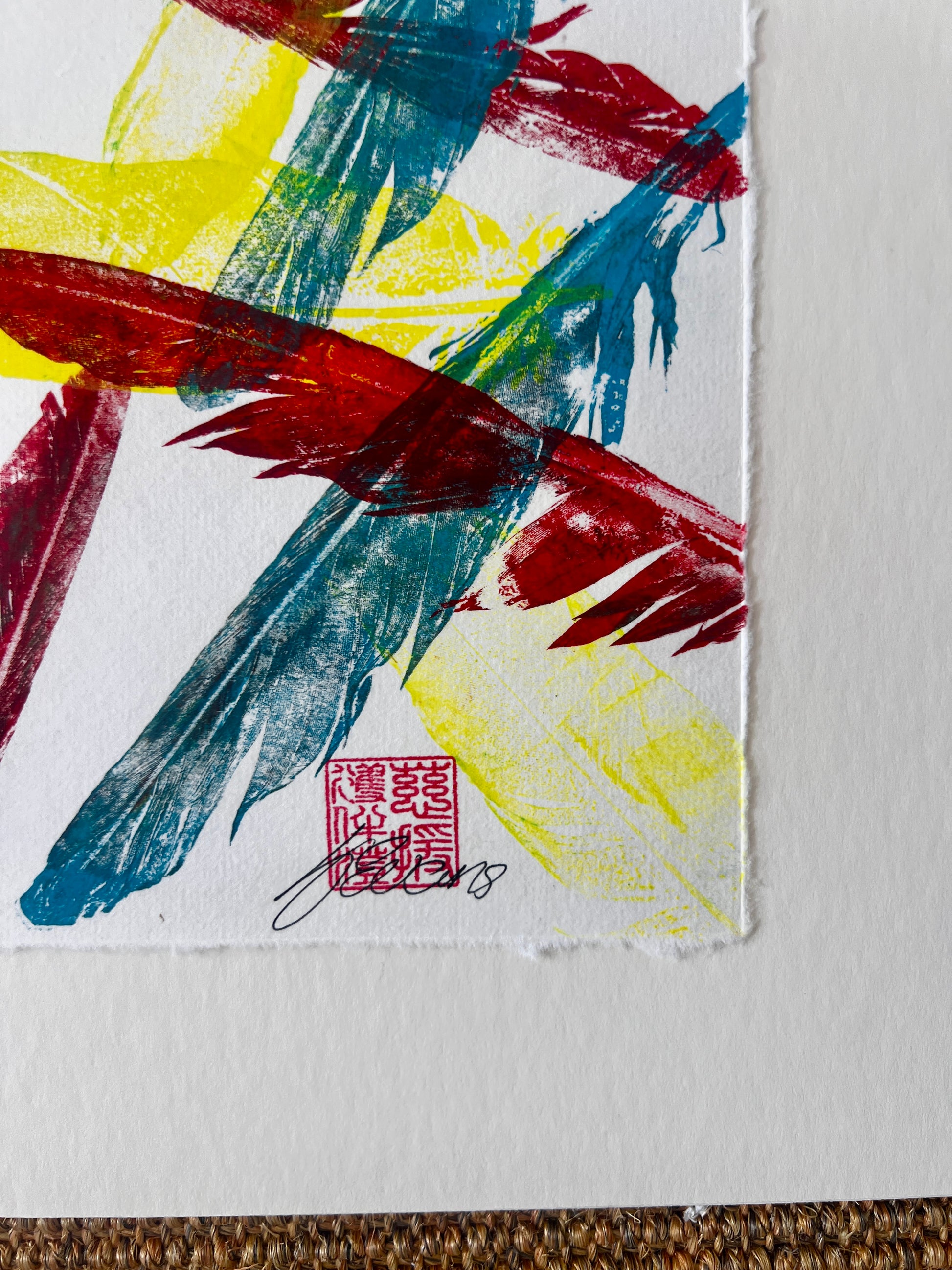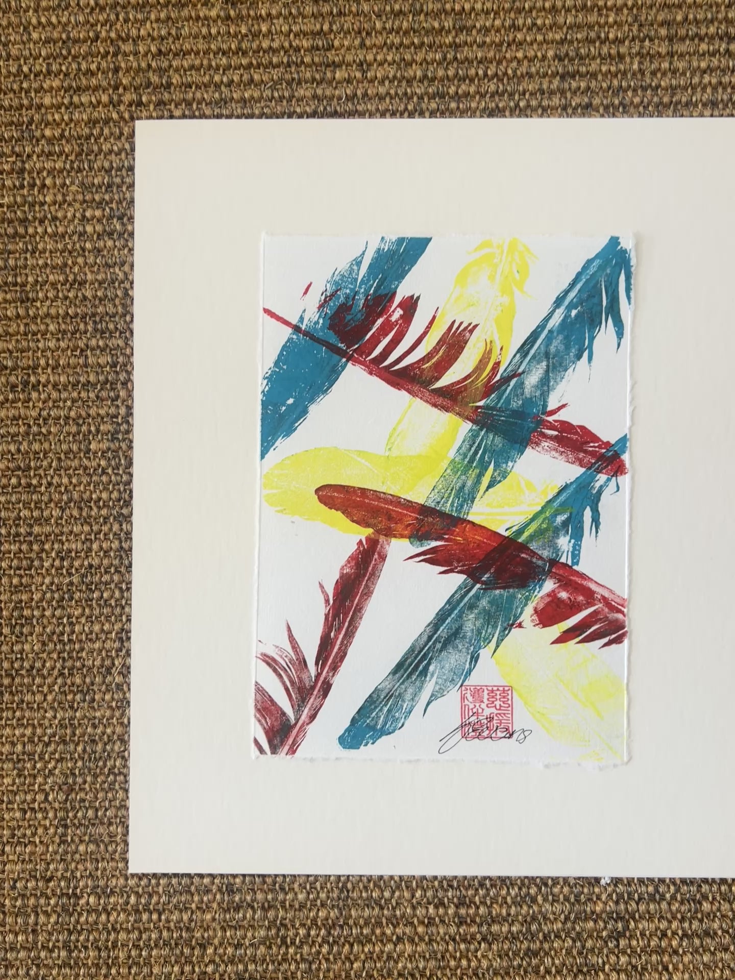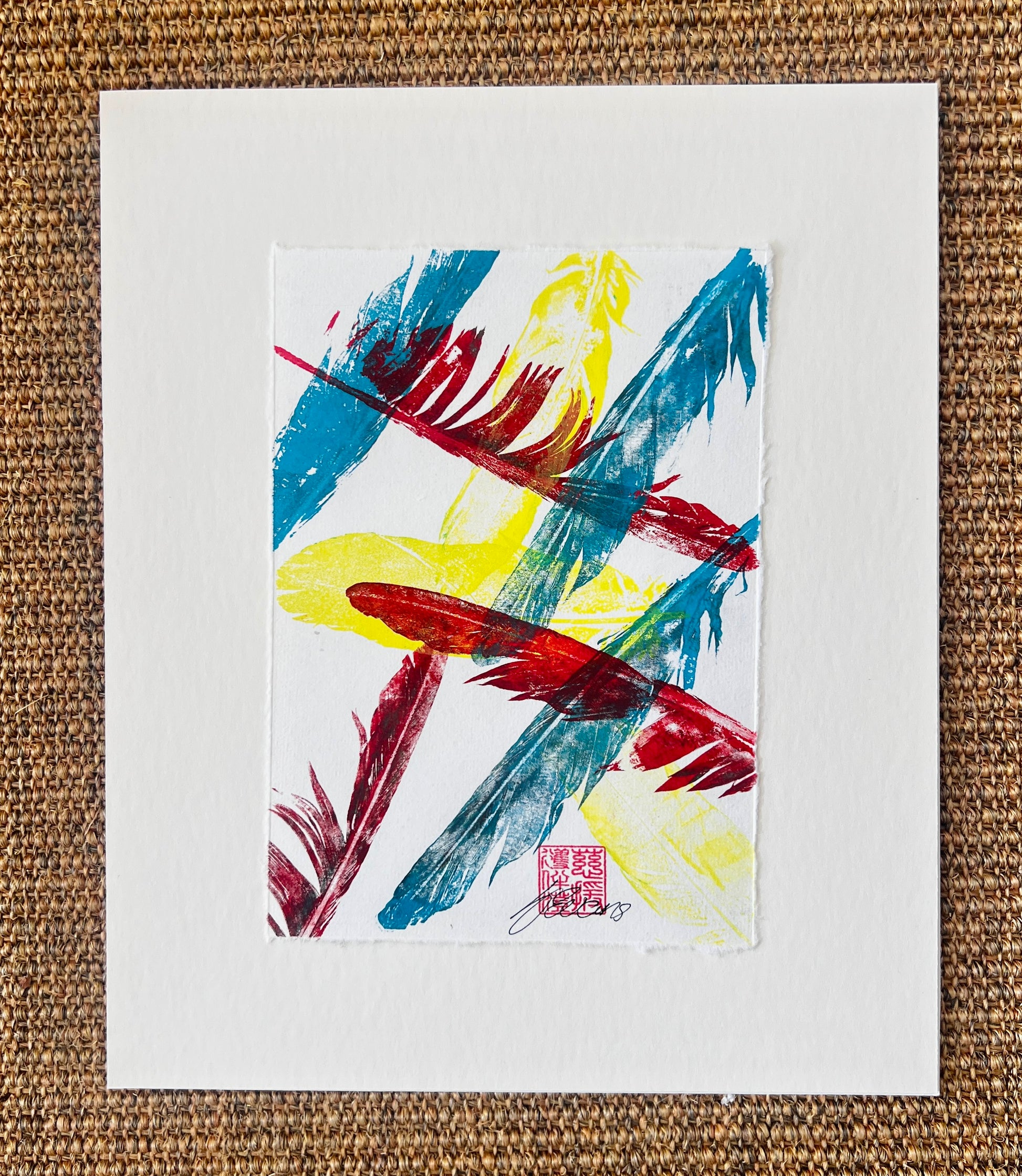 This original hand-printed artwork captures the delicate beauty of a feather through the traditional Japanese Gyotaku printing technique, finished with the refined Urauchi mounting method. Each print is carefully layered with three vibrant colors — blue, red, and yellow — creating a striking interplay of tone and depth. Printed using acrylic lightfast permanent ink, the piece is both durable and archival, ensuring its colors remain vivid for years to come.