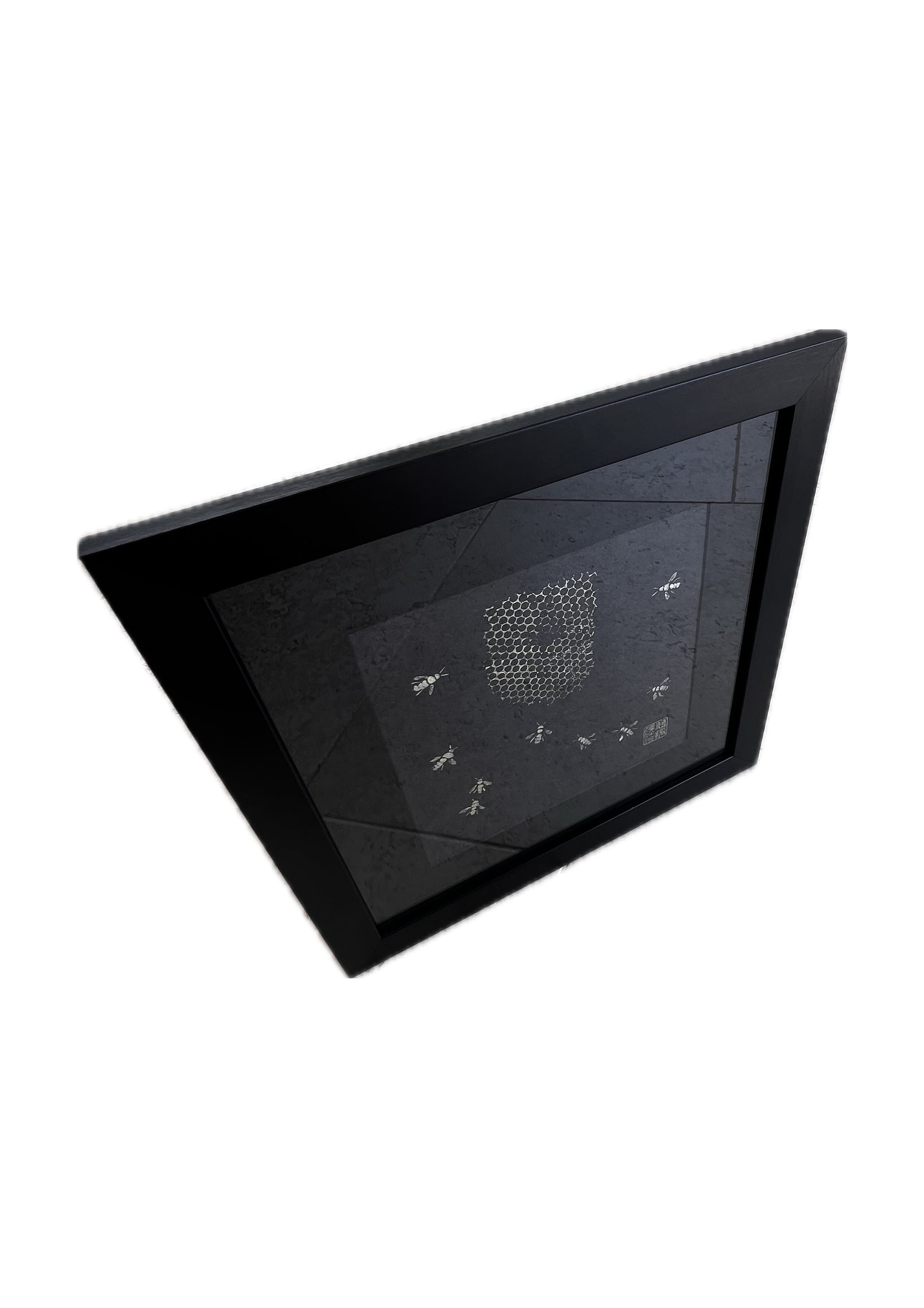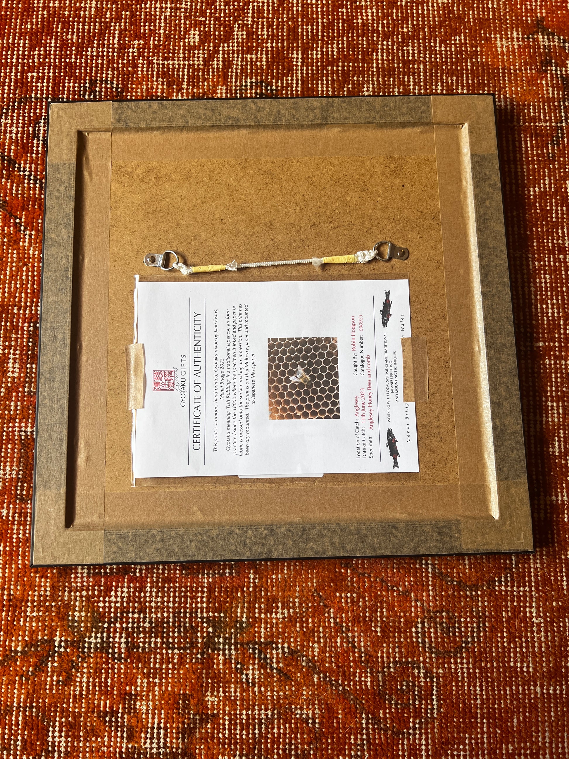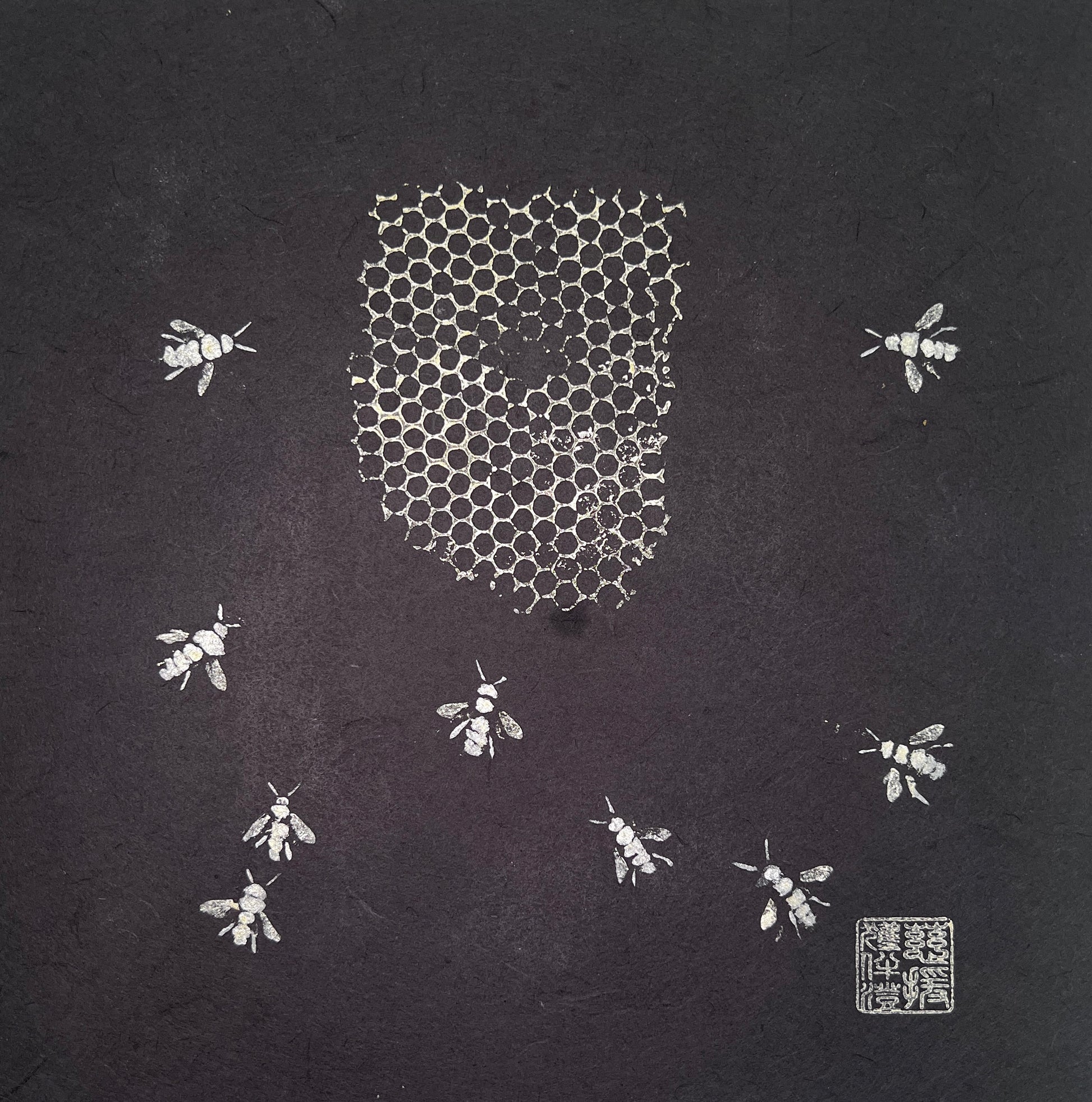 I've been printing from bees and honeycomb for a couple of years now and they always prove to be a popular subject.  This print is on Thai Mulberry Paper and I've used a Gold acrylic ink which is lightfast and permanent.