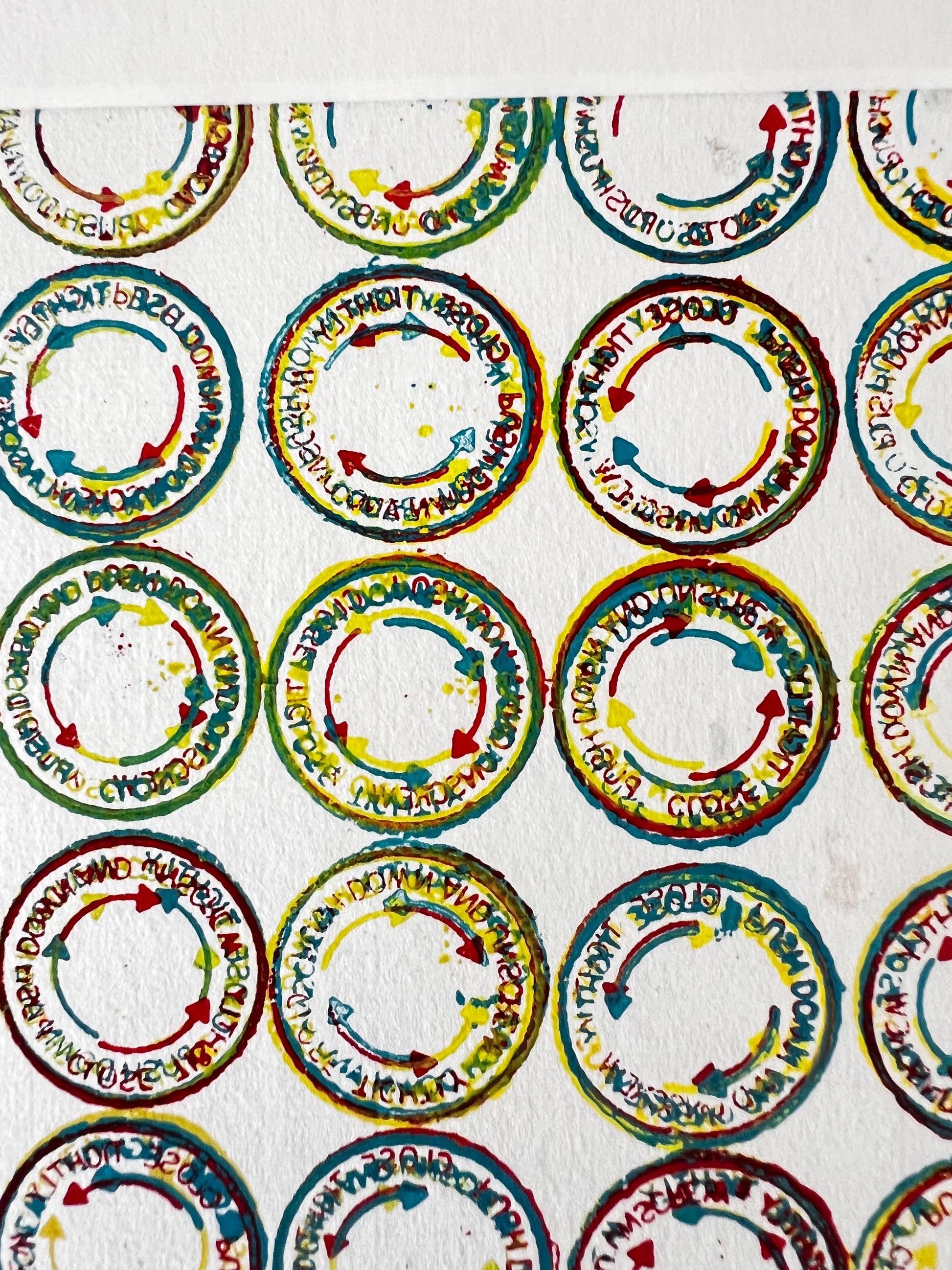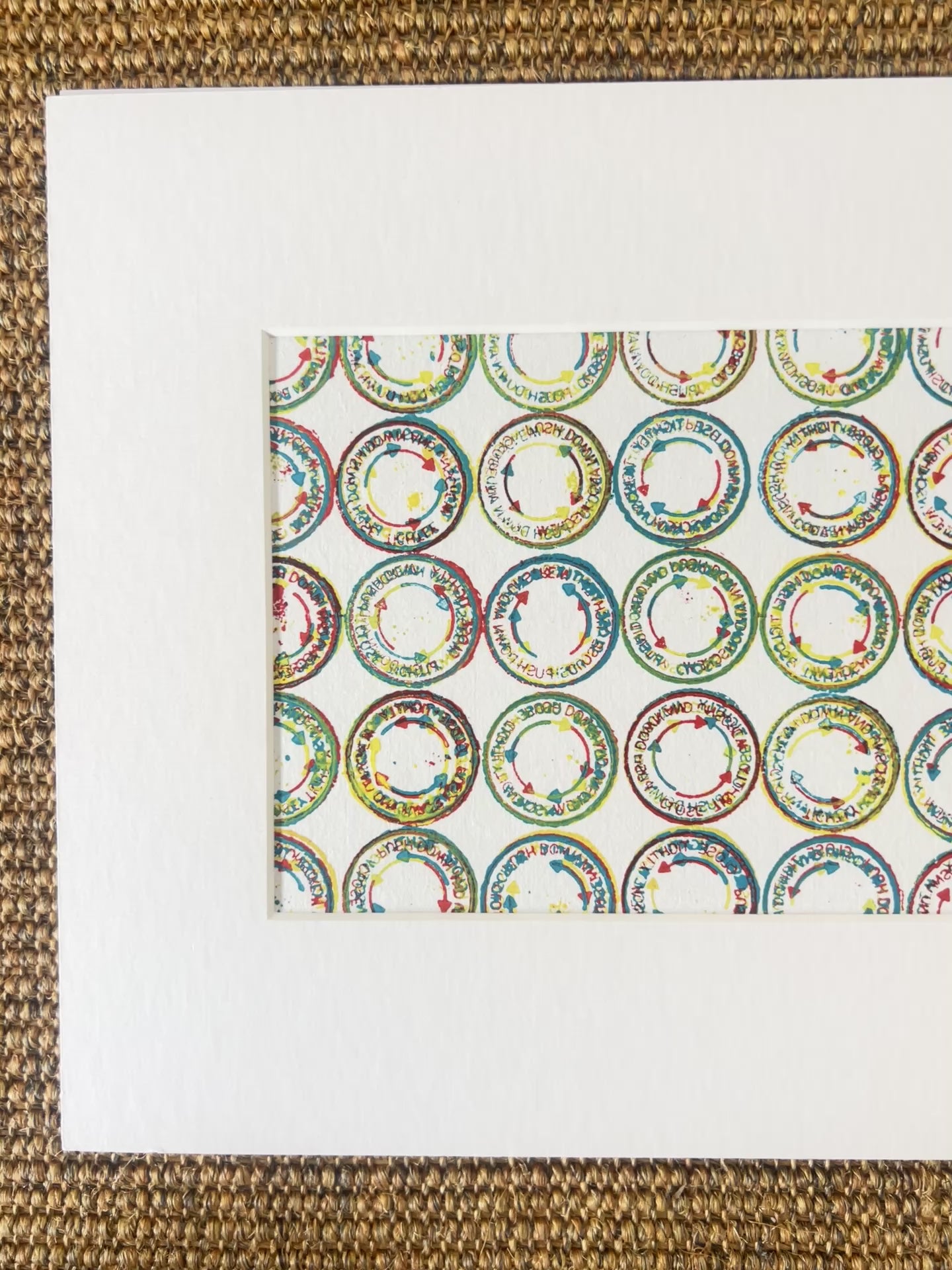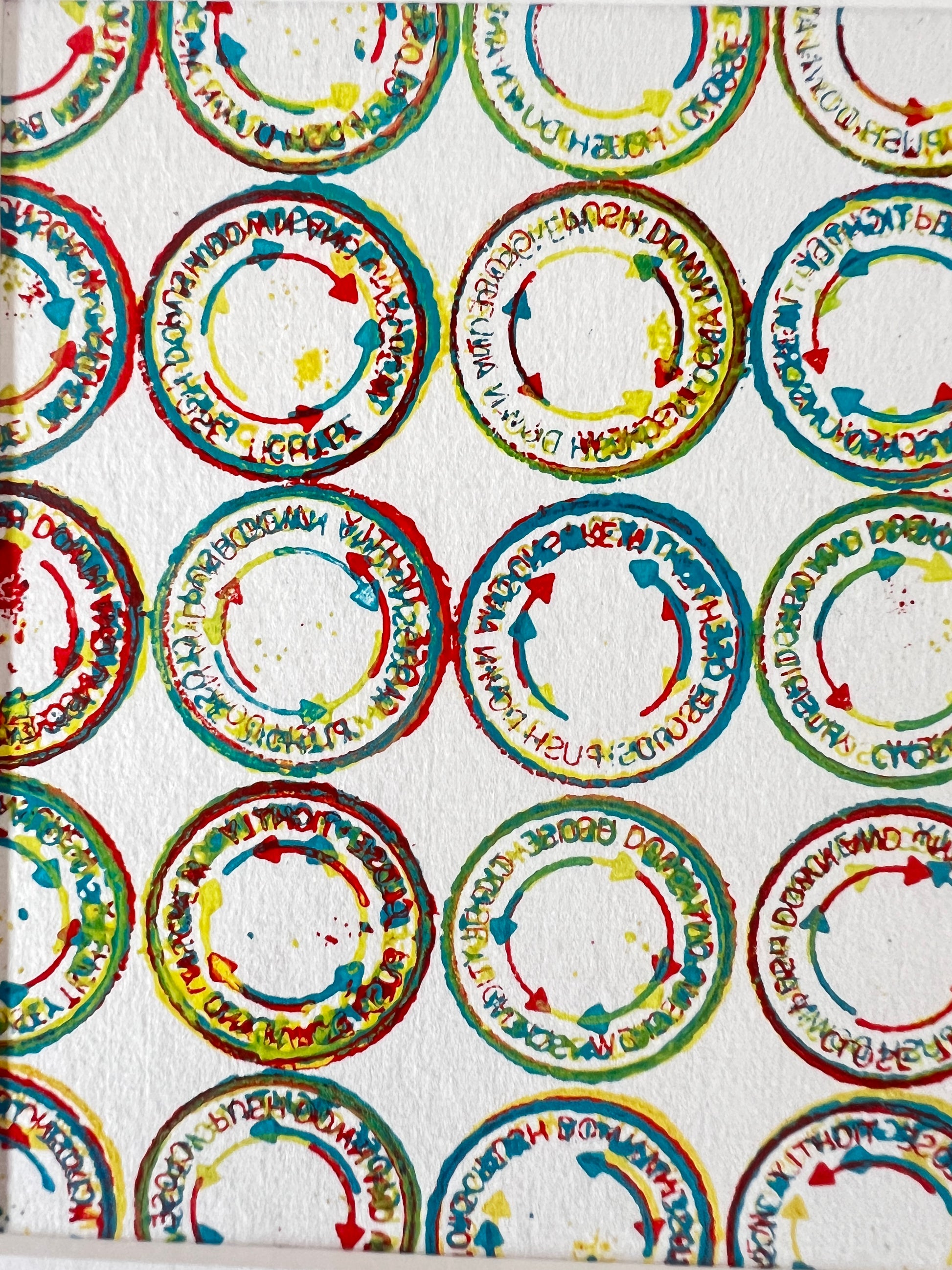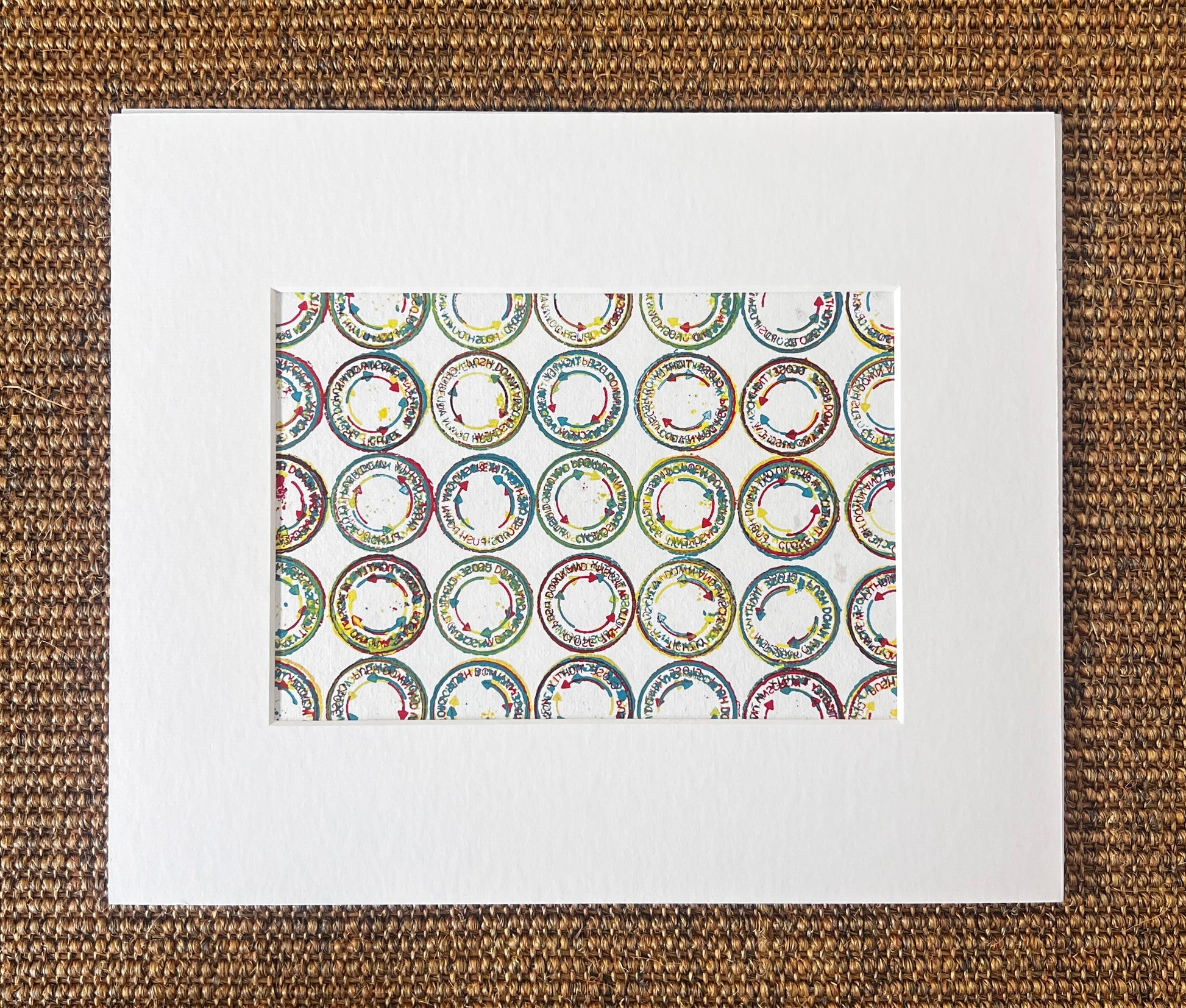 This original hand-printed artwork transforms a plastic bottle top recovered from a local beach into a striking exploration of pattern, repetition, and renewal. After serving its role in the creative process, the bottle top was responsibly recycled, underscoring the work’s connection to sustainability and care for the environment.