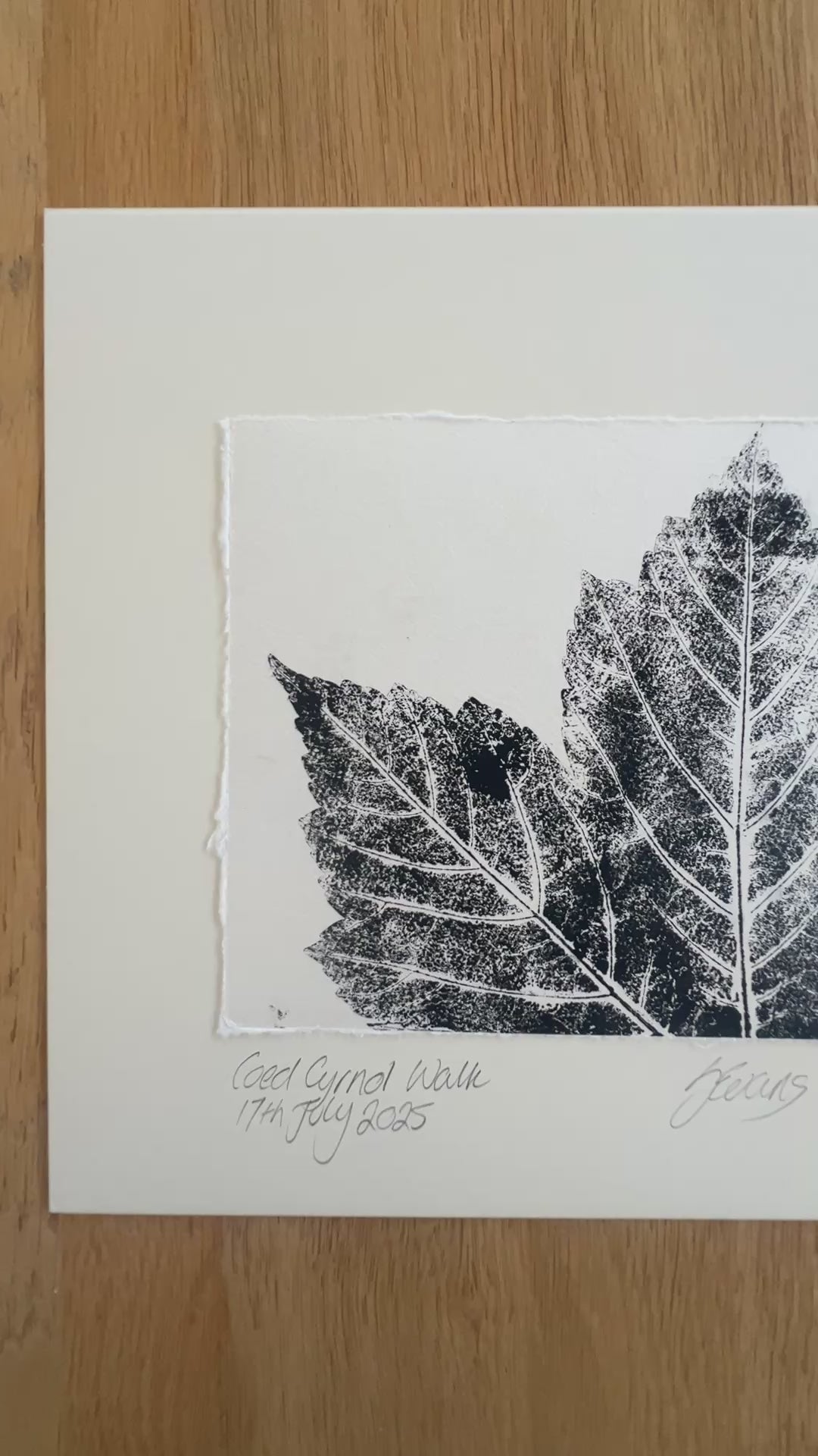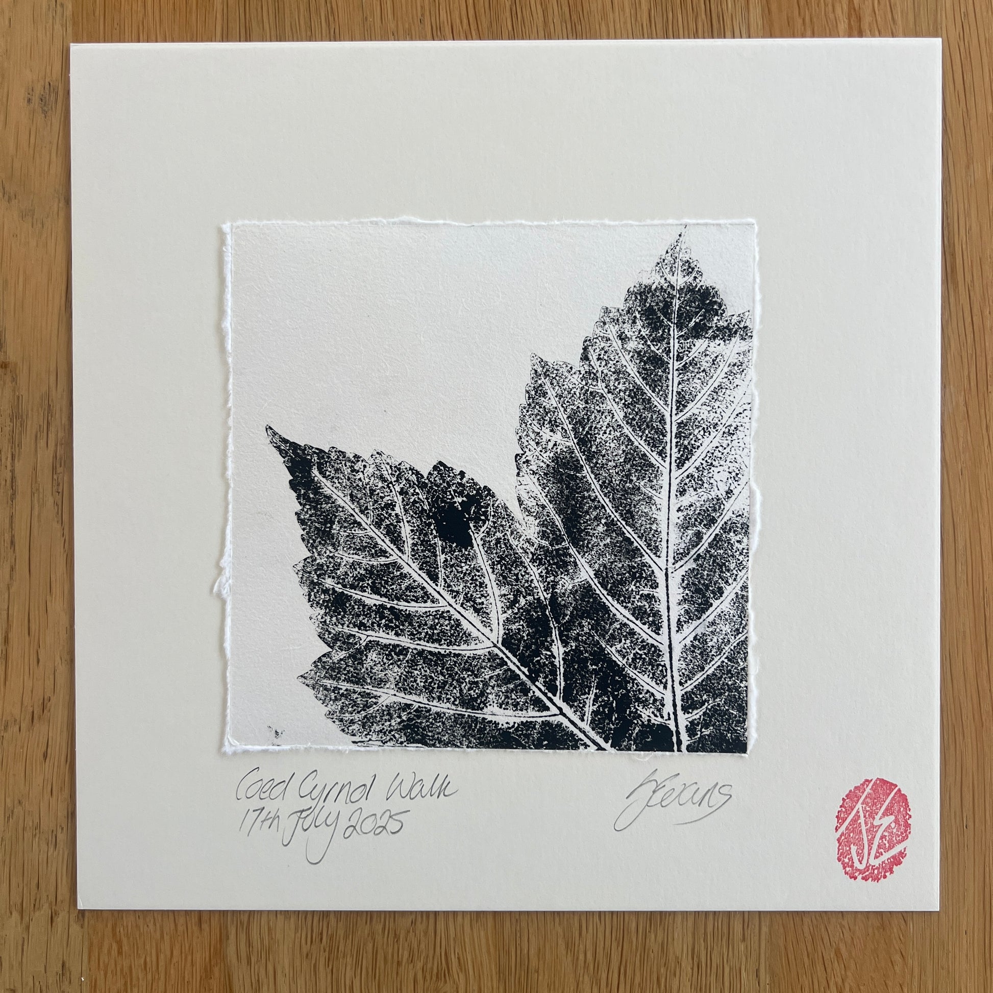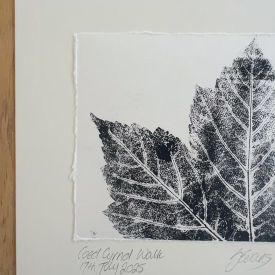 This hand-pulled leaf composition print features real leaves collected during a walk in Coed Cyrnol, Menai Bridge. Printed in black acrylic ink on hand-made Thai mulberry paper, the artwork highlights the texture, shape, and natural detail of each leaf.