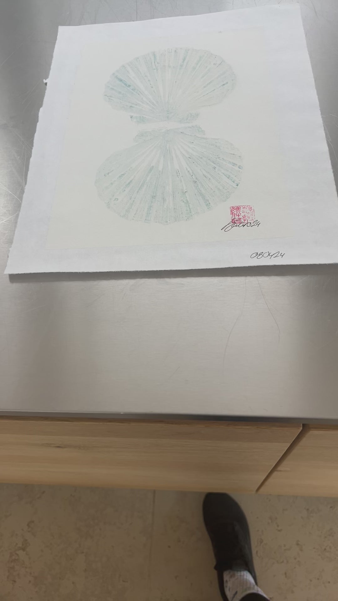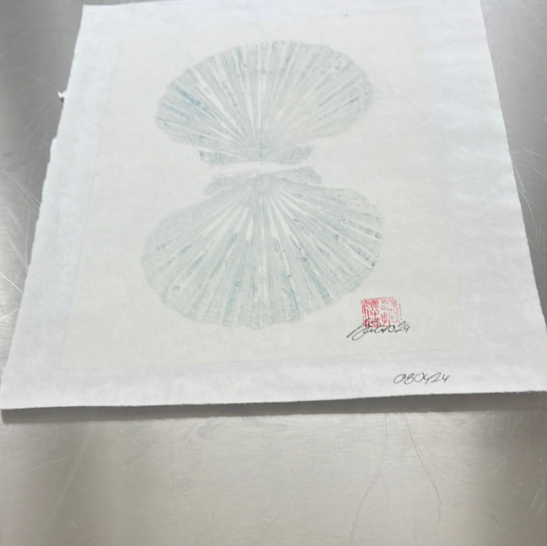 Here the shell has been printed on Chinese Xuan paper using a high quality acrylic ink that is permanent and light fast. Once the print has been made it requires wet mounting or as they call it in Japan Urauchi. To do this, we apply a glue to the back of the print and then a second sheet of paper is pressed against the back of the print. The two sheets are left to dry overnight and will bond and be flat.