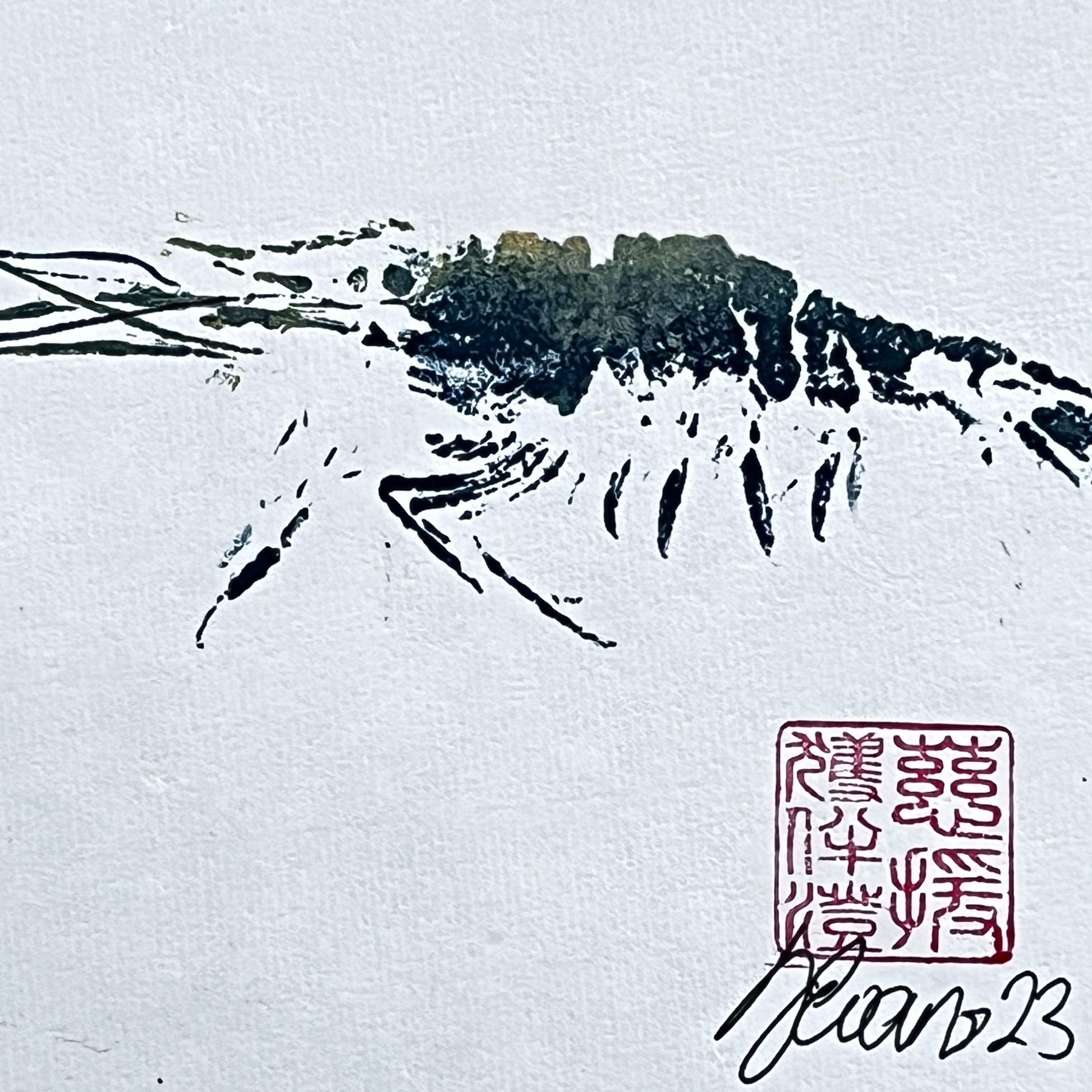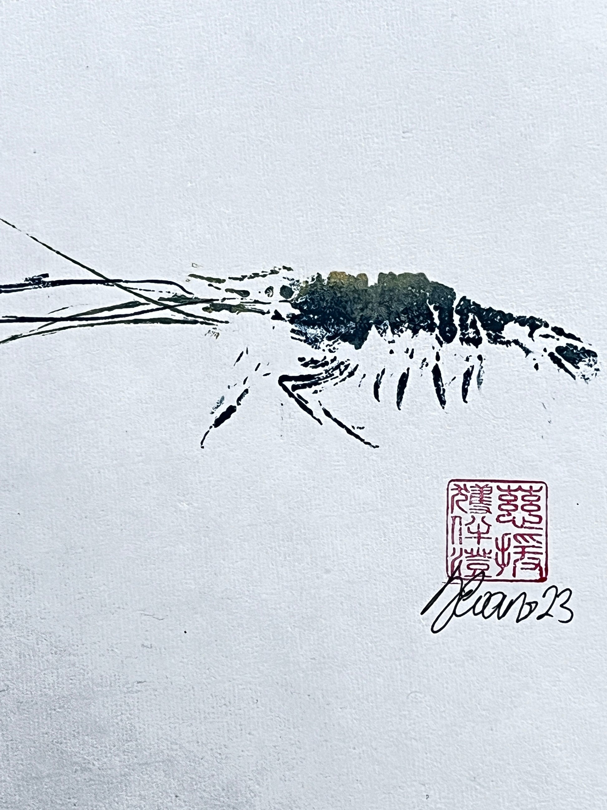 I've printed the same prawn here twice, once from each side, onto an A4 sheet of Chinese calligraphy paper using and dark blue and gold ink. It takes a long time to prepare and ink a prawn and then position it ready to print. So although it's a small print, a lot of work goes into it.