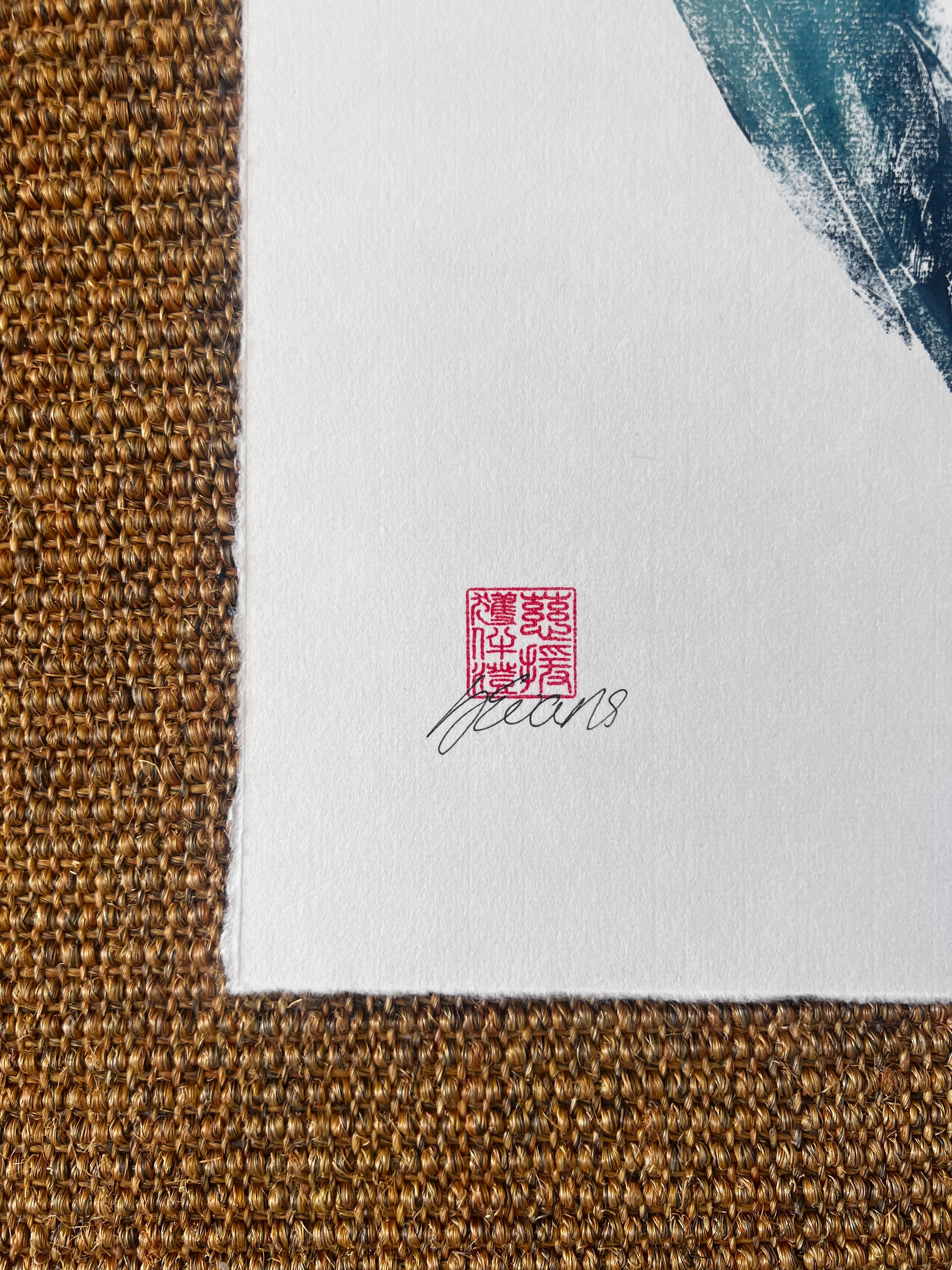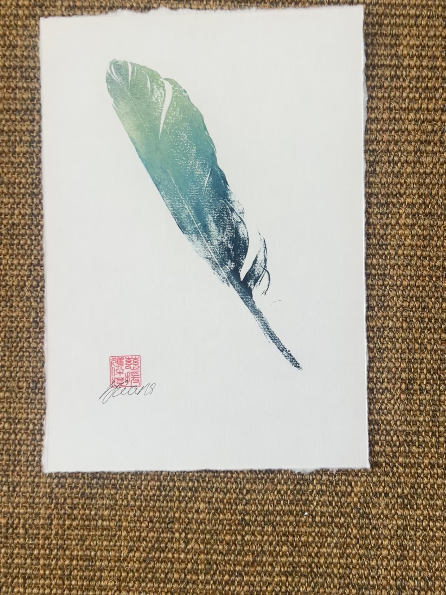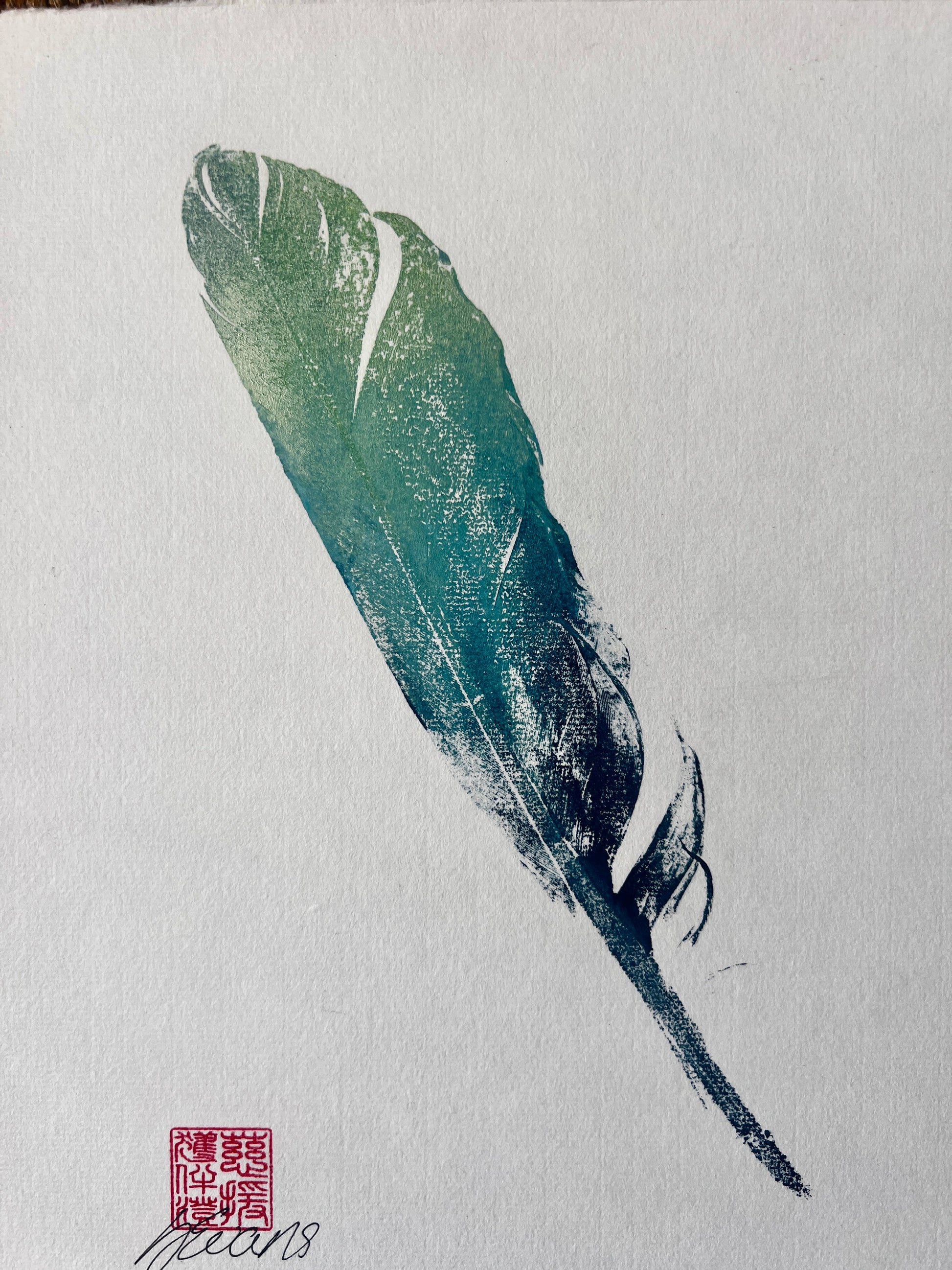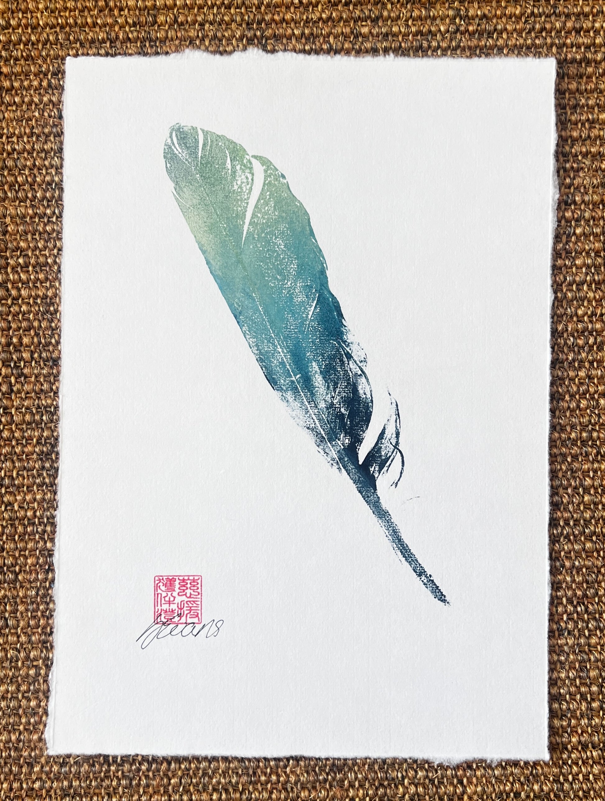 I've always loved printing feathers they make a very effective print and are popular amongst my clients. This one is printed on Chinese Xuan paper and the backing paper is Japanese Masa paper. The ink is acrylic screen printing ink and is blue and gold.