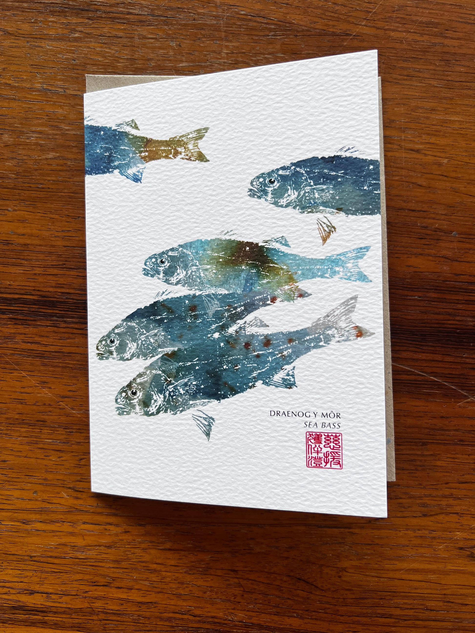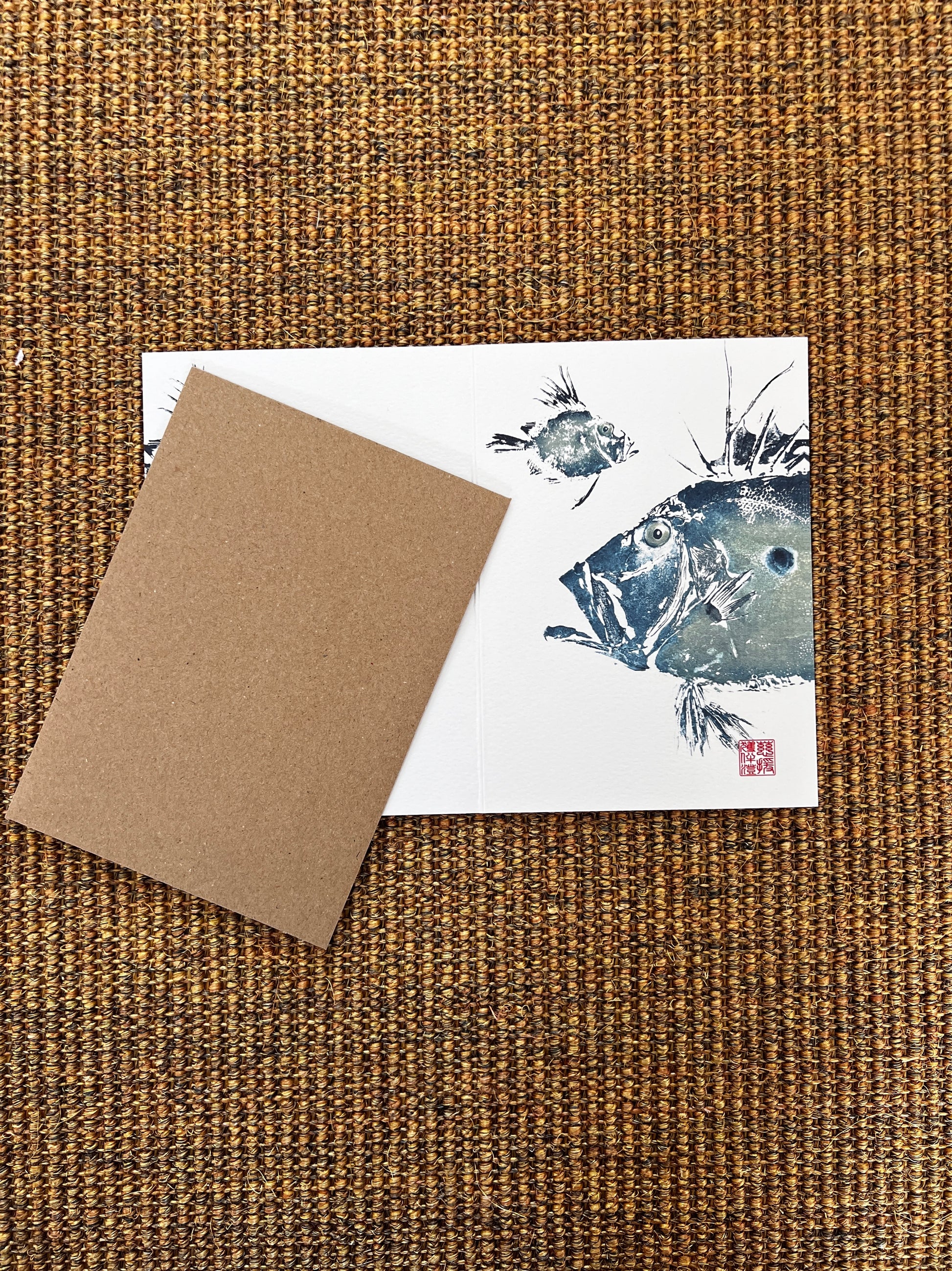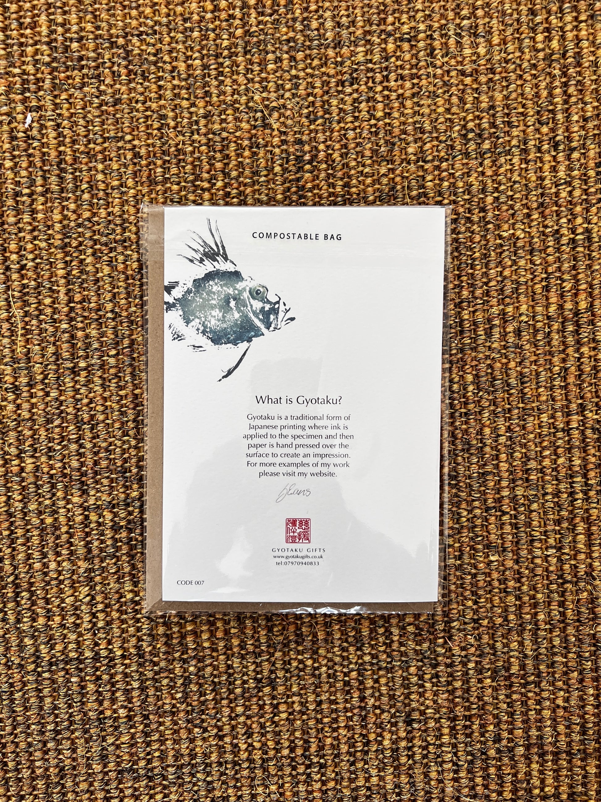 These cards are taken from original Gyotakus I have made; John Dory, Feather, Octopus and Sea Bass Shoal. The cards are blank inside.
