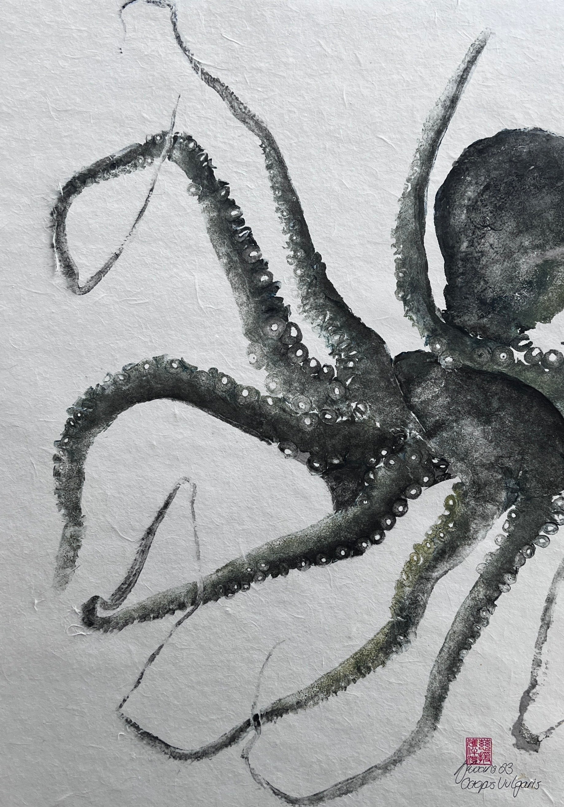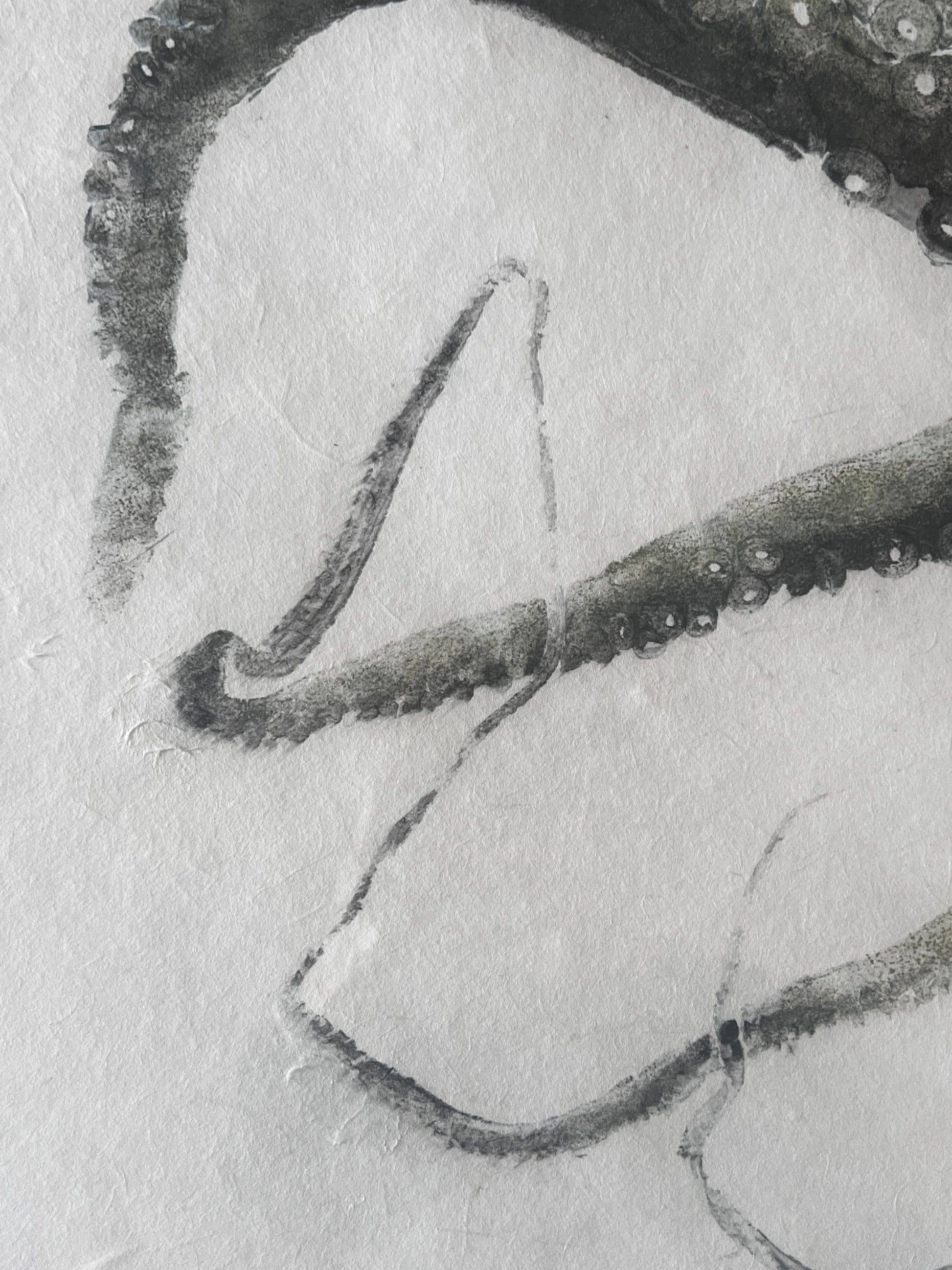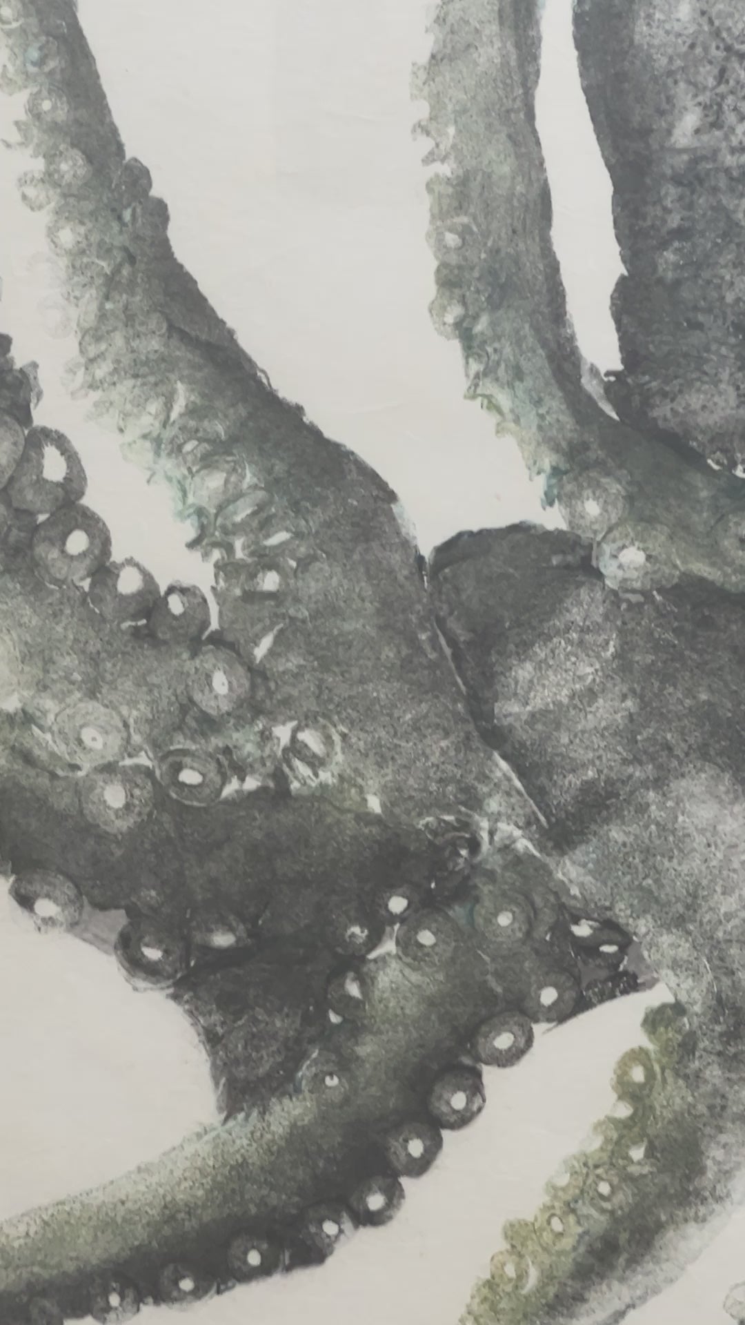Octopus are a difficult specimen to work with but make beautiful prints. I've used a combination of acrylic and sumi ink on this print. The print itself, measures 70cm x 50cm and frame 64cm x 84cm.