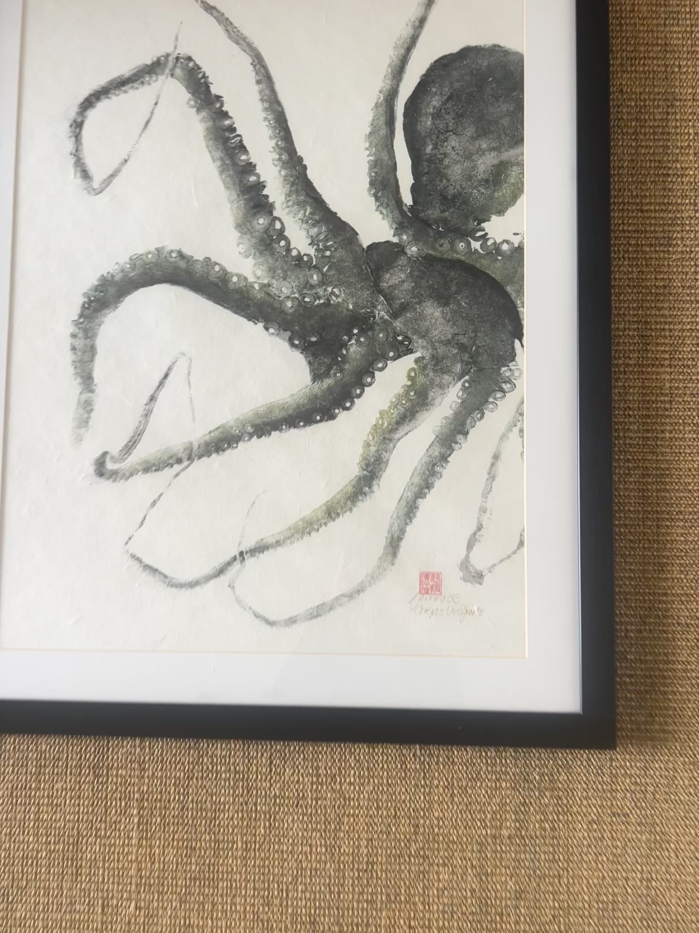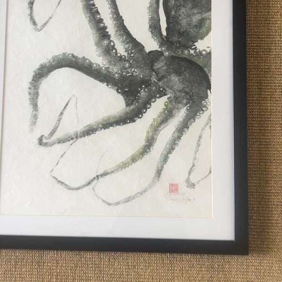 Here I have used a hand made Japanese Mulberry paper and the octopus is off set to one side. After printing I then use the Urauchi method to apply backing paper to make the print frameable. The print has been professionally framed by my framer.