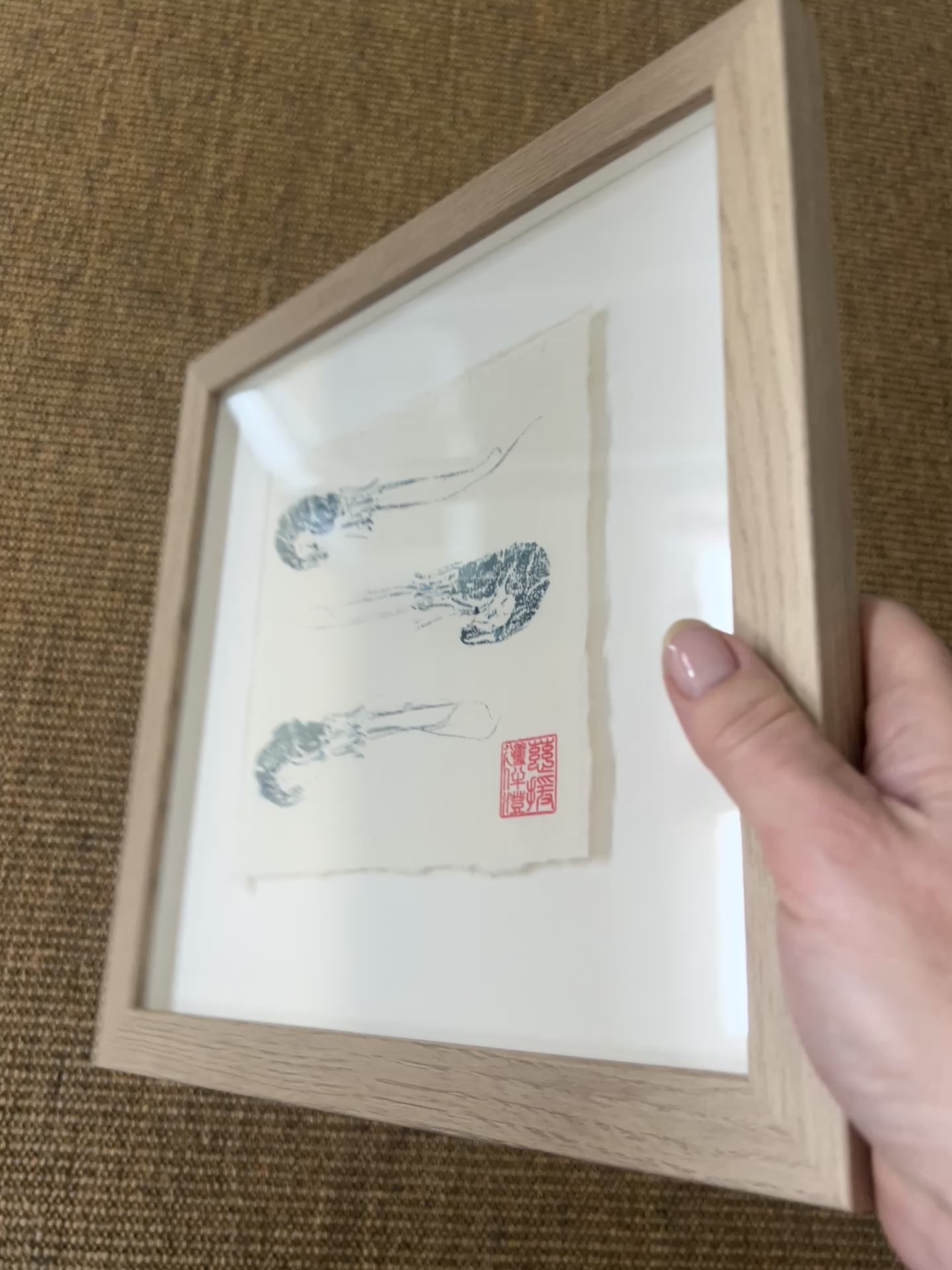 This prawn print captures the unique form of these fascinating creatures. Printed in blue and gold acrylic ink, the artwork has a soft iridescence that shifts beautifully in the light, evoking the shimmer of the sea.