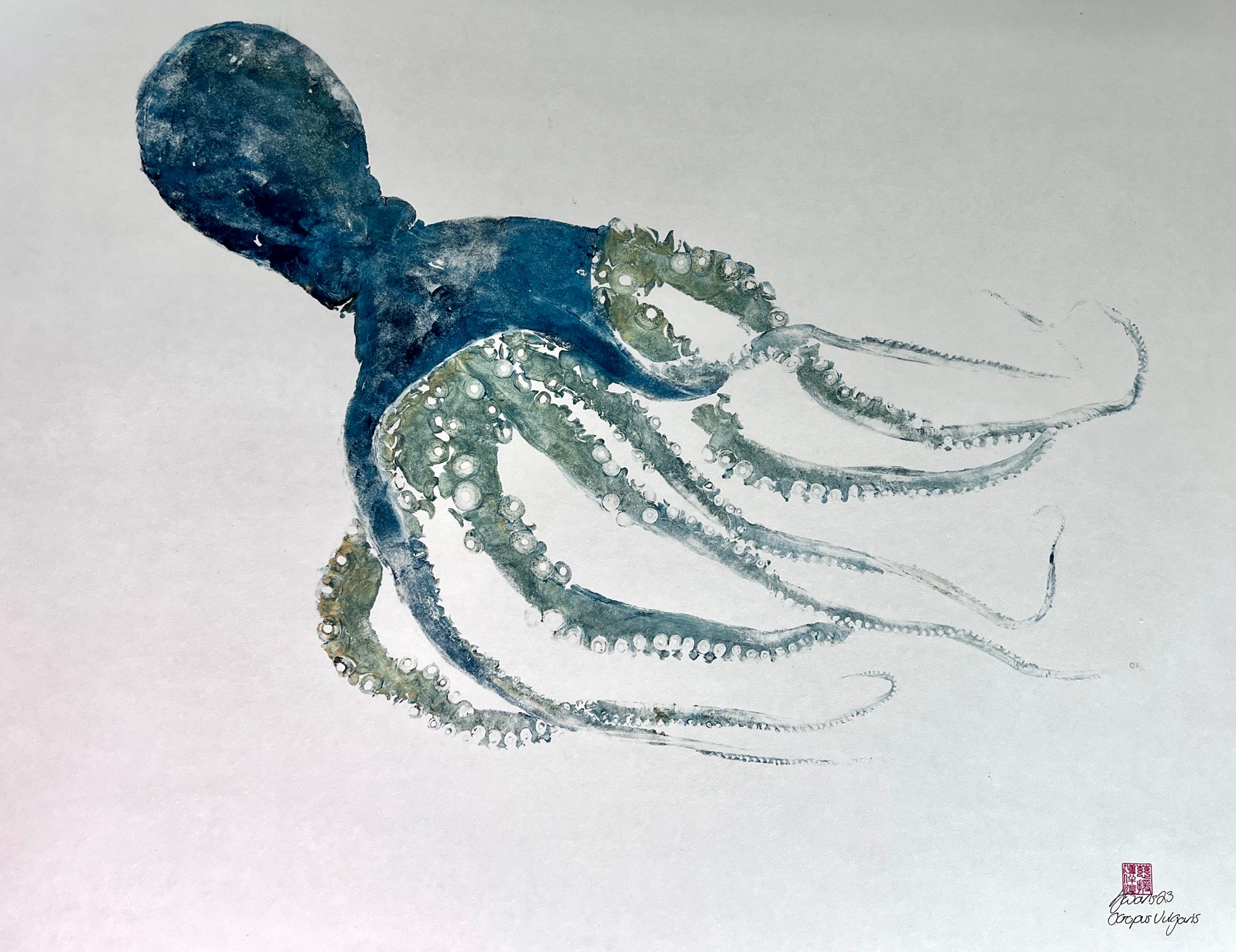 This print measures approx 90x80cm and is the largest octopus I've ever printed. The print is on Chinese Mulberry paper and then a backing is applied of Japanese Masa Paper to flatten and strengthen the print for framing.