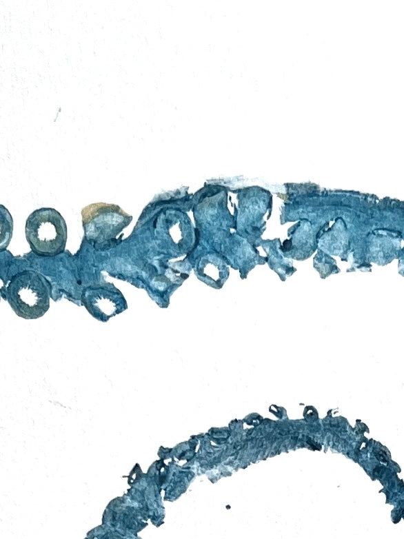 The tentacle is laid out, and then I apply an acrylic ink that is both lightfast and permanent. Next I press a light weight Chinese paper over the surface of the inked tentacle.