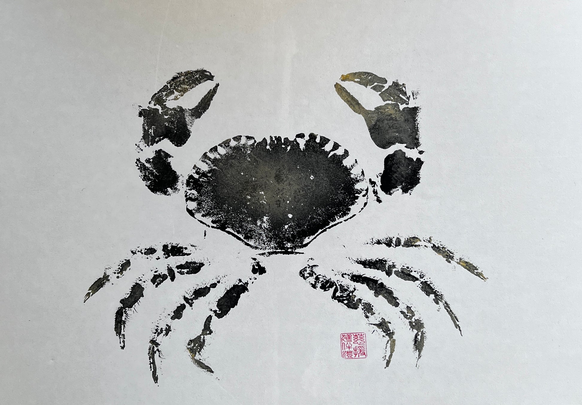 This crab is printed on Chinese Mulberry Paper, is approximately A3 in size. After printing, the paper is then mounted using the traditional wet mounting technique of Uruachi. For this I make a flour based glue and use this to bond the print to a second sheet of paper. This is the method that has been used for 1000 of years for making scrolls in China and Japan.