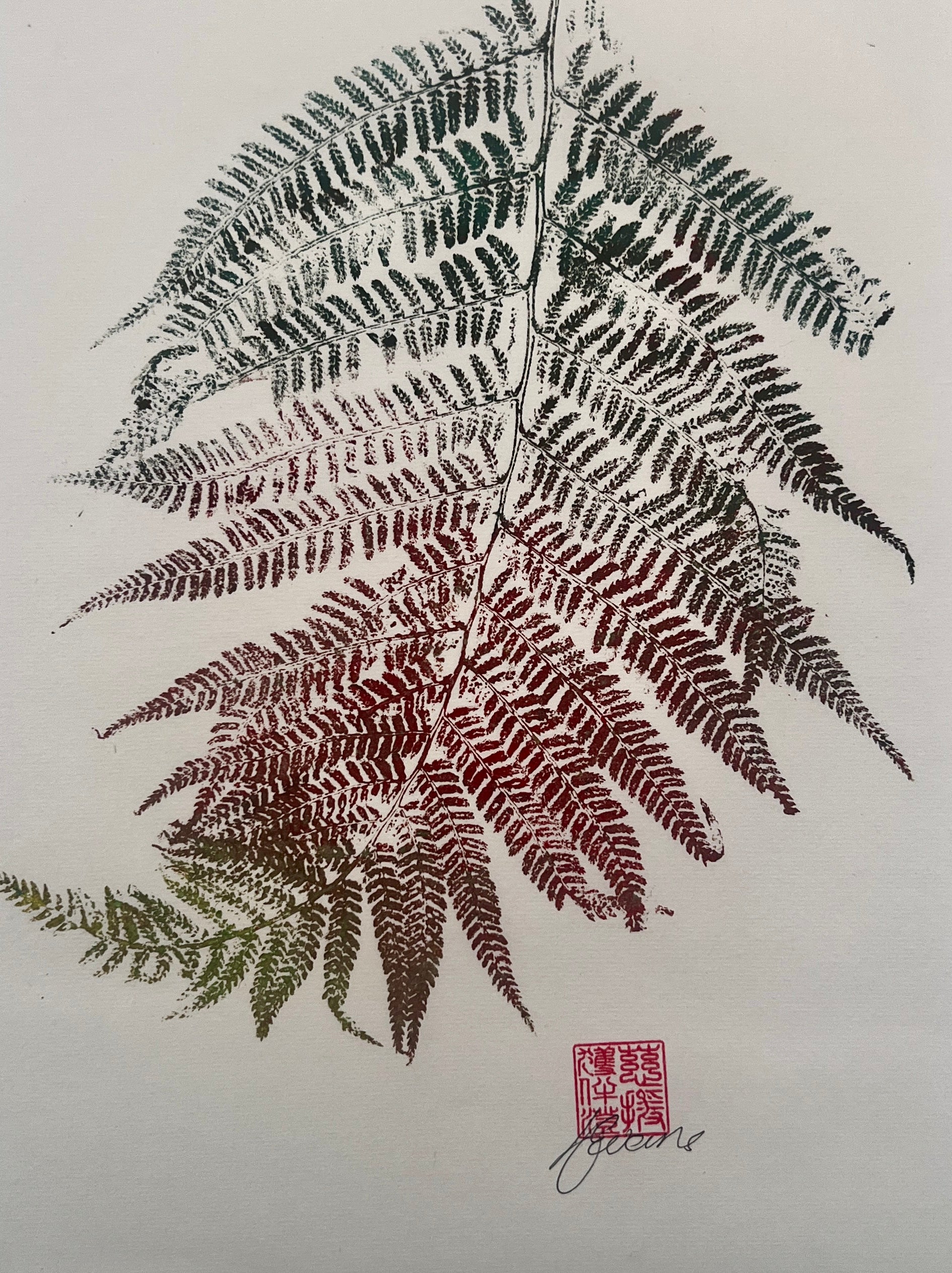 Gyotaku of a Fern Frond In Green and Brown Ink