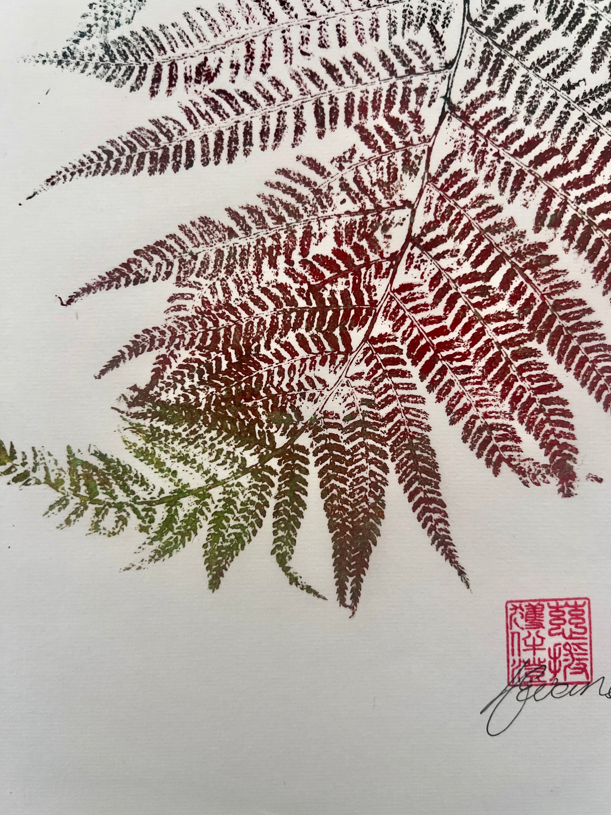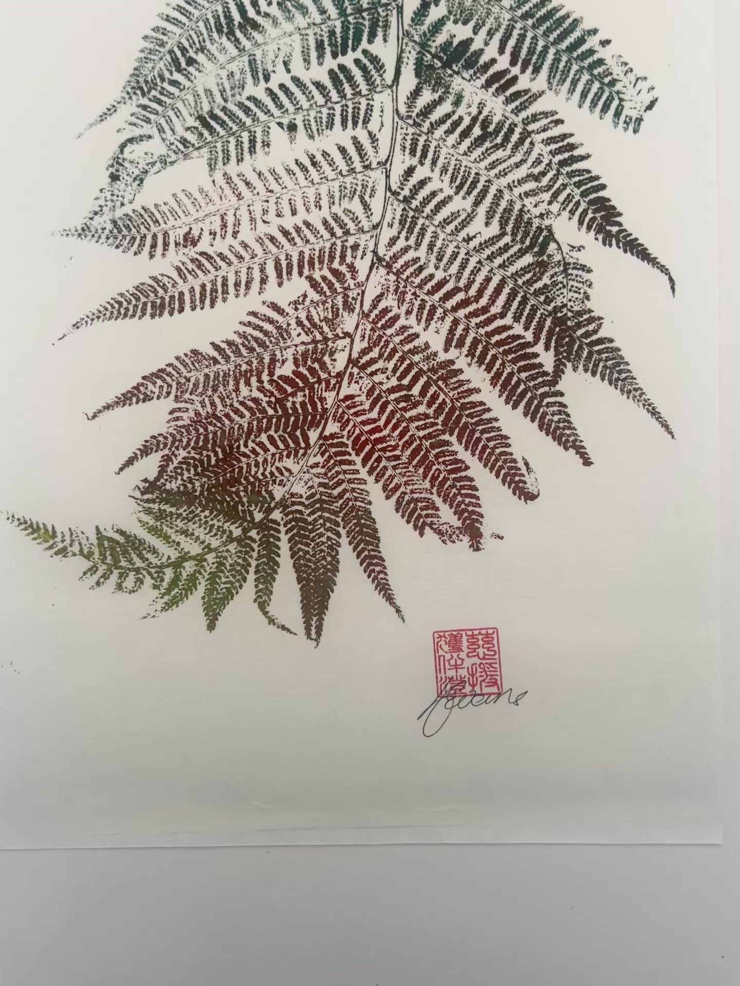 Like all my prints, I use the same method of printing which means inking up the frond then pressing a lightweight paper over the frond. In this case it was a Chinese Xuan Paper. I've used Speedball Acrylic Ink and when the print was dry it was wet mounted using the Urauchi method to a second sheet of paper to give it strength and make it flat.