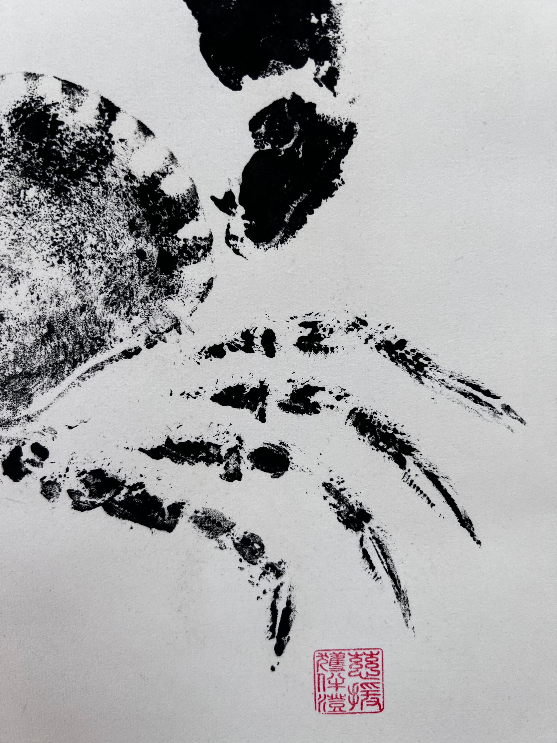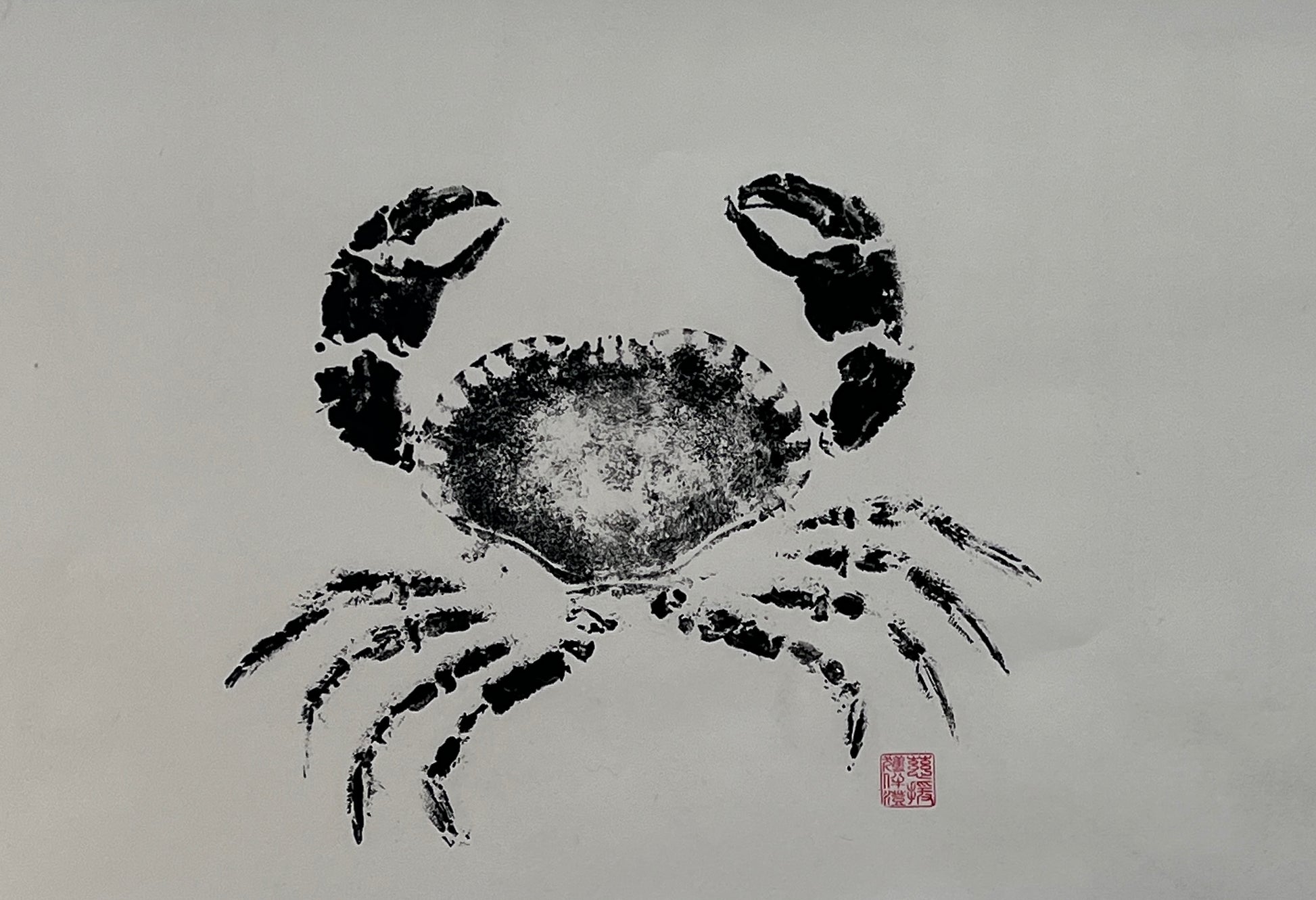This crab is printed on Chinese Mulberry Paper, is approximately A3 in size.  After printing, the paper is then mounted using the traditional wet mounting technique of uruachi.  For this I make a flour based glue and use this to bond the print to a second sheet of paper.  This is the method that has been used for 1000 of years for making scrolls in China and Japan.