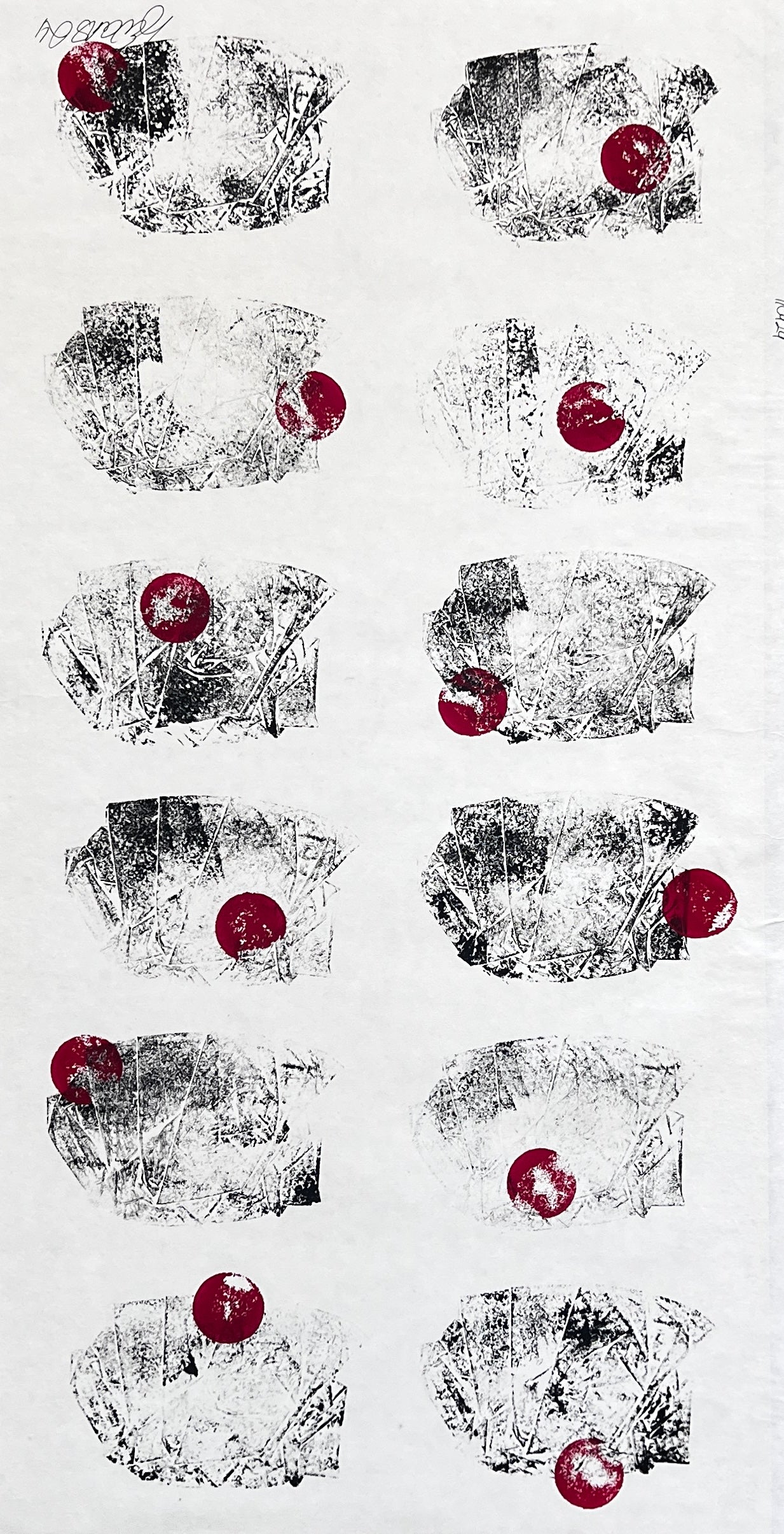 Printed on delicate yet durable Chinese Xuan paper, the work has been professionally wet mounted (Urauchi) to preserve and flatten the surface for display. A repeated matrix of forms—each subtly unique—suggests tide patterns, erosion, and human impact on the sea. The addition of a bold red sphere alongside each print imprint nods to traditional Japanese aesthetics while evoking urgency, warning, and balance.