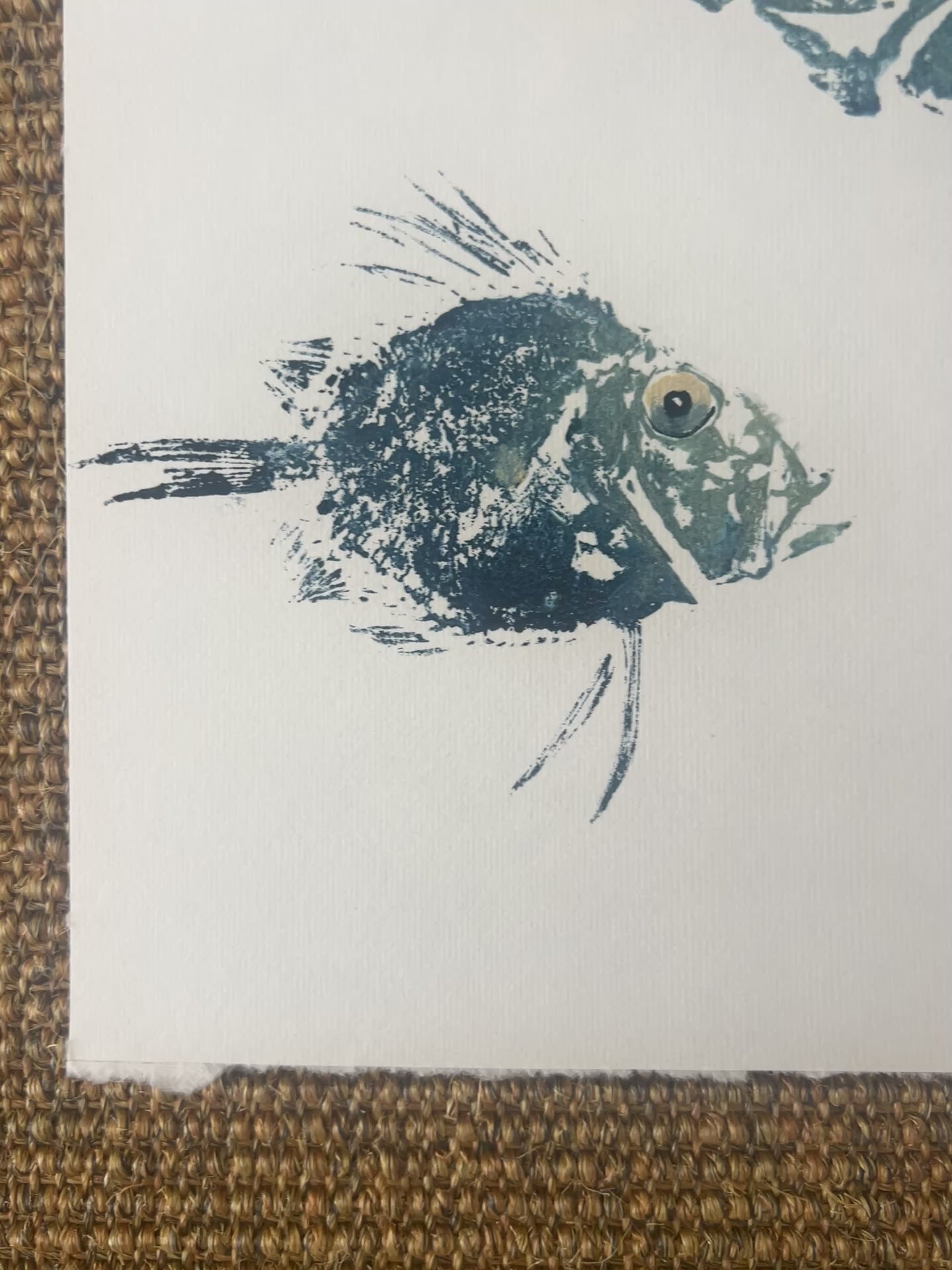 This A3 Gyotaku print features both an adult John Dory and a juvenile specimen, the smaller of which was a gifted scientific sample. Printed using lightfast, permanent blue and gold acrylic inks on Chinese Xuan paper, the composition offers a contemporary interpretation of the Gyotaku tradition — balancing scientific observation with expressive colour and modern presentation.