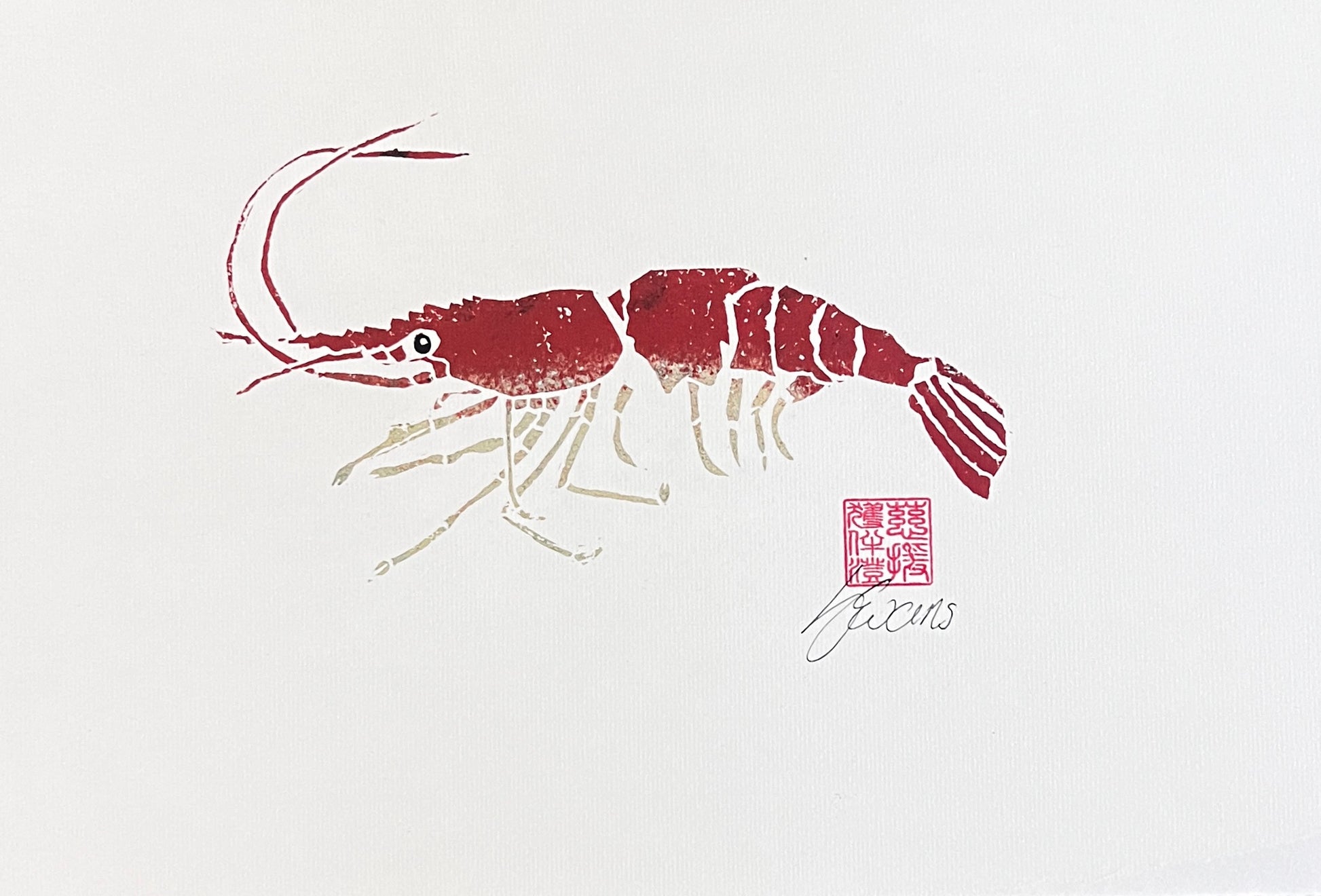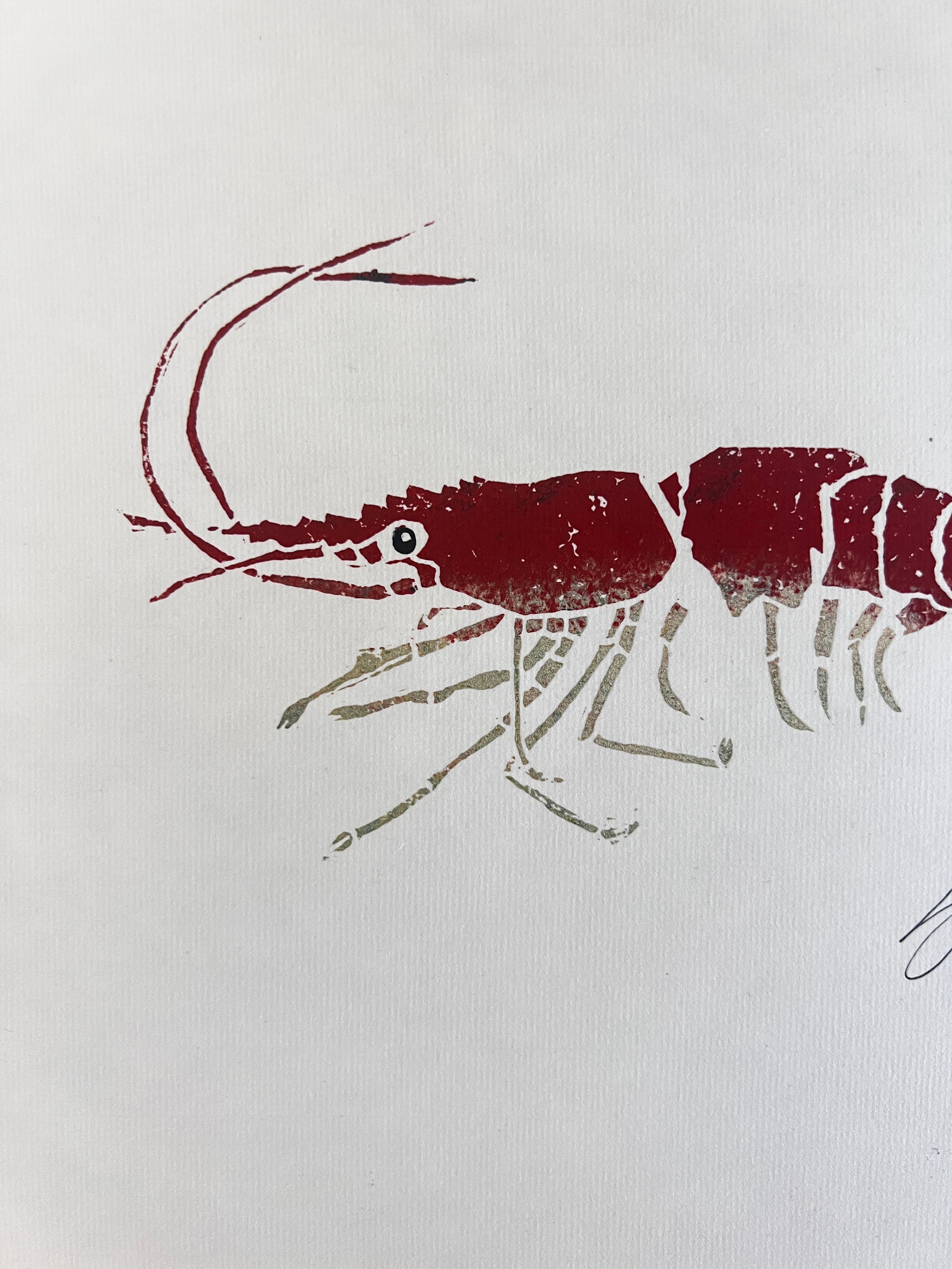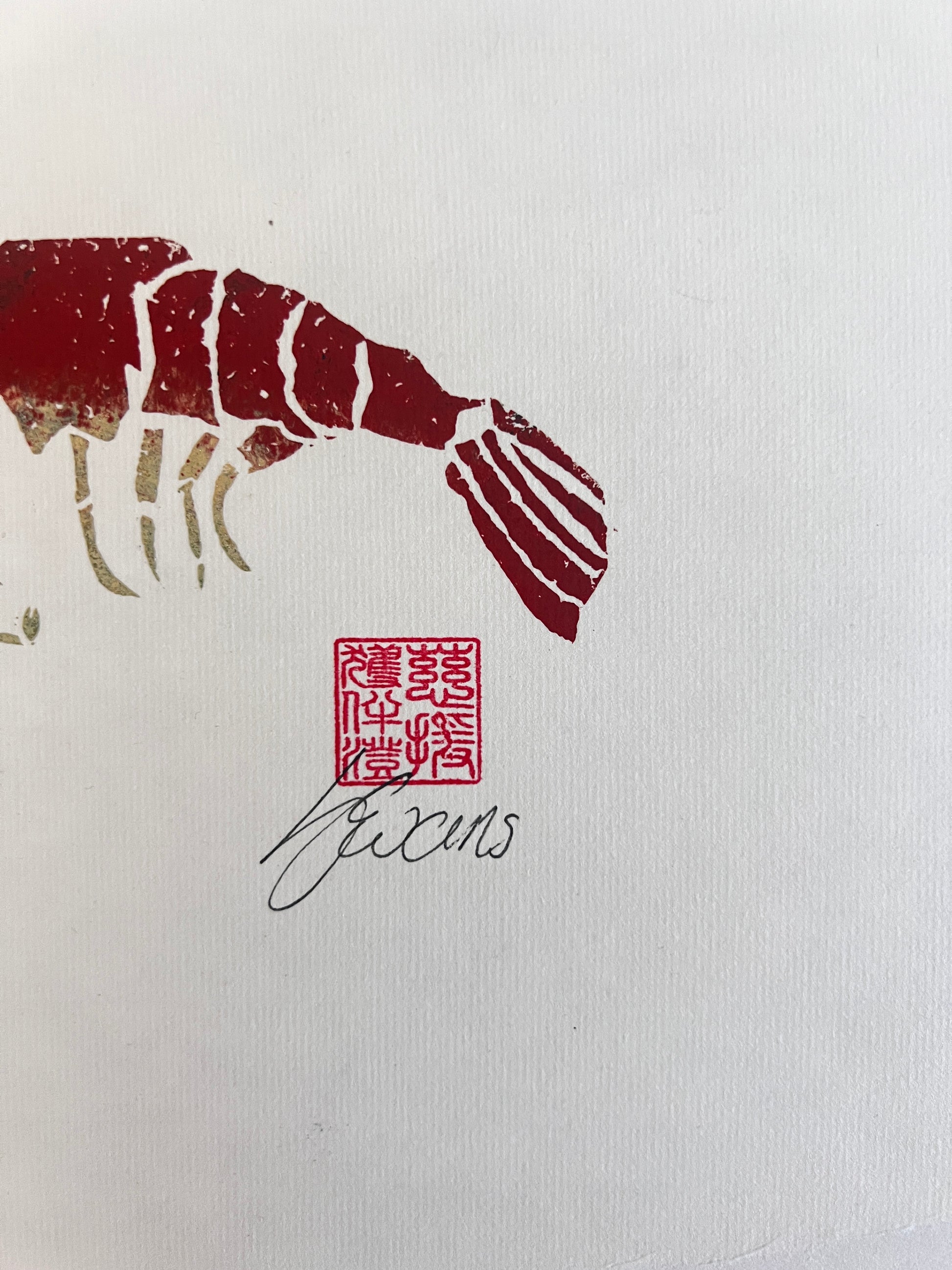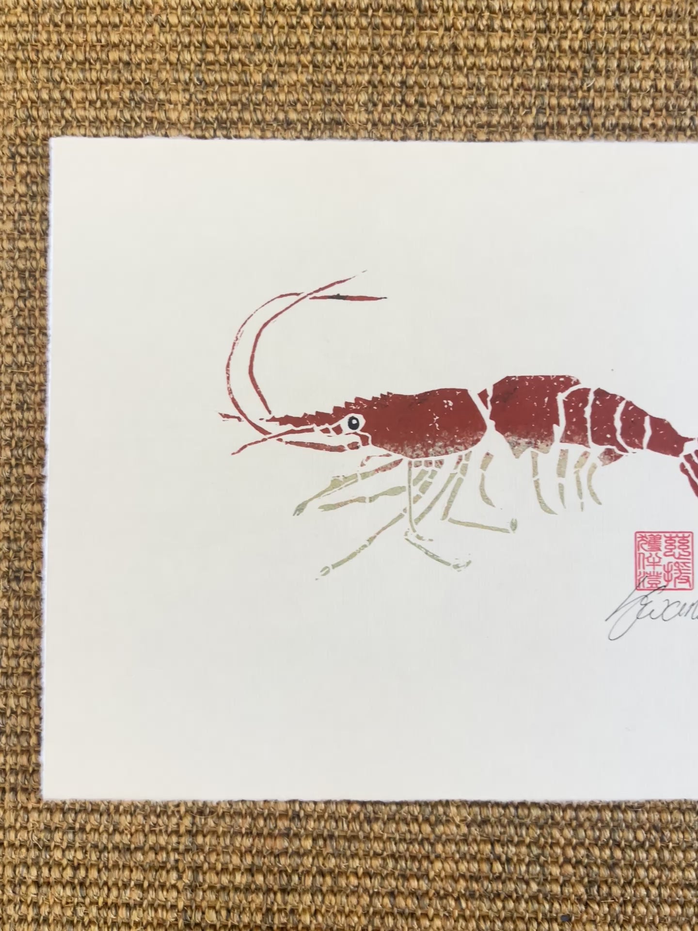 Printed onto delicate Chinese paper with high-quality acrylic inks, the piece faithfully honours the spirit of Gyotaku — the ancient Japanese art of nature printing. Just as a real fish would be inked and pressed to paper, Jane uses her lino cut prawn in the same way, transferring the form and detail in a single impression.