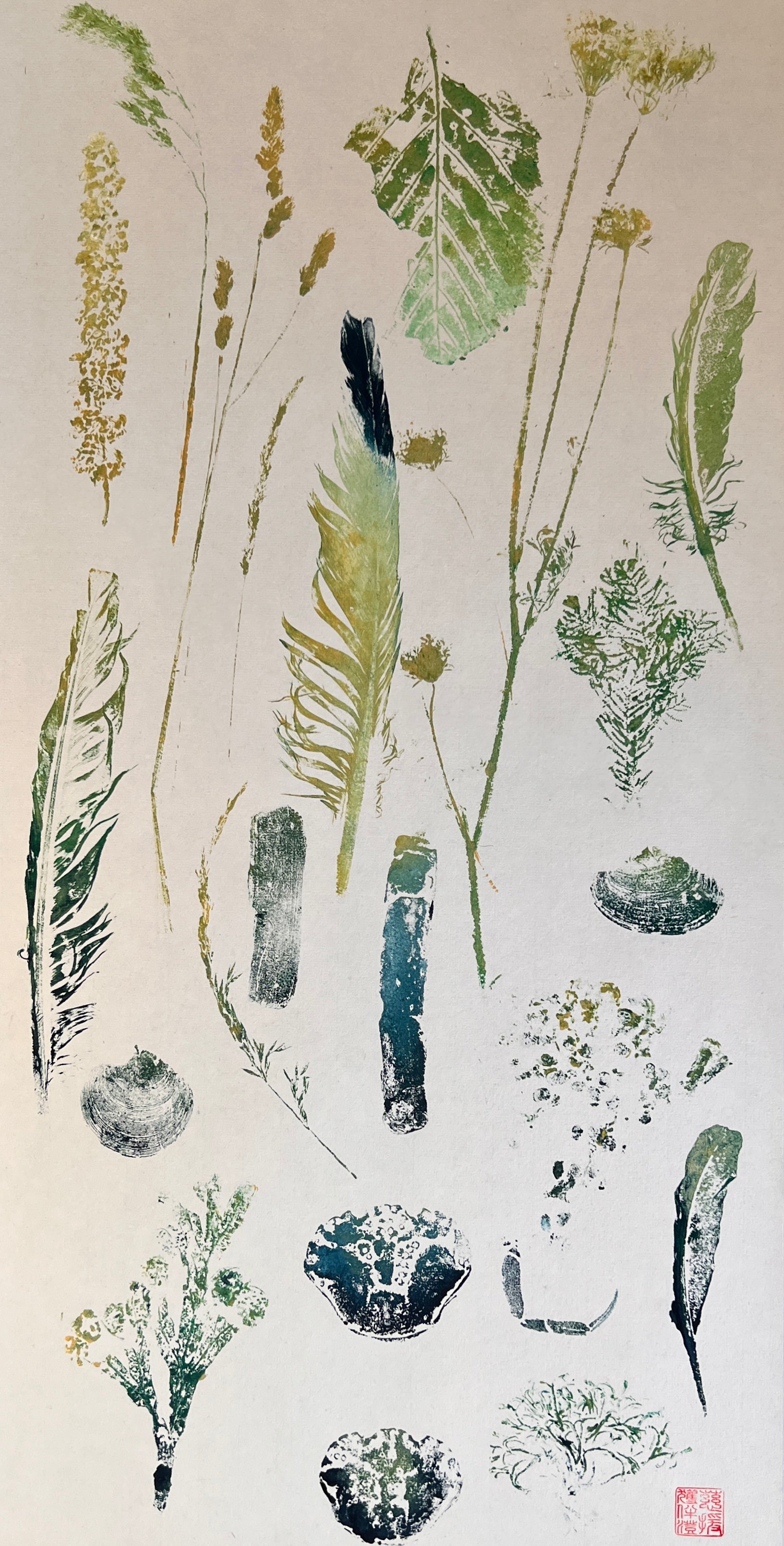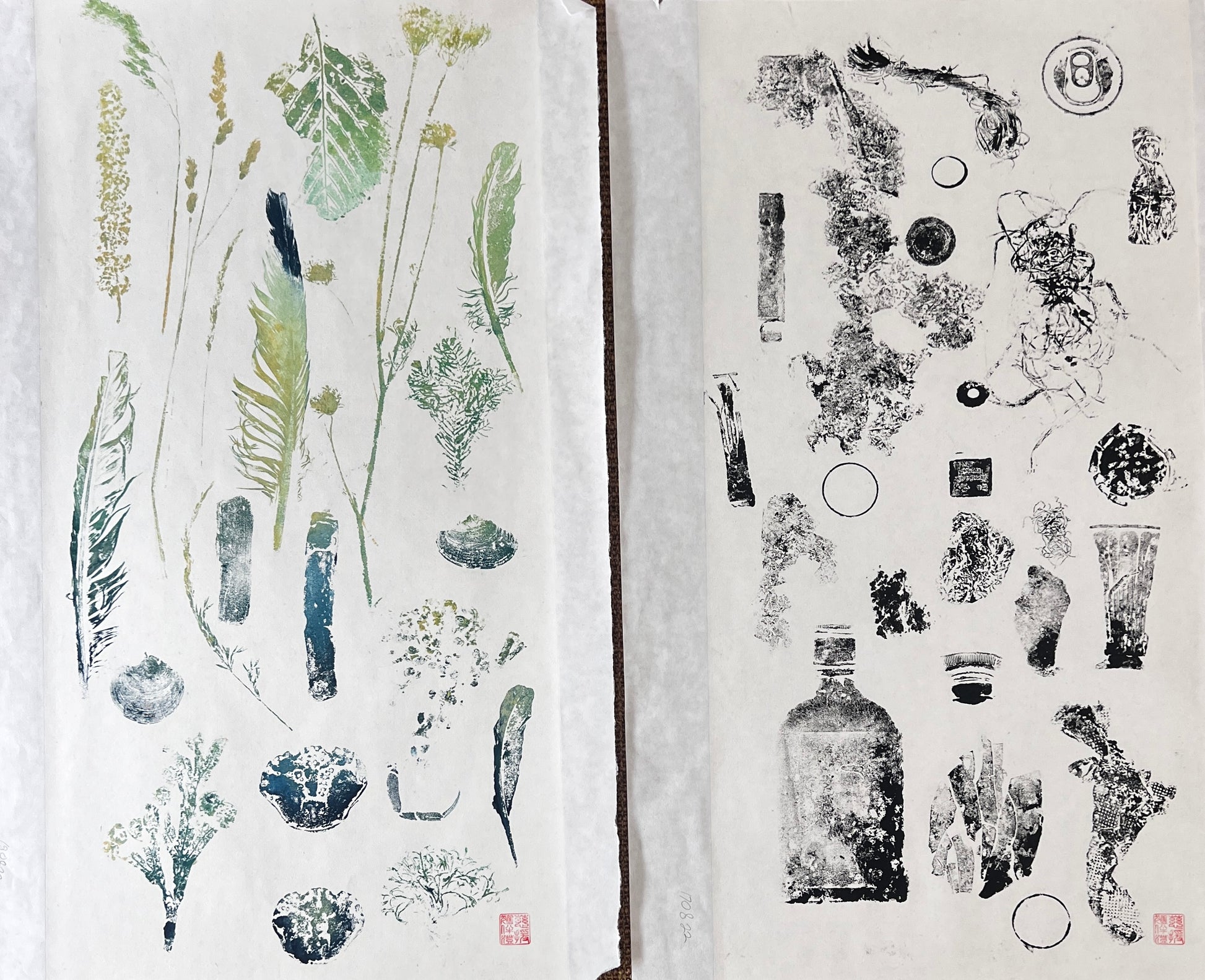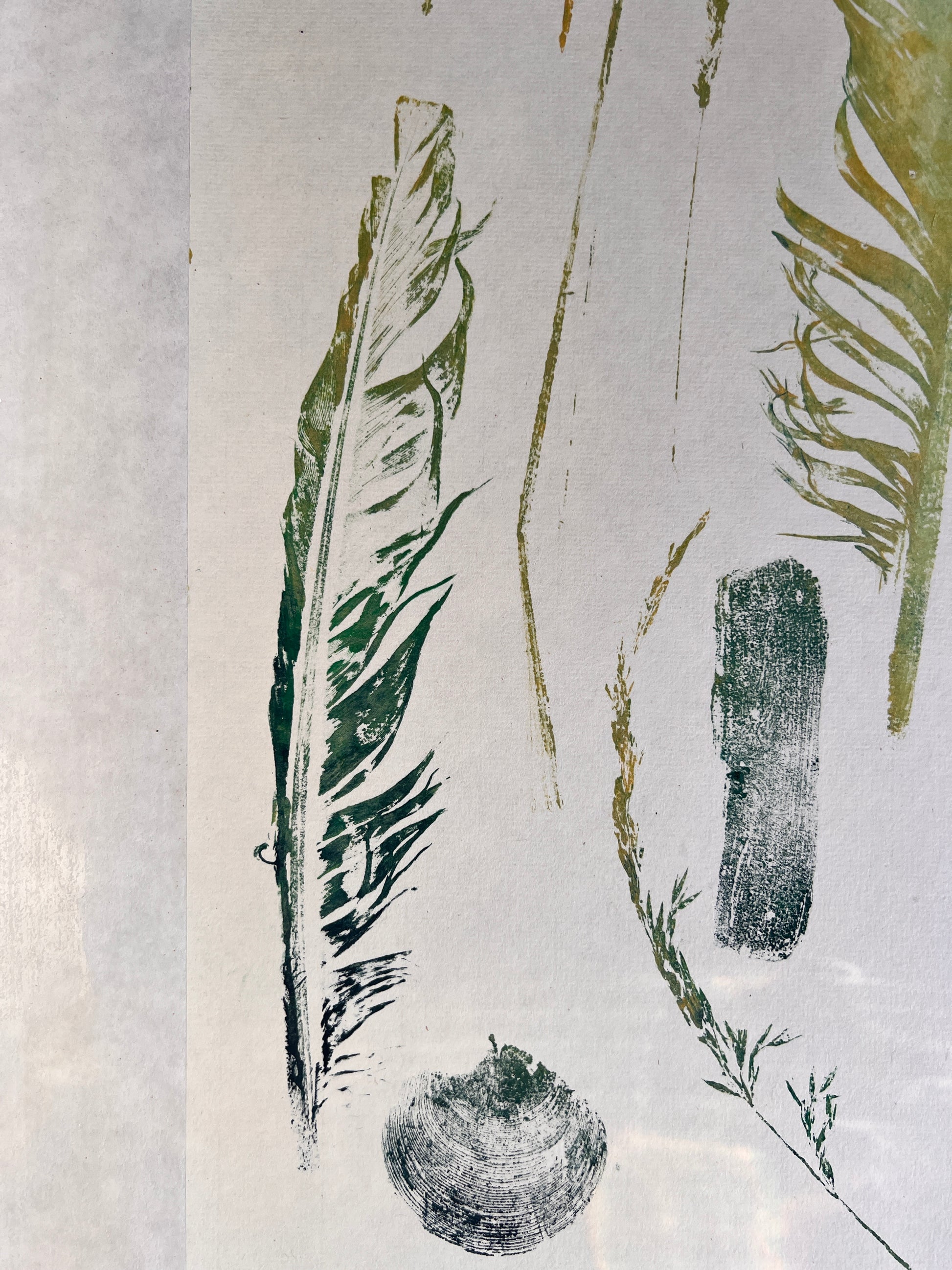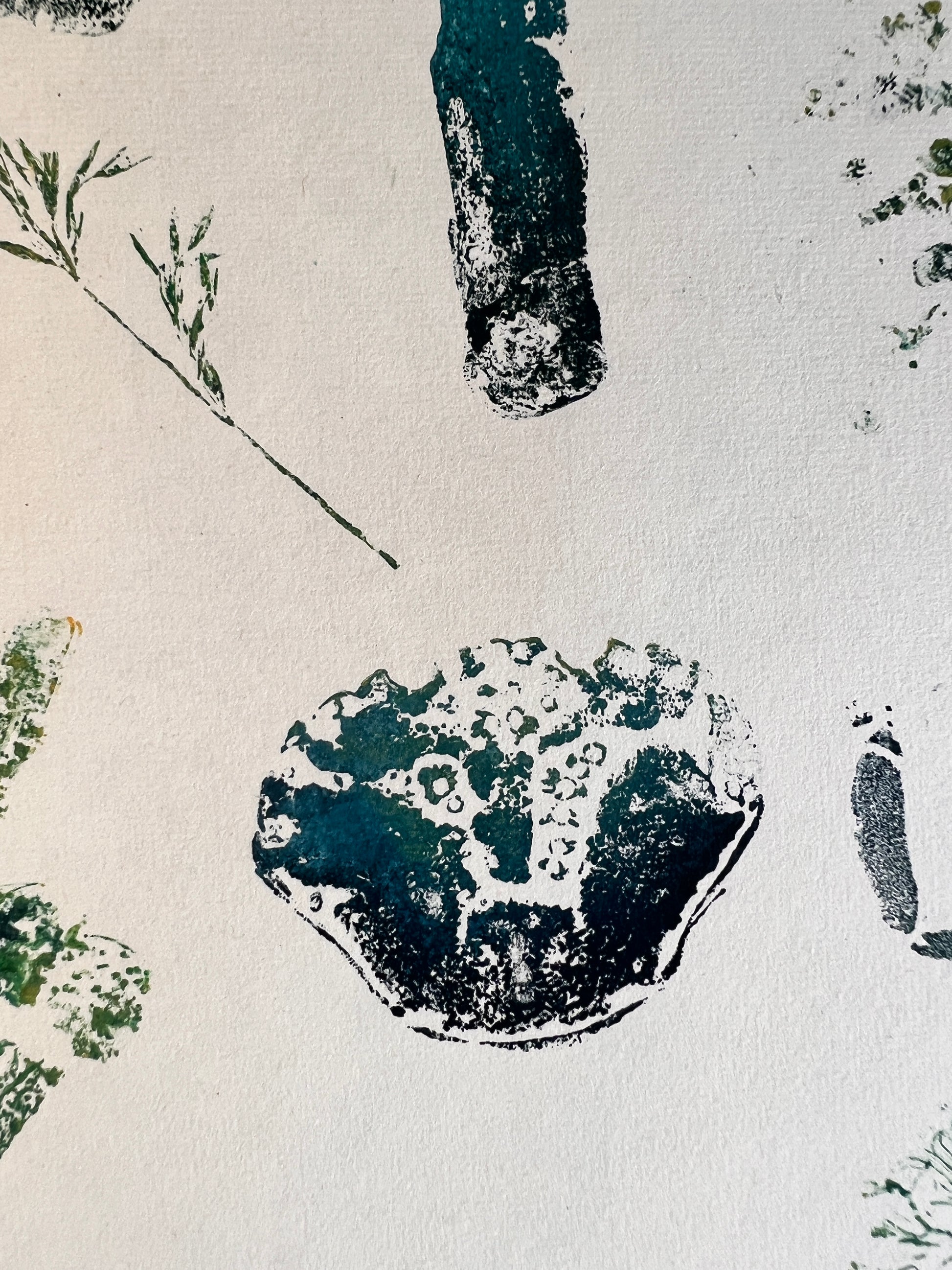 This striking two-panel gyotaku print captures a unique moment from a walk along Lleiniog Beach, telling a story through texture, contrast, and composition. One panel showcases organic finds—seaweed, shells, feathers—rendered in a rich blue and gold palette that evokes the beauty and fragility of the coastal environment. The second panel, in stark black, presents man-made debris collected on the same walk, a haunting counterpoint that speaks to the impact of human presence. Each panel, approximately 70 x 34.5 cm, has been printed and then flattened and strengthened using the traditional wet mounting technique. Created in my garden studio, this piece uses only light fast, permanent inks to ensure lasting vibrancy. Like all my gyotaku prints, it’s a one-of-a-kind artwork made directly from the found objects themselves, preserving their shapes and stories with honesty and care. This print invites quiet reflection on our relationship with nature—and what we choose to leave behind.