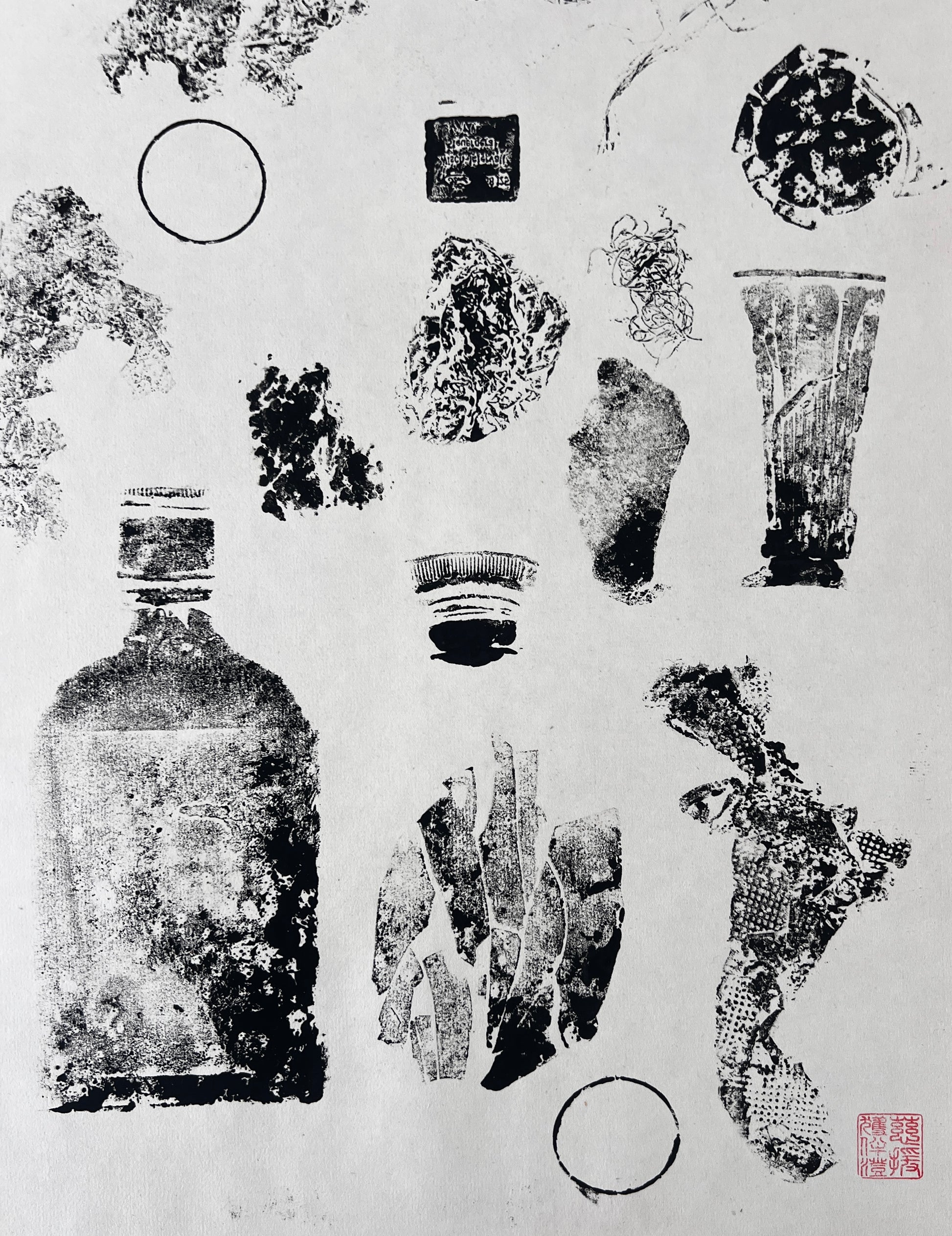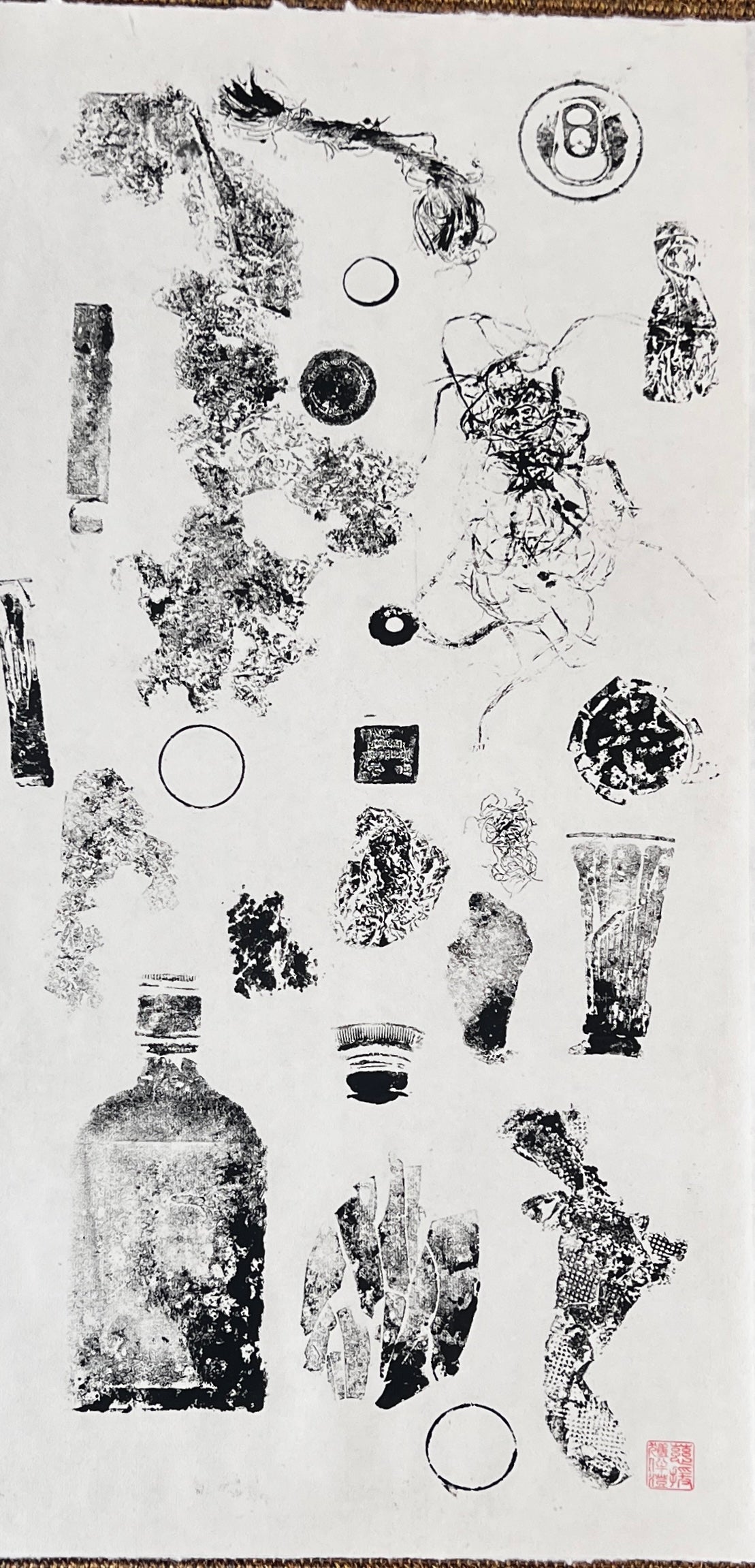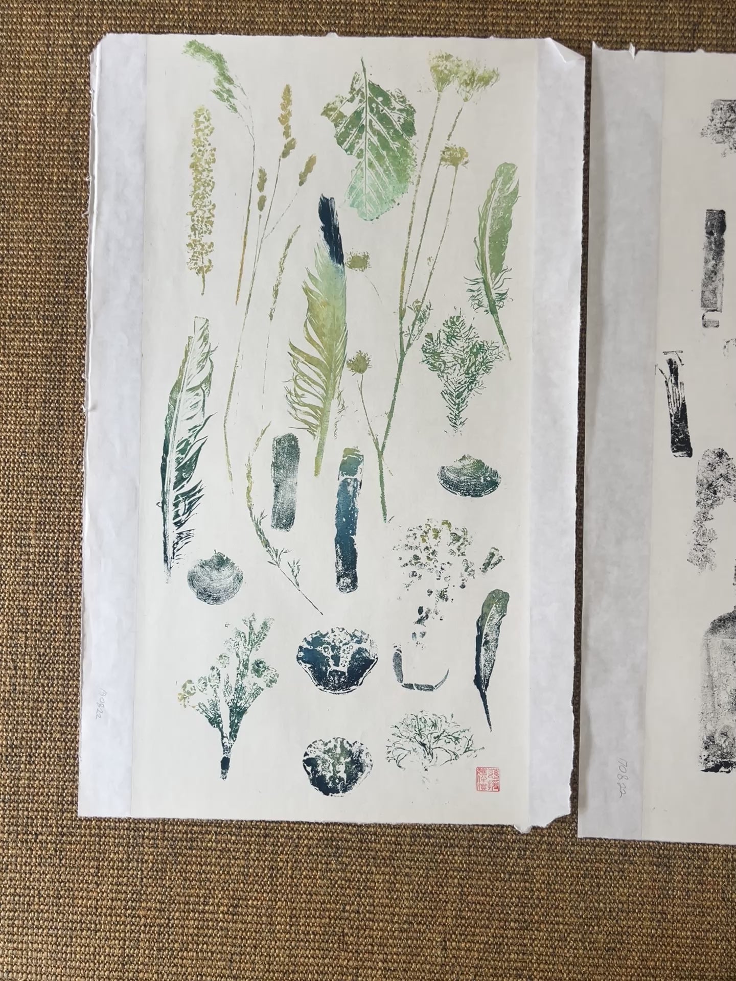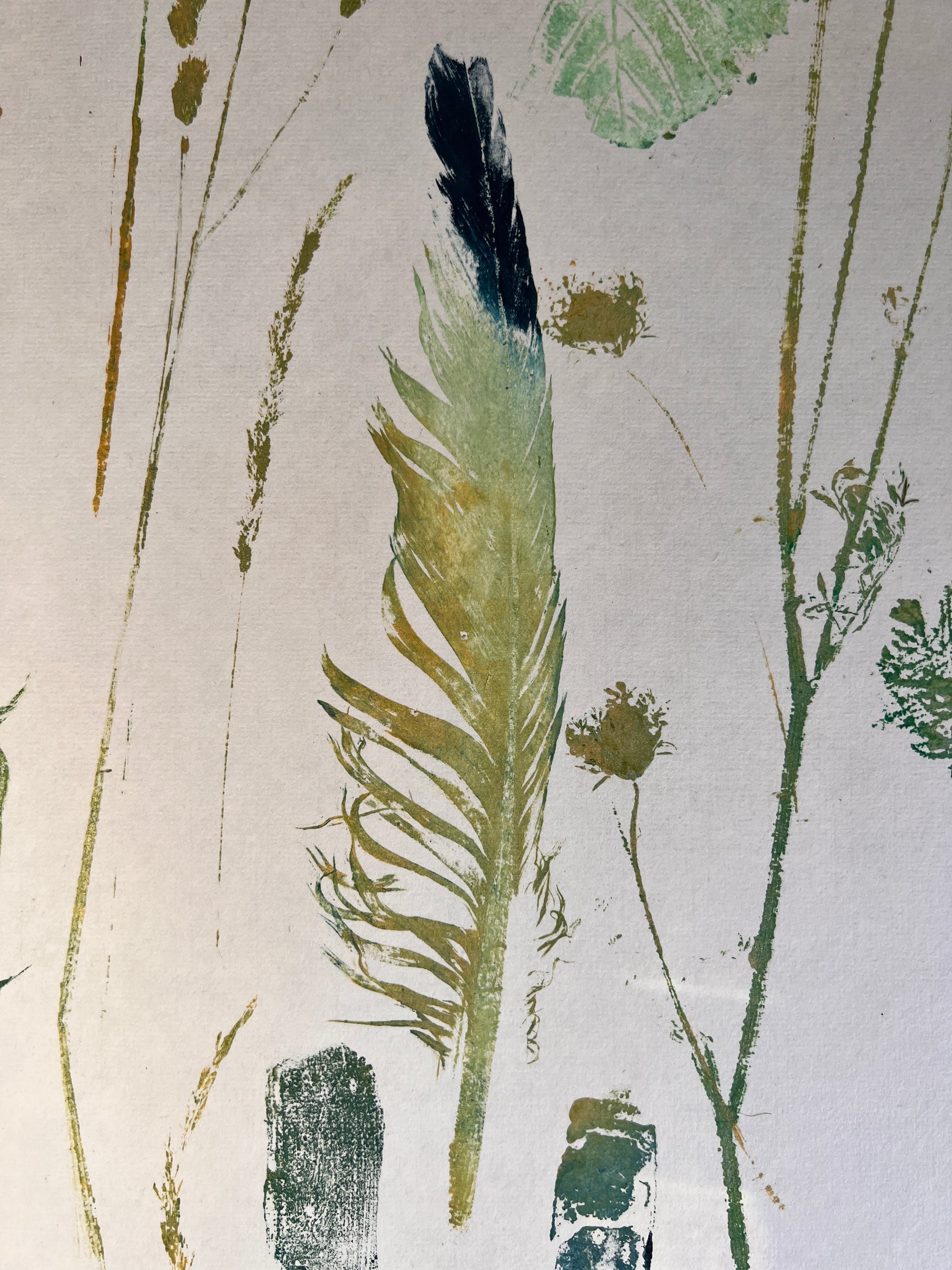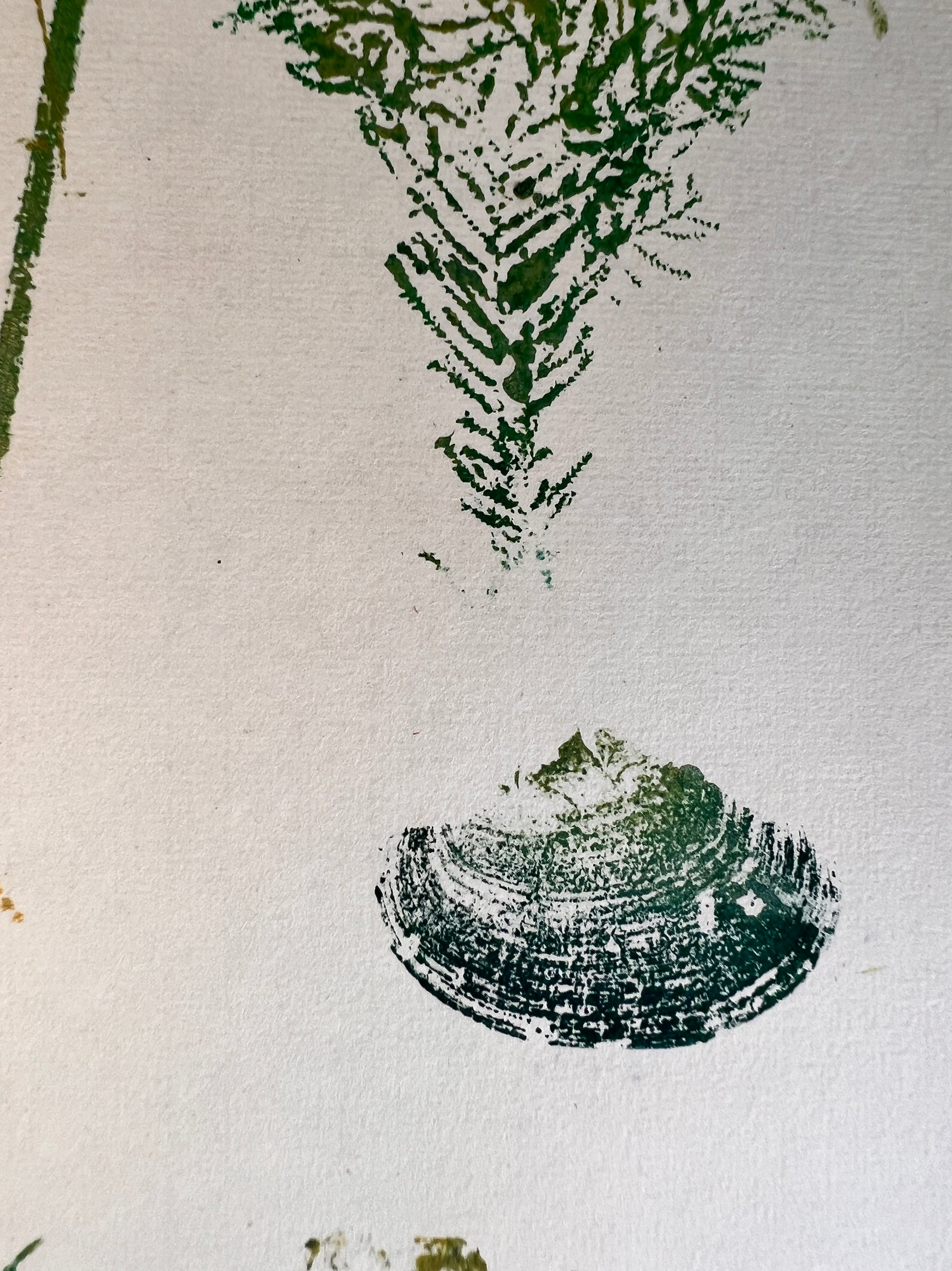 This striking two-panel gyotaku print captures a unique moment from a walk along Lleiniog Beach, telling a story through texture, contrast, and composition. One panel showcases organic finds—seaweed, shells, feathers—rendered in a rich blue and gold palette that evokes the beauty and fragility of the coastal environment. The second panel, in stark black, presents man-made debris collected on the same walk, a haunting counterpoint that speaks to the impact of human presence. Each panel, approximately 70 x 34.5 cm, has been printed and then flattened and strengthened using the traditional wet mounting technique. Created in my garden studio, this piece uses only light fast, permanent inks to ensure lasting vibrancy. Like all my gyotaku prints, it’s a one-of-a-kind artwork made directly from the found objects themselves, preserving their shapes and stories with honesty and care. This print invites quiet reflection on our relationship with nature—and what we choose to leave behind.