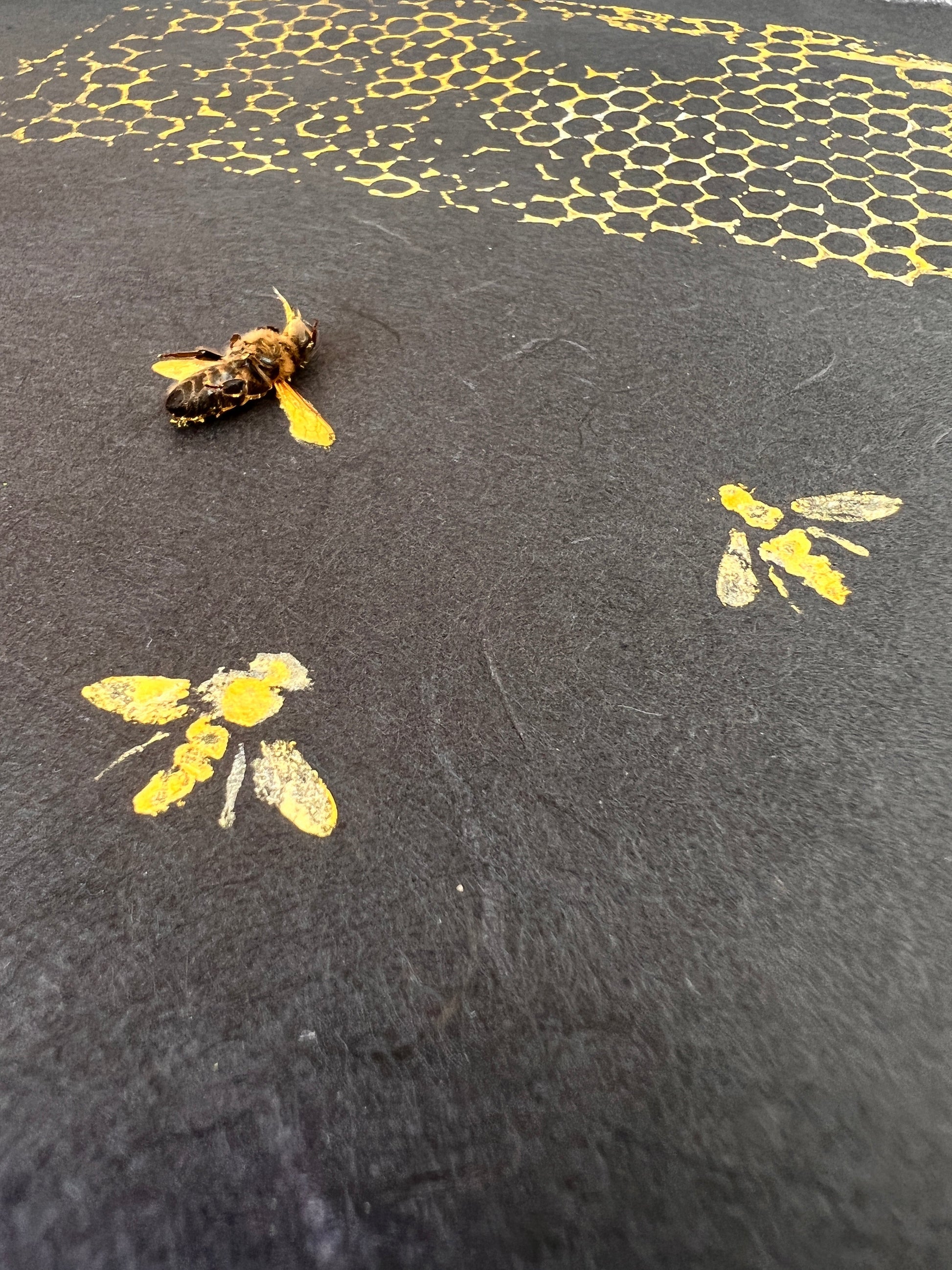 I've printed these bees with a section of their honeycomb on Thai Mulberry paper measuring around 20x20cm. Once the print is dry, it's wet mounted using the traditional Japanese method of a flour paste. The print is then left for around 24 hours to dry out.