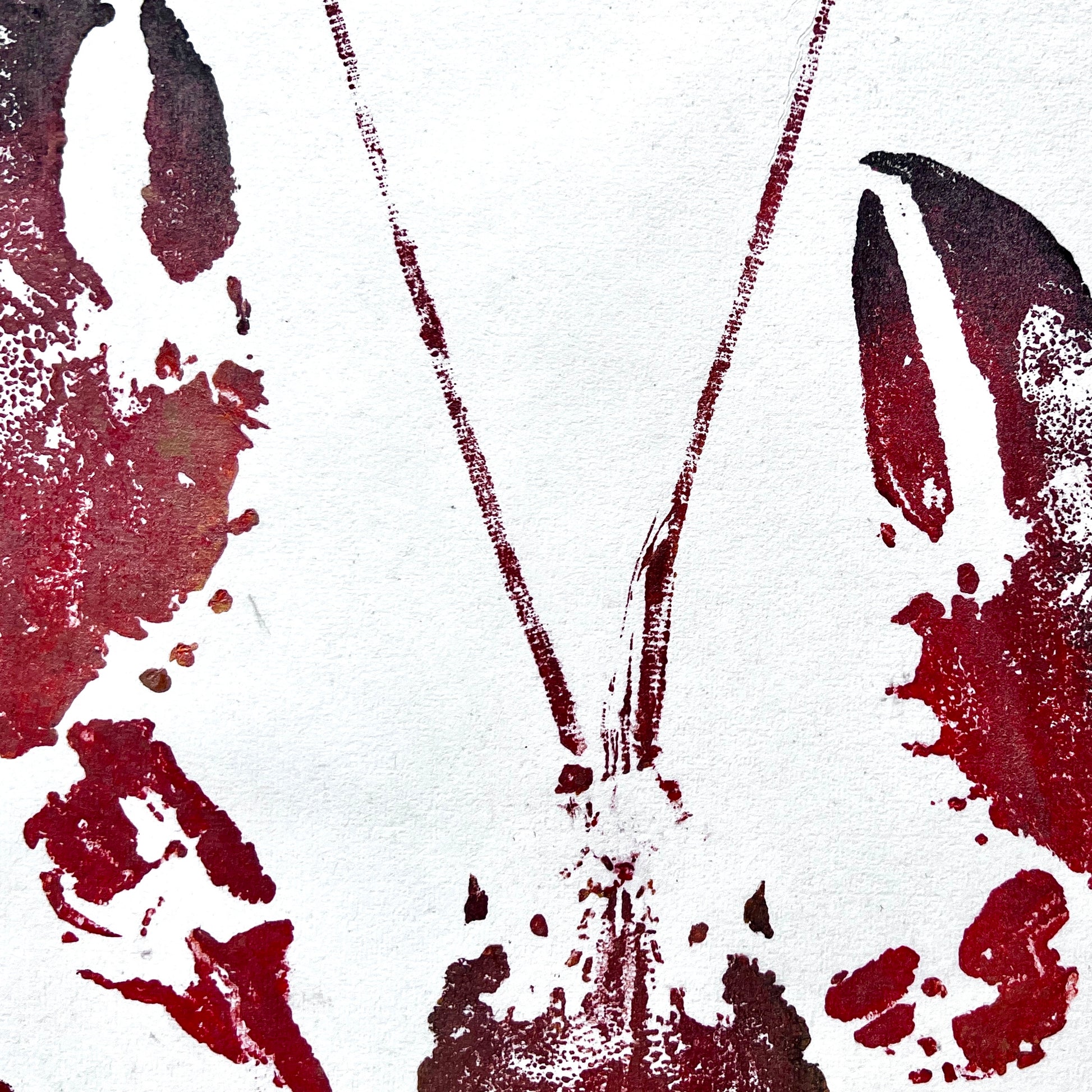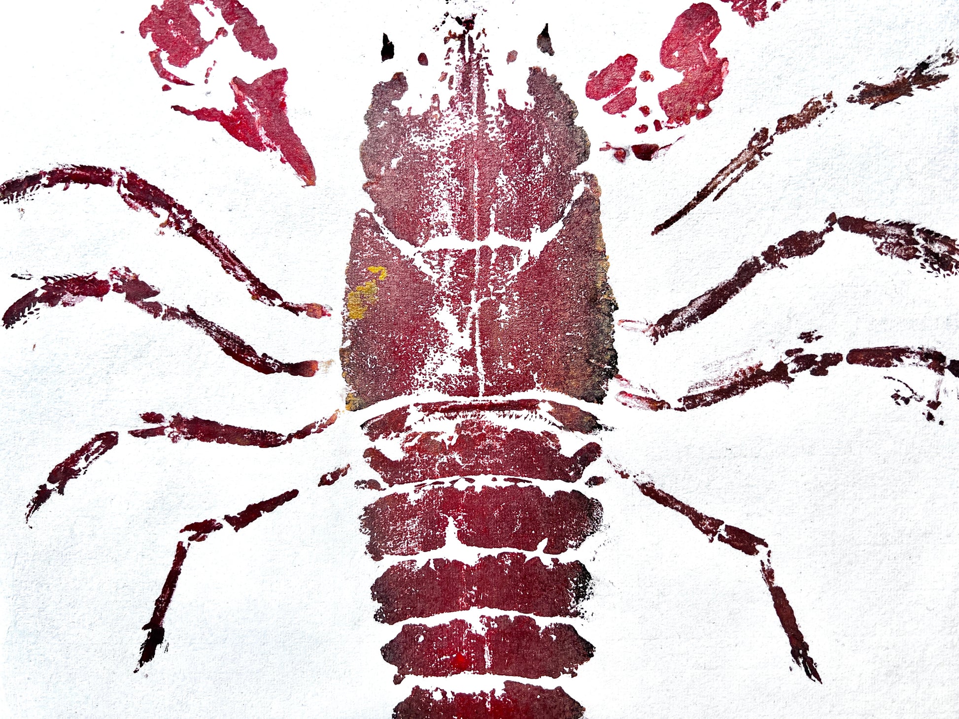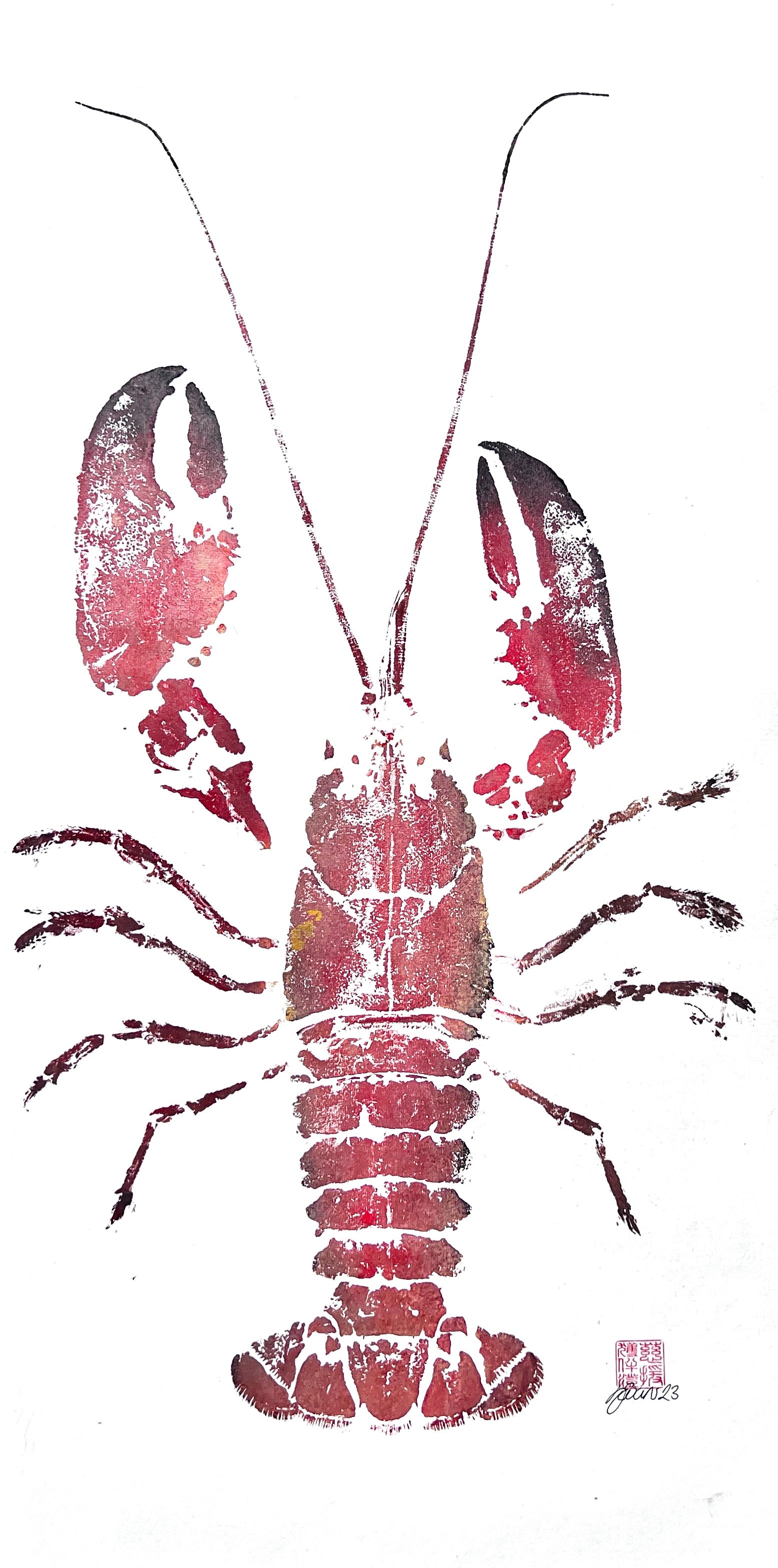 Lobster are a challenge to print as they are so 3 dimensional. Its very tricky printing the legs and their antenna. This lobster is printed on Chinese mulberry paper measuring 69.5x34cm. It will be supplied flat and in a white mount which brings the overall measurements to 42.5cm x 77.5cm. I’ve used a high quality screen printing ink that is both light fast and permanent. Each print I make is unique as I apply fresh ink before each print is taken and all prints are hand pressed.
