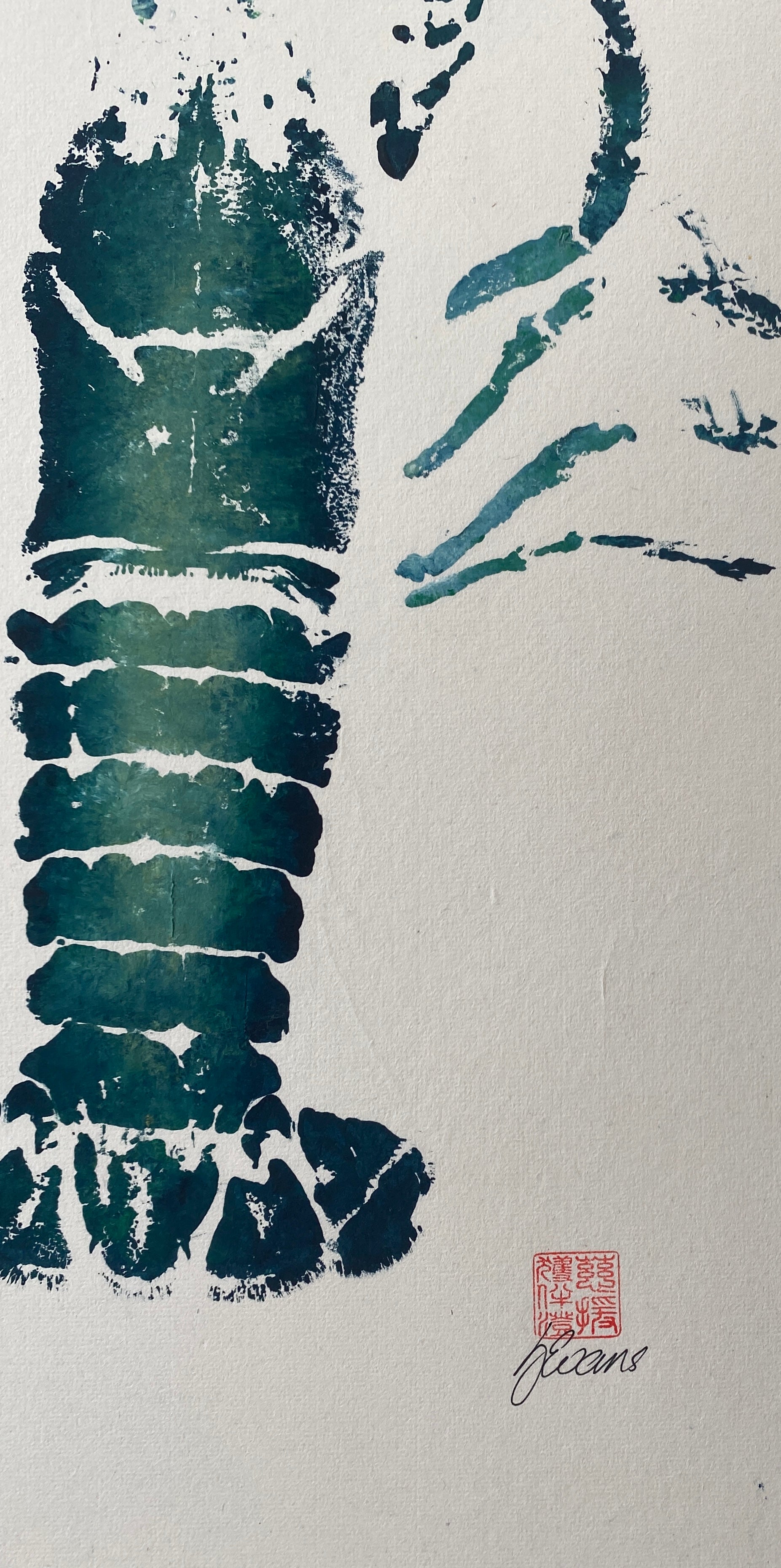 Lobster are a challenge to print as they are so 3 dimensional. Its very tricky printing the legs and their antenna. This lobster is printed on Chinese mulberry paper measuring 69.5x34cm.