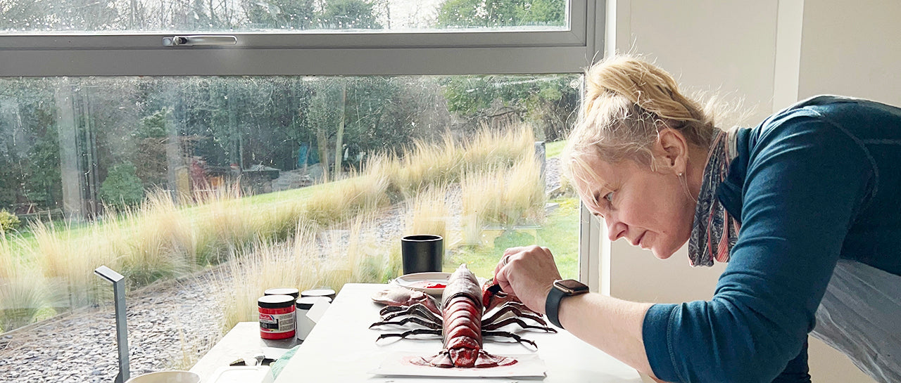 This lobster was caught in a pot by a local fisherman here in North Wales.  It was caught in the Menai Strait.  The lobster is such a great subject for a coastal artist like myself.  Working with local marine species is always my preferred way of working.