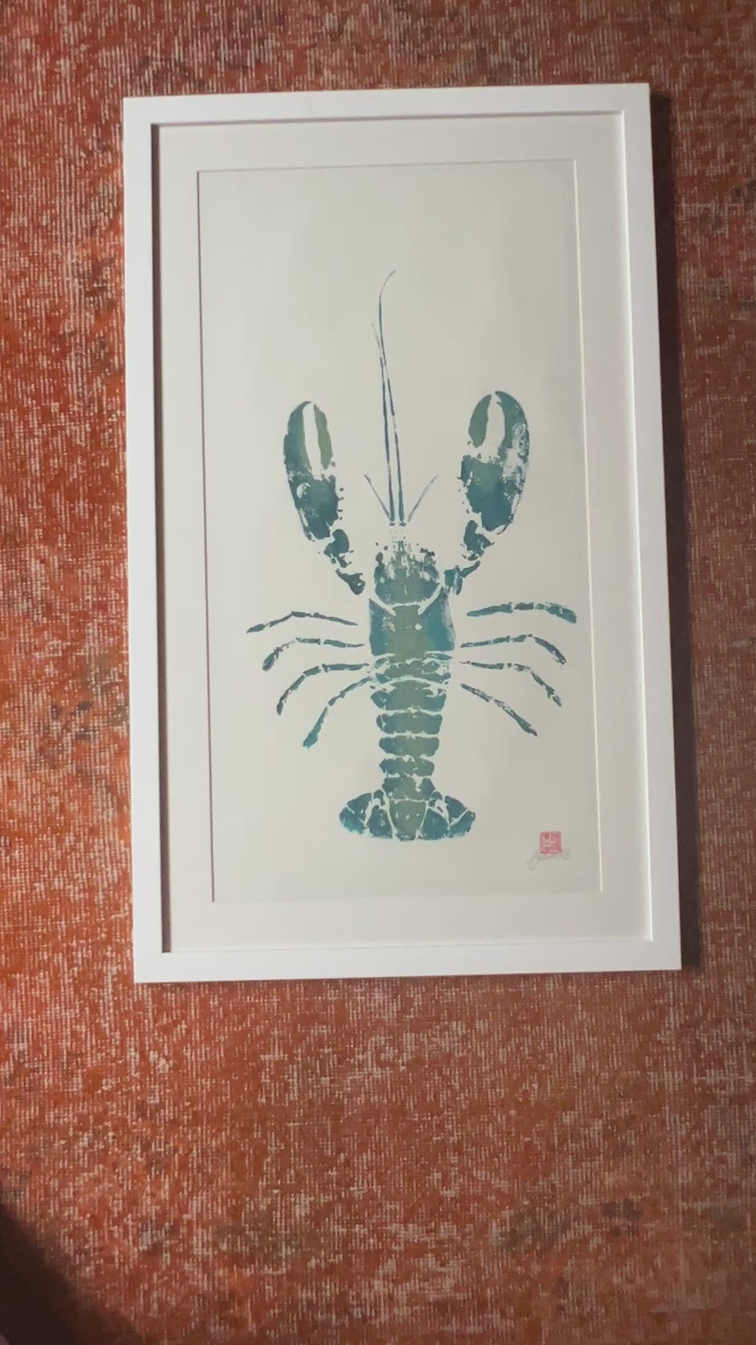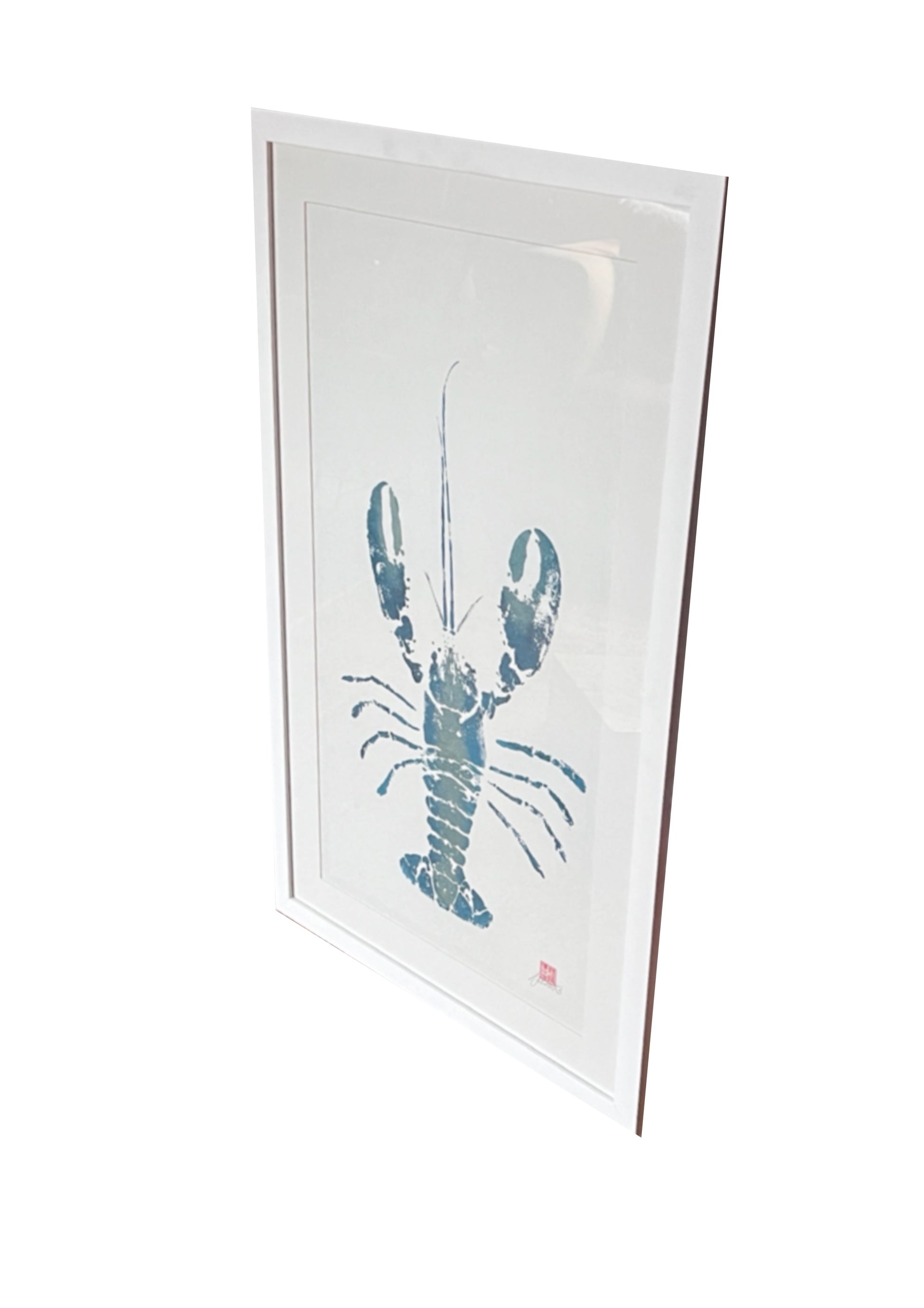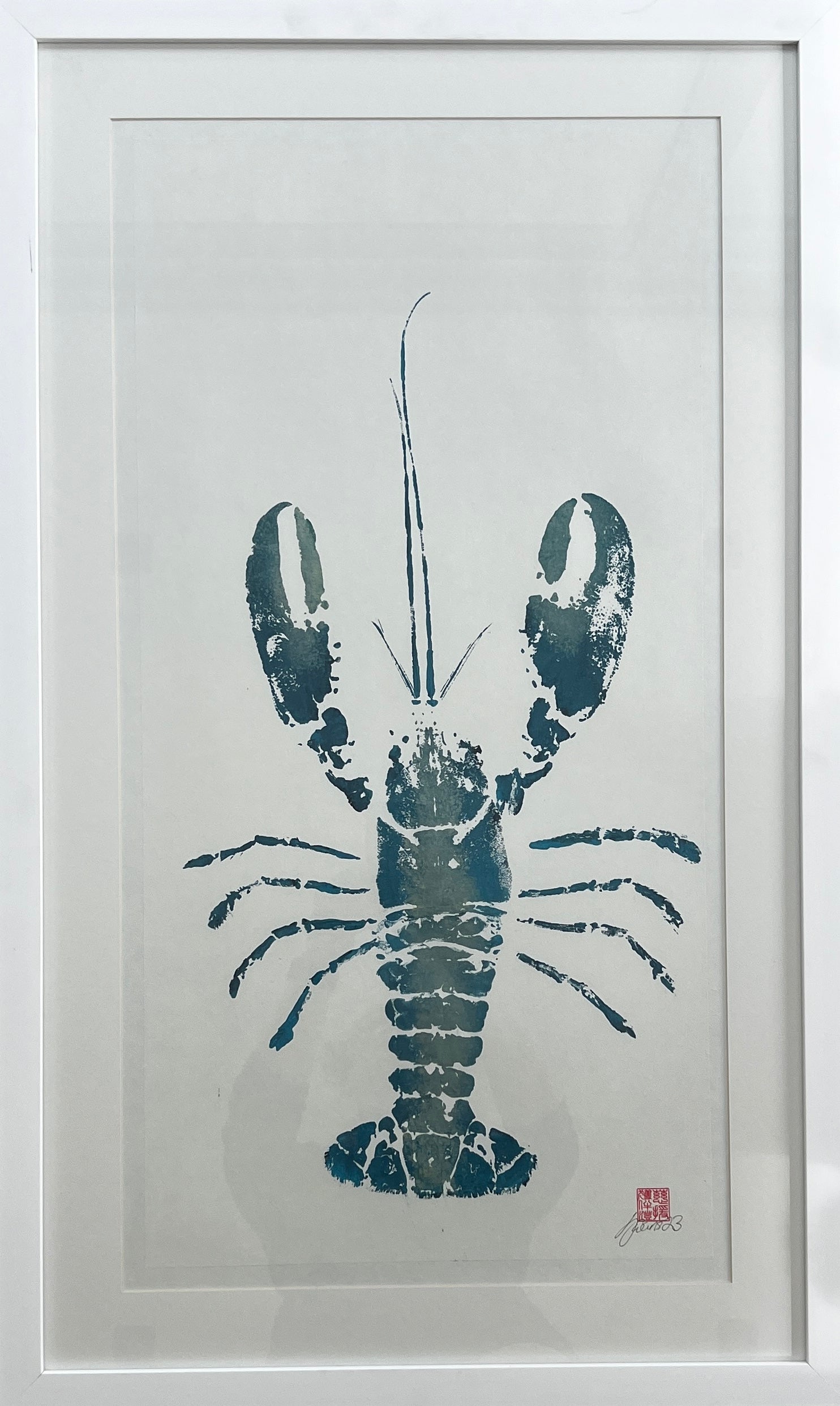 Lobster are a challenge to print as they are so 3 dimensional. Its very tricky printing the legs and their antenna. This lobster is printed on Chinese mulberry paper measuring 69.5x34cm. I’ve used a high quality screen printing ink that is both light fast and permanent. Each print I make is unique as I apply fresh ink before each print is taken and all prints are hand pressed.