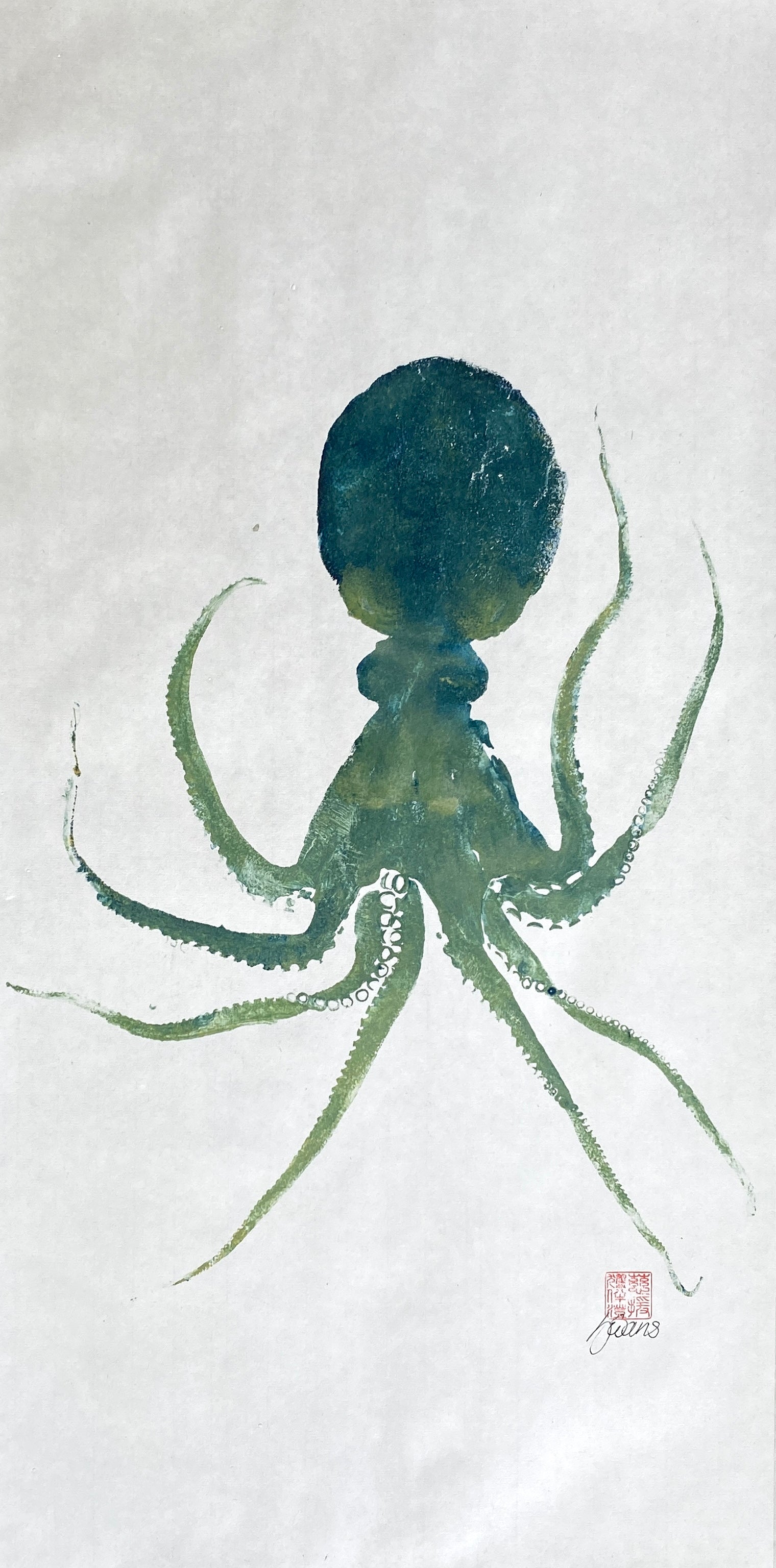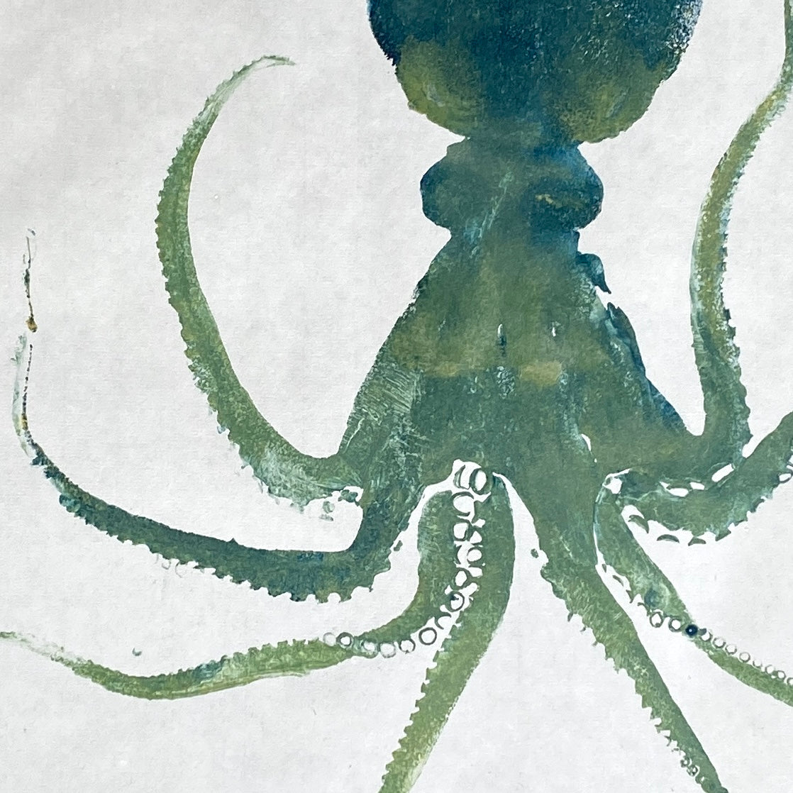 The octopus is printed on to Chinese mulberry based paper which measures 69.5x34cm.  It has then been wet mounted using the traditional Japanese method.  This uses a flour and water paste and requires a drying period of around 24 hours.