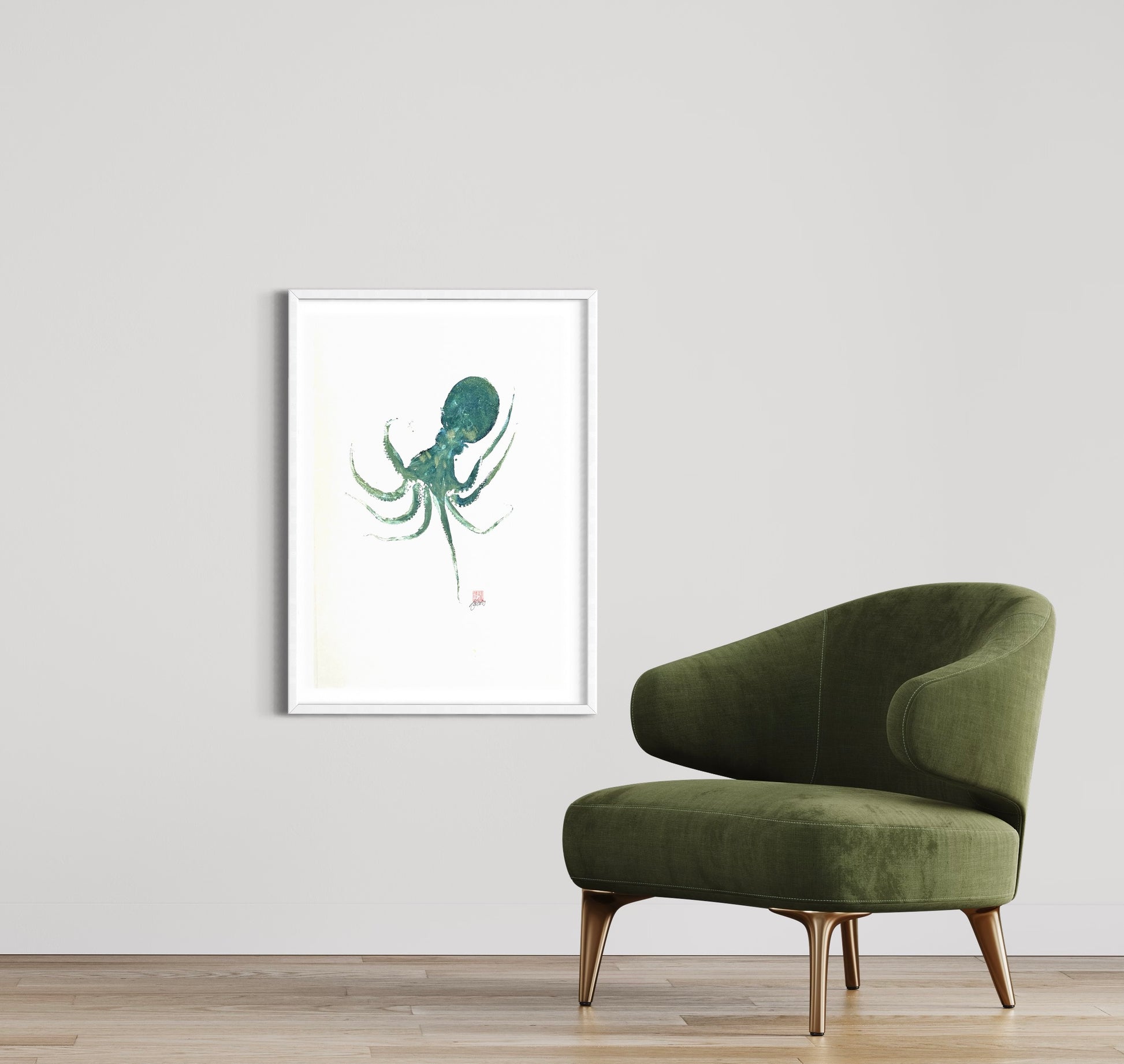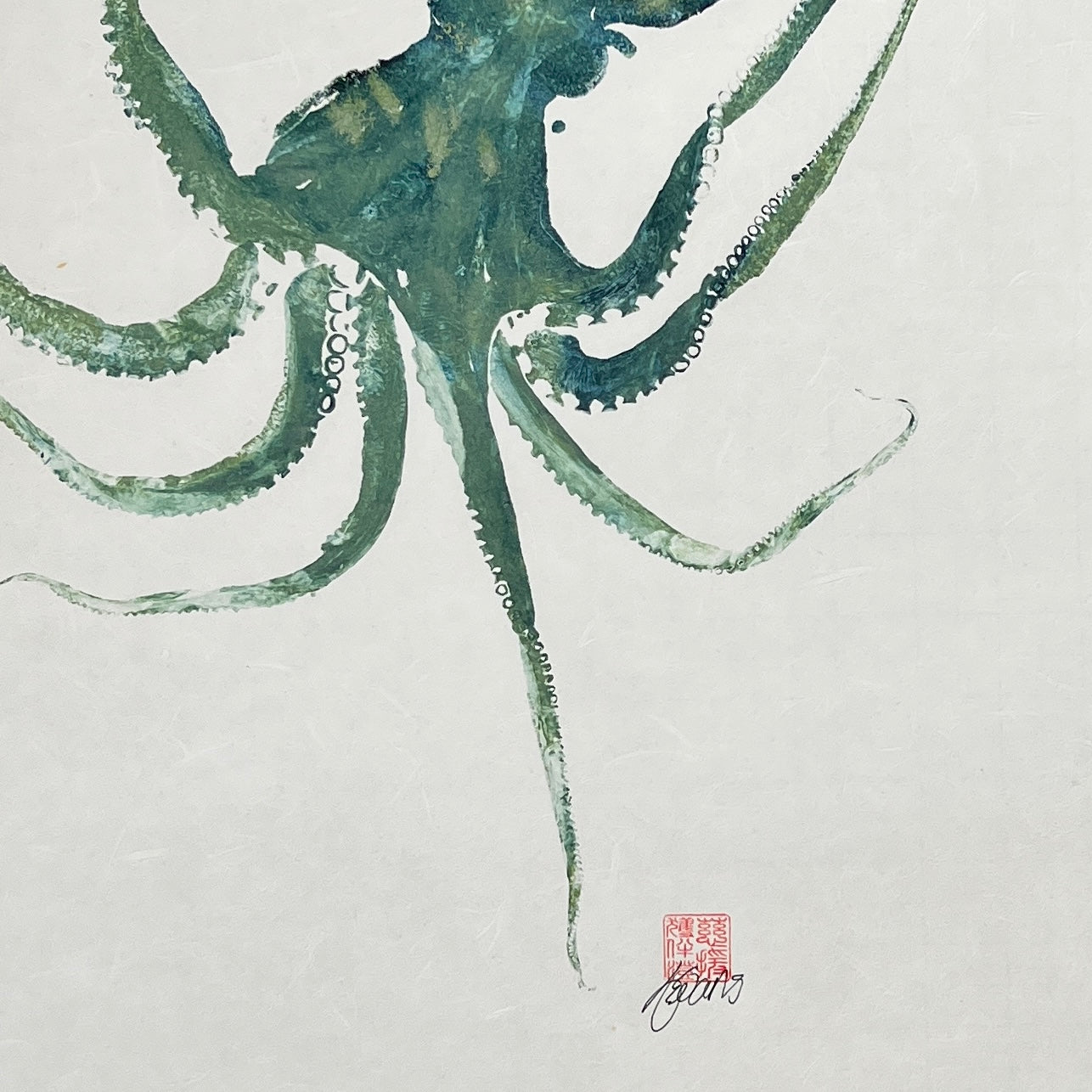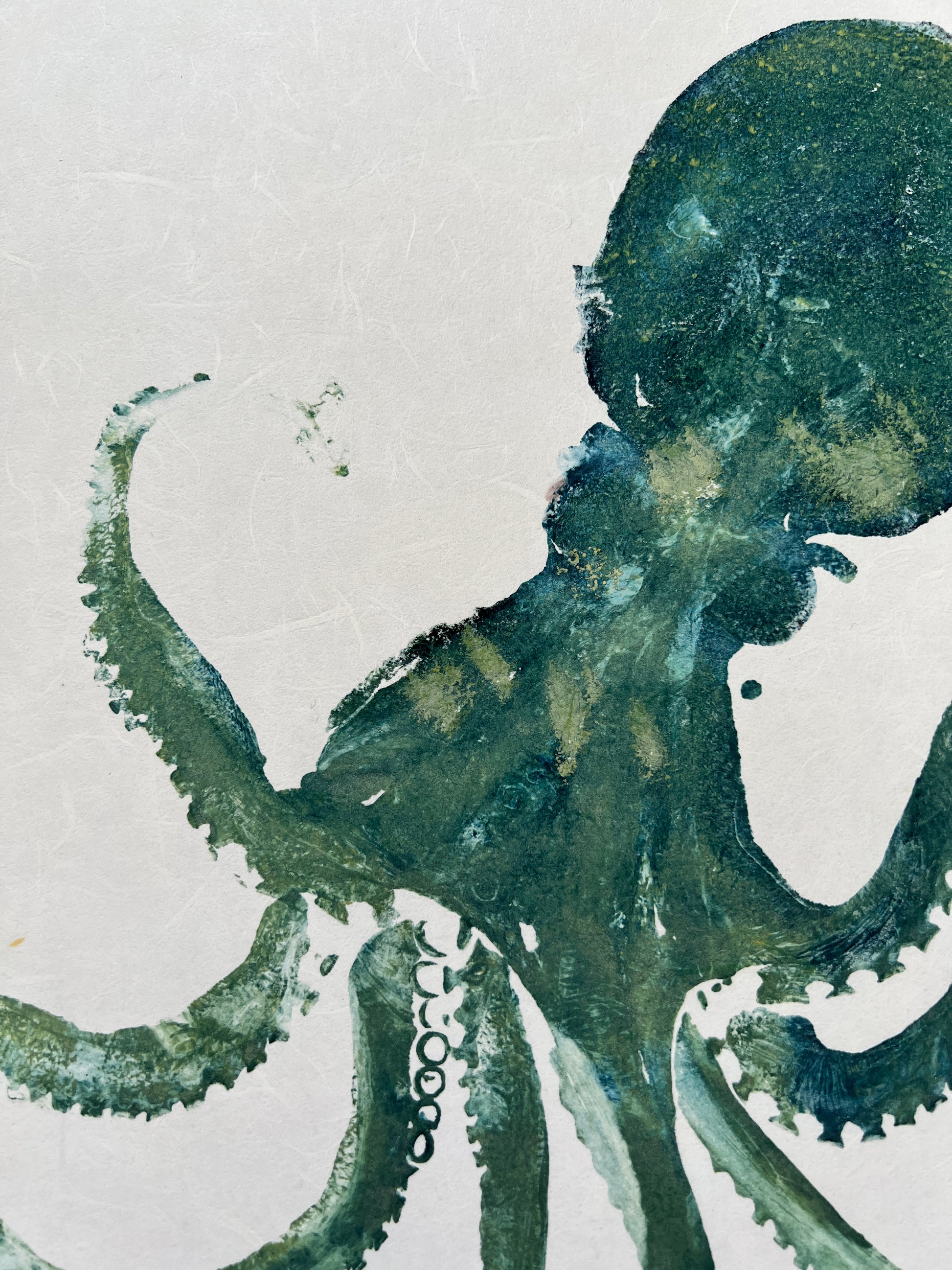 The octopus is printed on to Thai mulberry based paper which measures 76x51cm. It has then been wet mounted using the traditional Japanese method. This uses a flour and water paste and requires a drying period of around 24 hours.