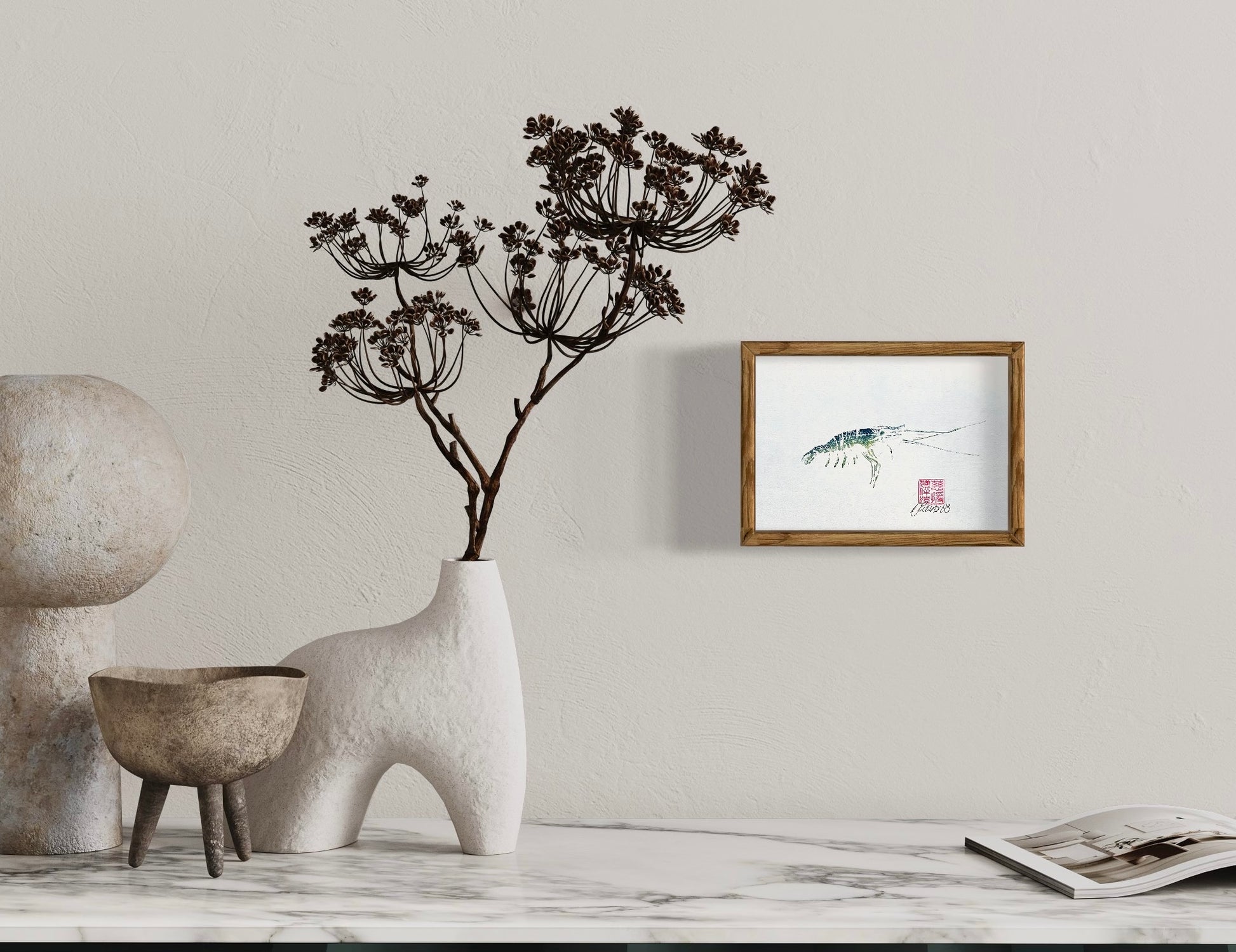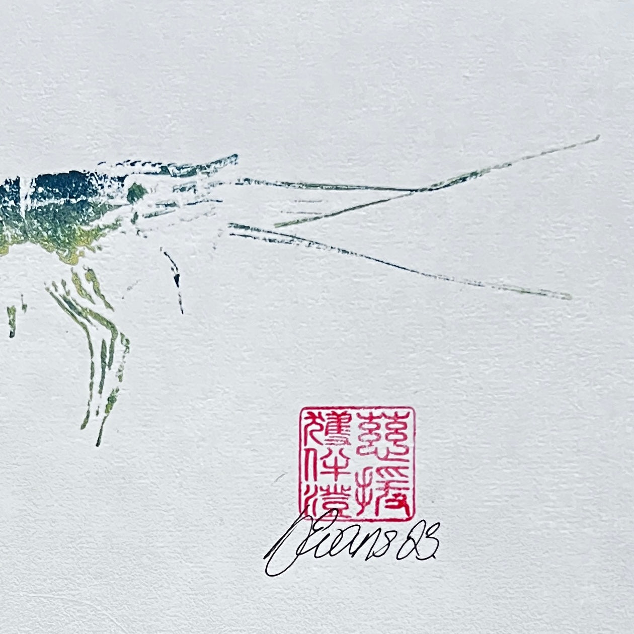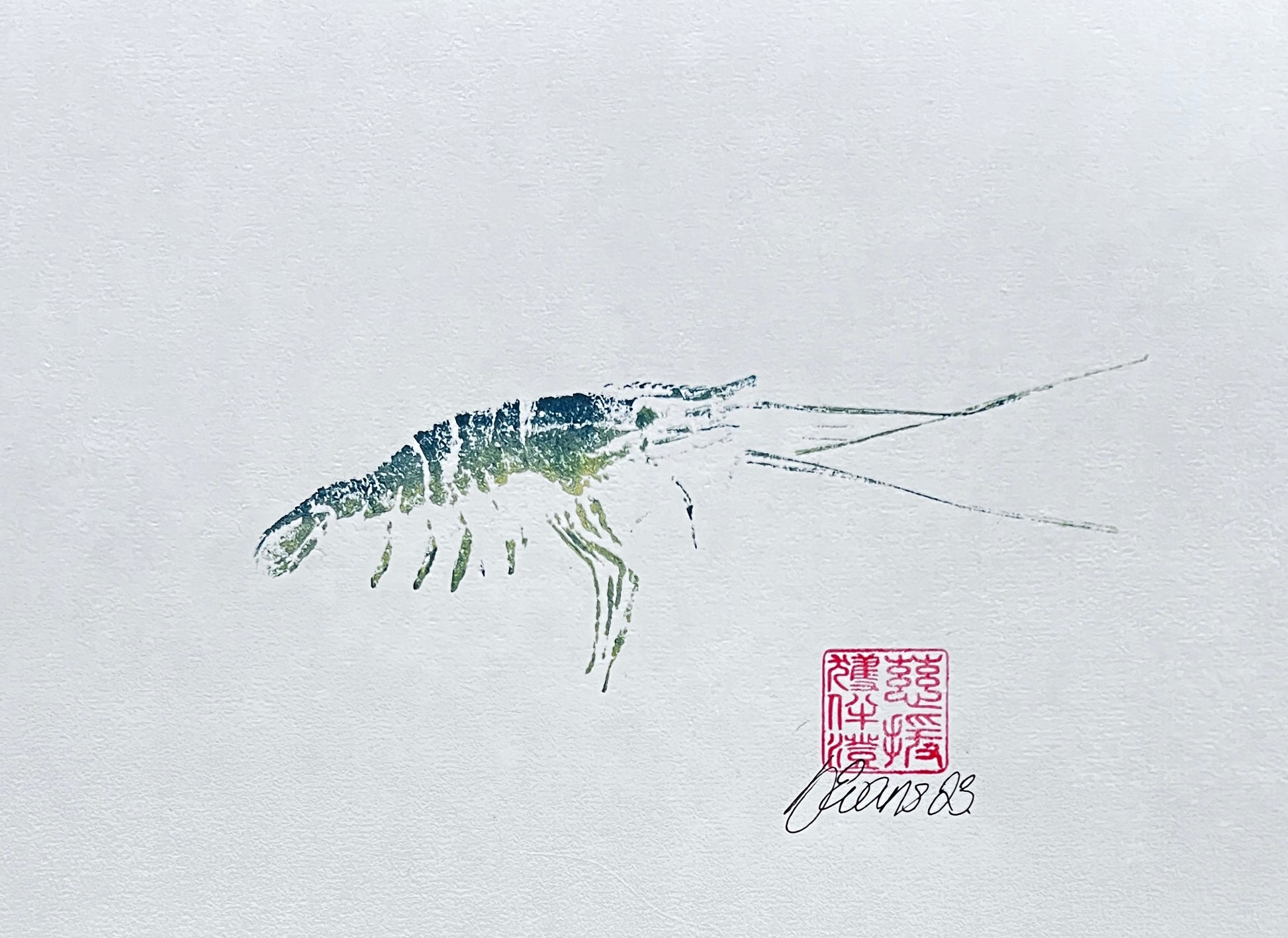 I've printed this on an A5 sheet of Chinese calligraphy paper using and dark blue and gold ink.  It takes a long time to prepare and ink a prawn and then position it ready to print.  So although it's a small print, a lot of work goes into it.