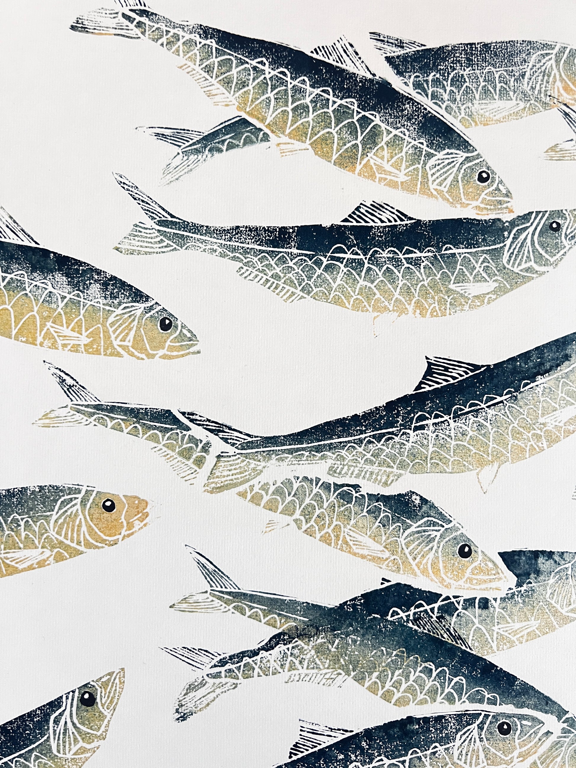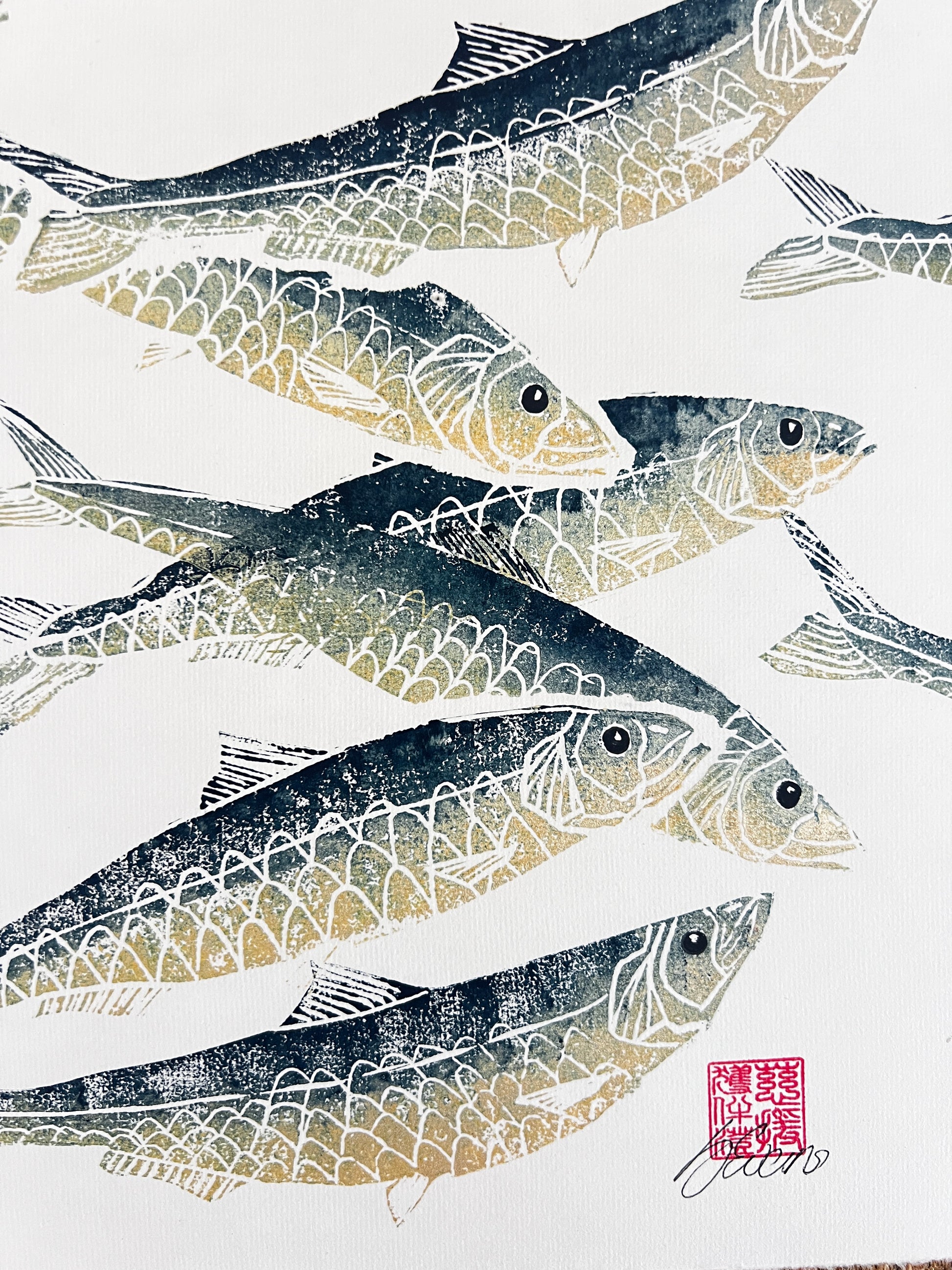All my prints are unique as the fish are printed by hand and placed individually.  A certificate is provide with each unique artwork.  I've used a high quality blue and gold acrylic ink for this print that is both light fast and permanent.