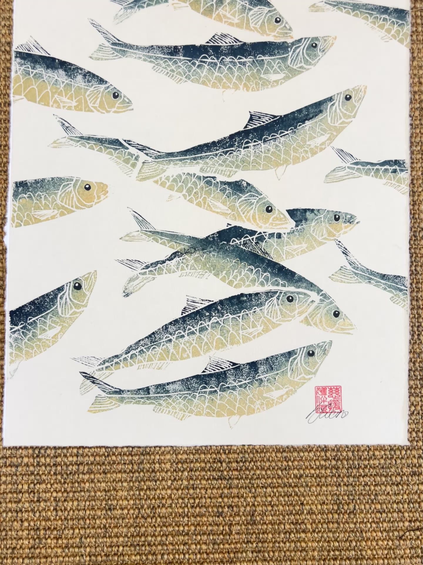 Gosh that's quite a title!  However this is what it is.  I am sometimes frustrated working with small fish that they are so fragile, it makes them very hard to make a Gyotaku with multiple fish on.  I'm also just keen to keep expanding my practice and I like the idea of making these lino cuts at the same size of the real fish and then working with them in exactly the same way I would in Gyotaku.  So as with the Gyotaku, the fish lino cut is inked up and then the paper is lifted over and the impression taken.  Each fish on this print has been done individually from the a few lino cut fish I've made.  After the printing is done the eyes were hand painted on.  Finally it was wet mounted as with all my Gyotaku work.  This print has two sheets of backing paper attached to it.