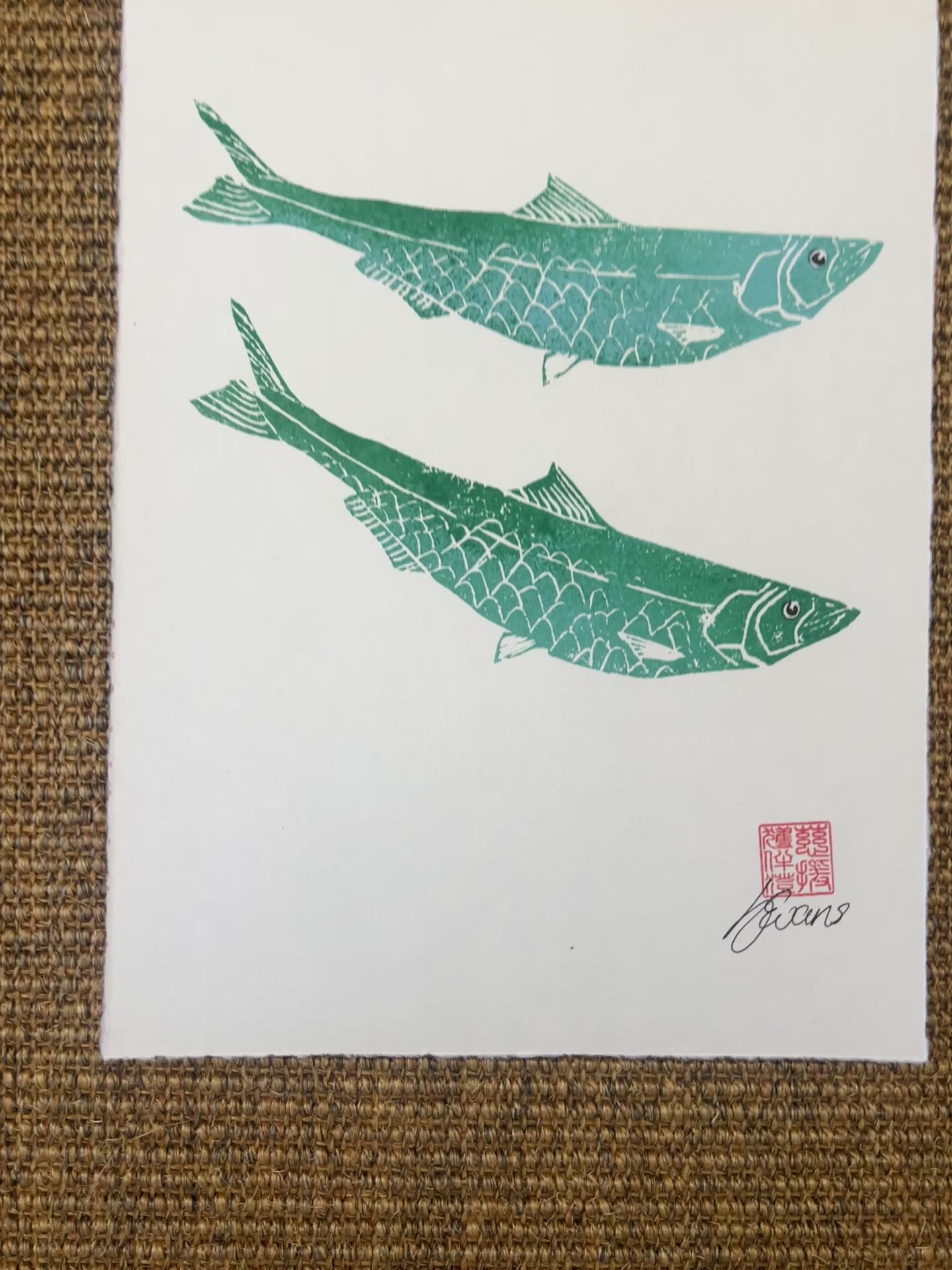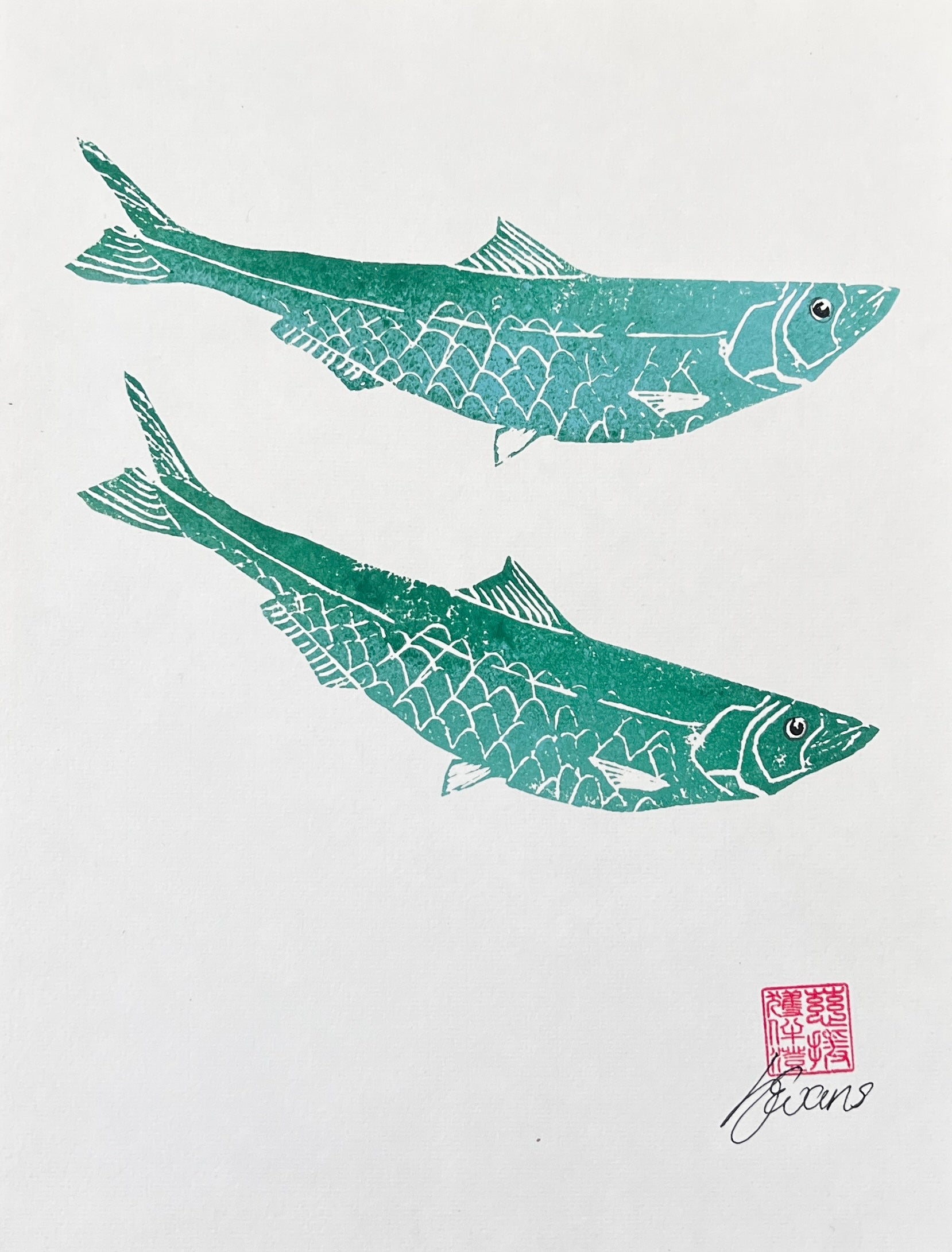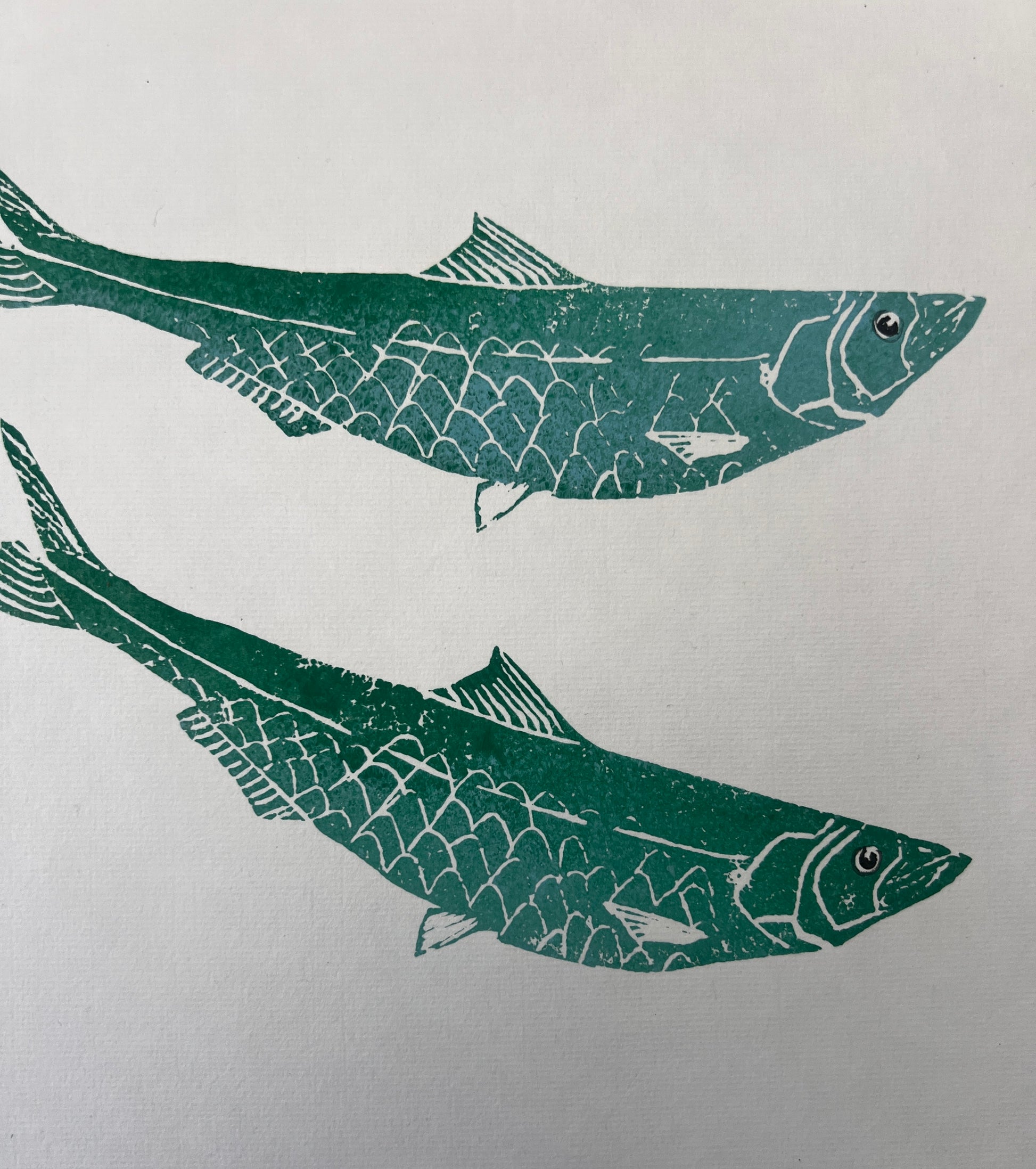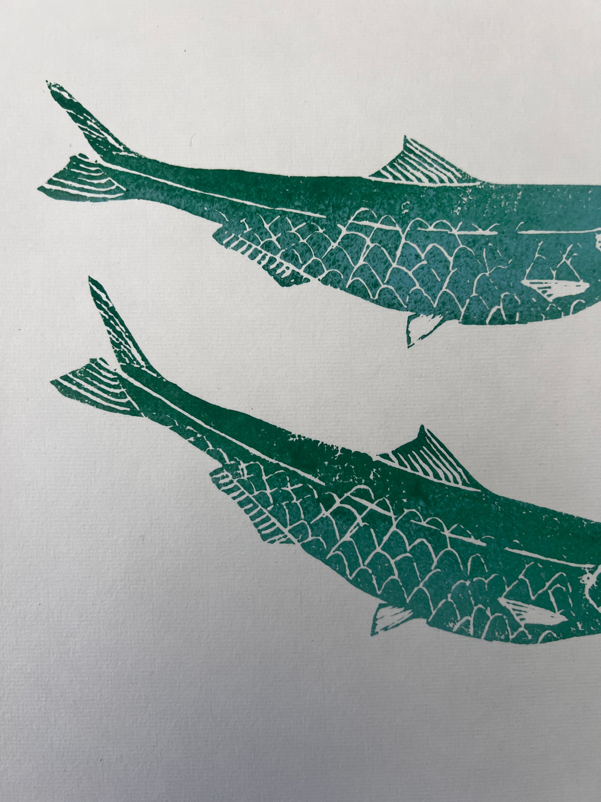 Gosh that's quite a title! However this is what it is. I am sometimes frustrated working with small fish that they are so fragile, it makes them very hard to make a gyotaku with multiple fish on. I'm also just keen to keep expanding my practice and I like the idea of making these lino cuts at the same size of the real fish and then working with them in exactly the same way I would in Gyotkau. So as with the gyotaku, the fish lino cut is inked up and then the paper is lifted over and the impression taken. Each fish on this print has been done individually from the same lino cut. After the printing is done the eyes were hand painted on. Finally it was wet mounted as with all my Gyotaku work. This print has two sheets of backing paper attached to it.