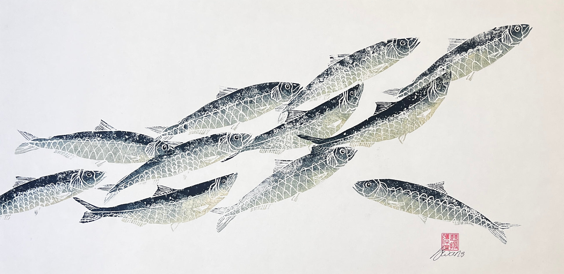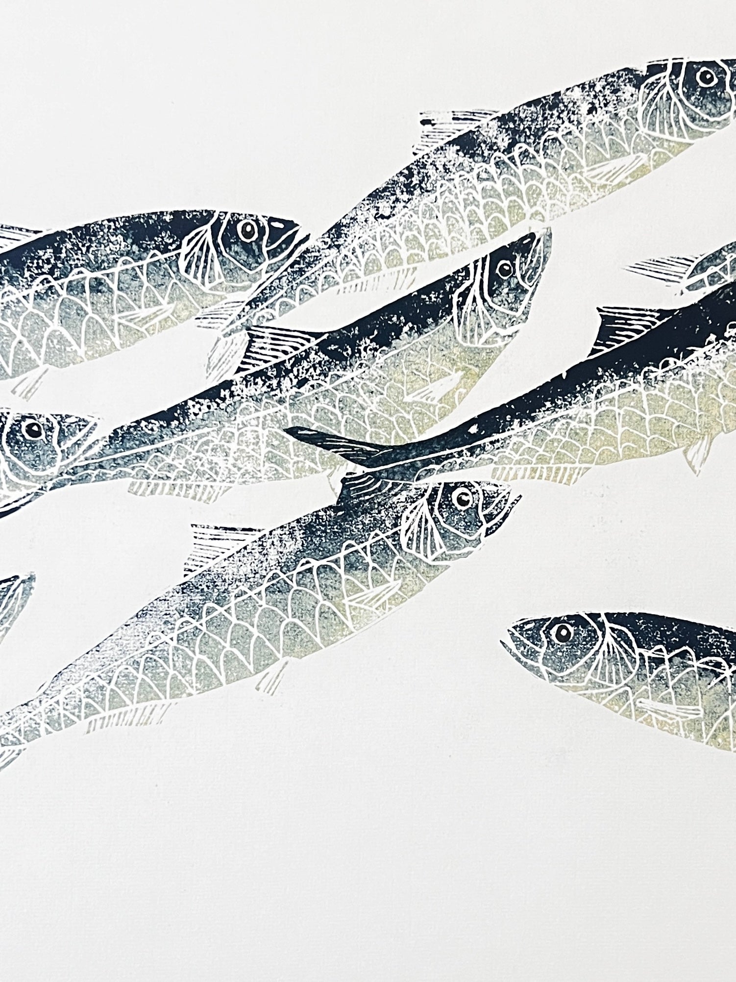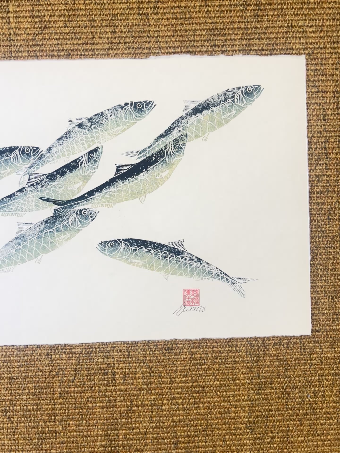 Gosh that's quite a title! However this is what it is. I am sometimes frustrated working with small fish that they are so fragile, it makes them very hard to make a Gyotaku with multiple fish on. I'm also just keen to keep expanding my practice and I like the idea of making these lino cuts at the same size of the real fish and then working with them in exactly the same way I would in Gyotaku. So as with the Gyotaku, the fish lino cut is inked up and then the paper is lifted over and the impression taken. Each fish on this print has been done individually from the a few lino cut fish I've made. After the printing is done the eyes were hand painted on. Finally it was wet mounted as with all my Gyotaku work. This print has two sheets of backing paper attached to it.