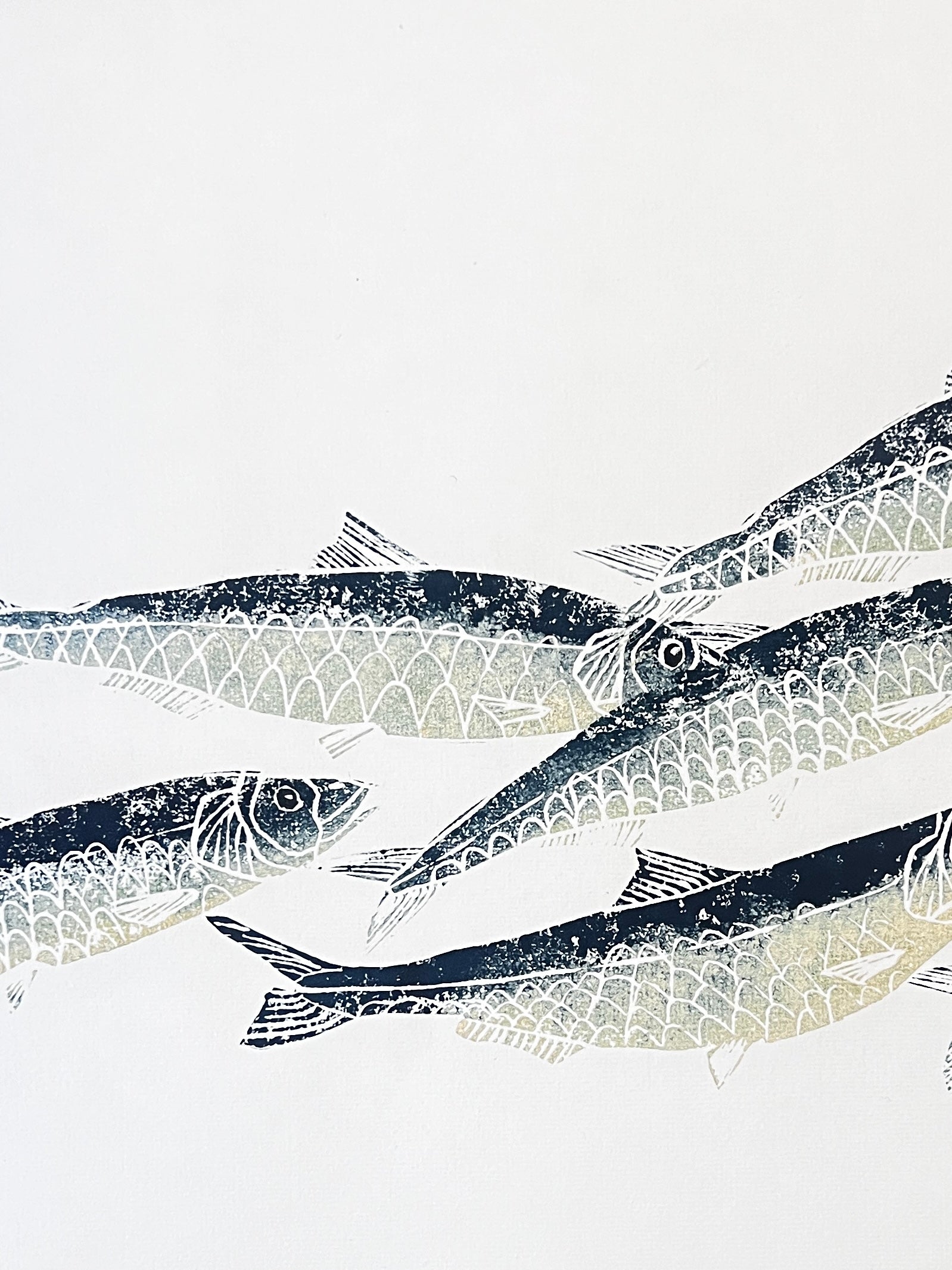 All my prints are unique as the fish are printed by hand and placed individually. A certificate is provide with each unique artwork. I've used a high quality blue and gold acrylic ink for this print that is both light fast and permanent. It measures approx 70x35cm.