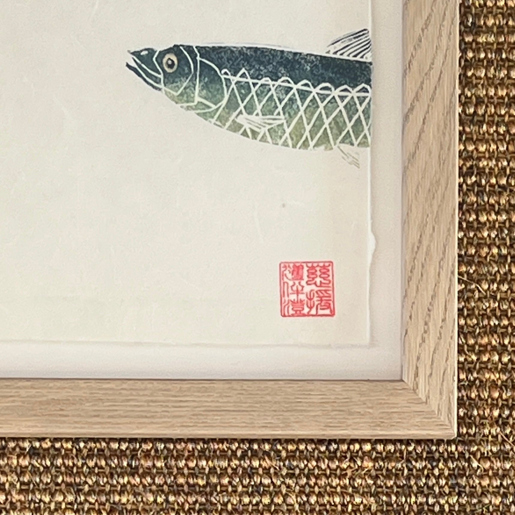 Gosh that's quite a title! However this is what it is. I am sometimes frustrated working with small fish that they are so fragile, it makes them very hard to make a Gyotaku with multiple fish on. I'm also just keen to keep expanding my practice and I like the idea of making these lino cuts at the same size of the real fish and then working with them in exactly the same way I would in Gyotaku. So as with the Gyotaku, the fish lino cut is inked up and then the paper is lifted over and the impression taken. Each fish on this print has been done individually from the a few lino cut fish I've made. After the printing is done the eyes were hand painted on. Finally it was wet mounted as with all my Gyotaku work.