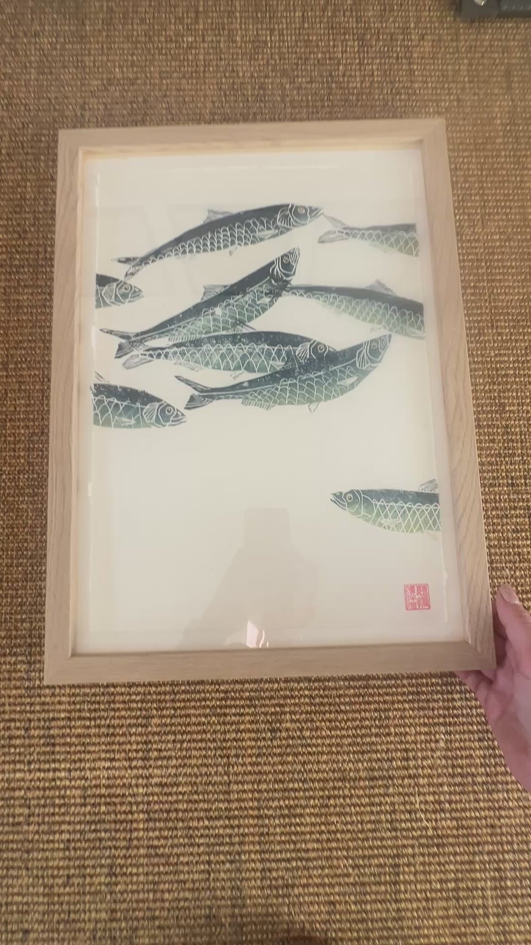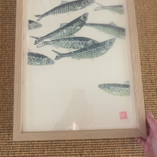 All my prints are unique as the fish are printed by hand and placed individually. A certificate is provide with each unique artwork. I've used a high quality blue and gold acrylic ink for this print that is both light fast and permanent. It's A3 in size and printed on hand made Thai Mulberry Paper. It was then wet mounted to a second sheet of Thai Mulberry Paper. It comes float mounted in this oak foil frame with museum quality acrylic glazing and is ready to hang. External frame width is 36cm and height is 49cm.