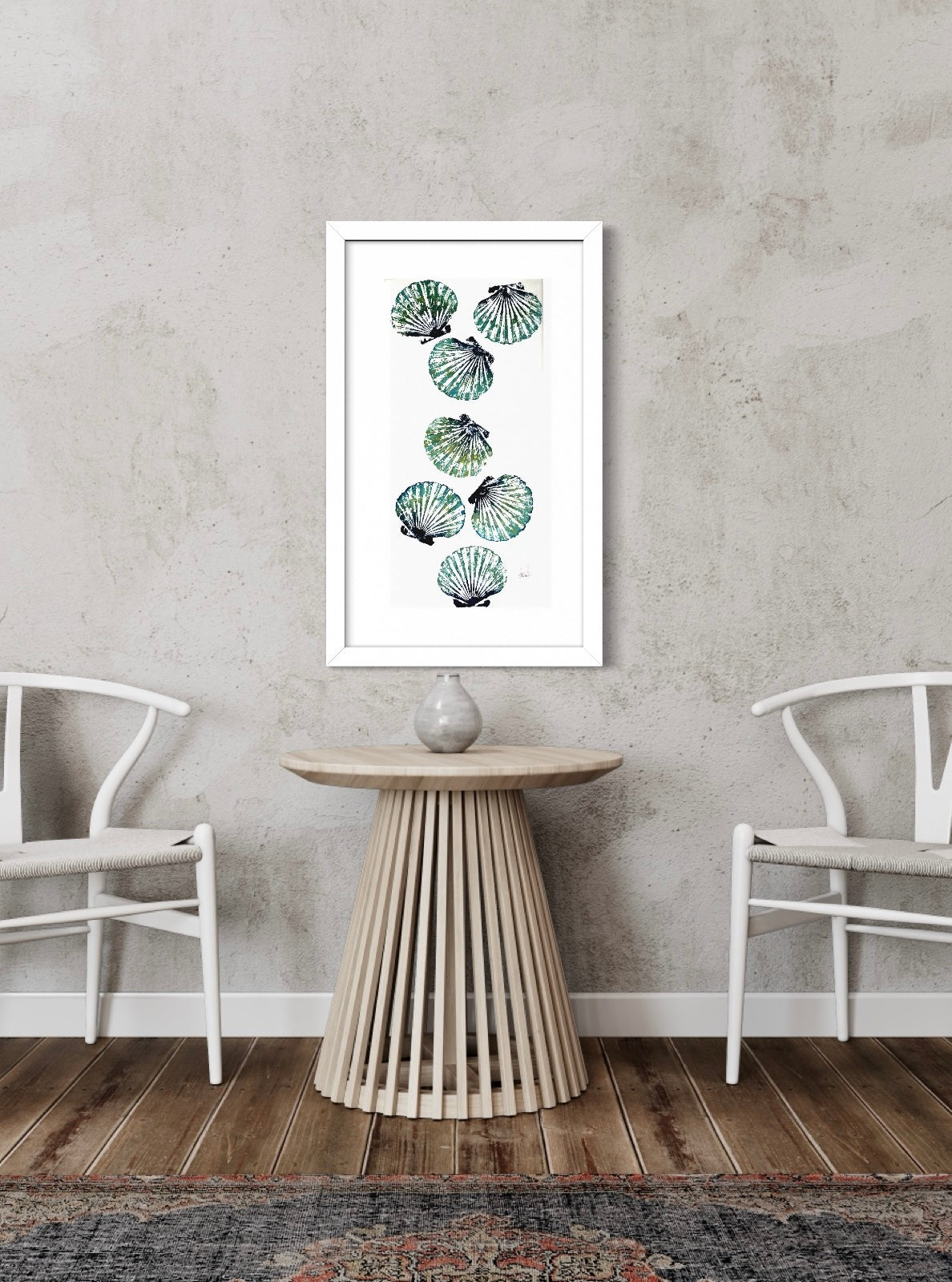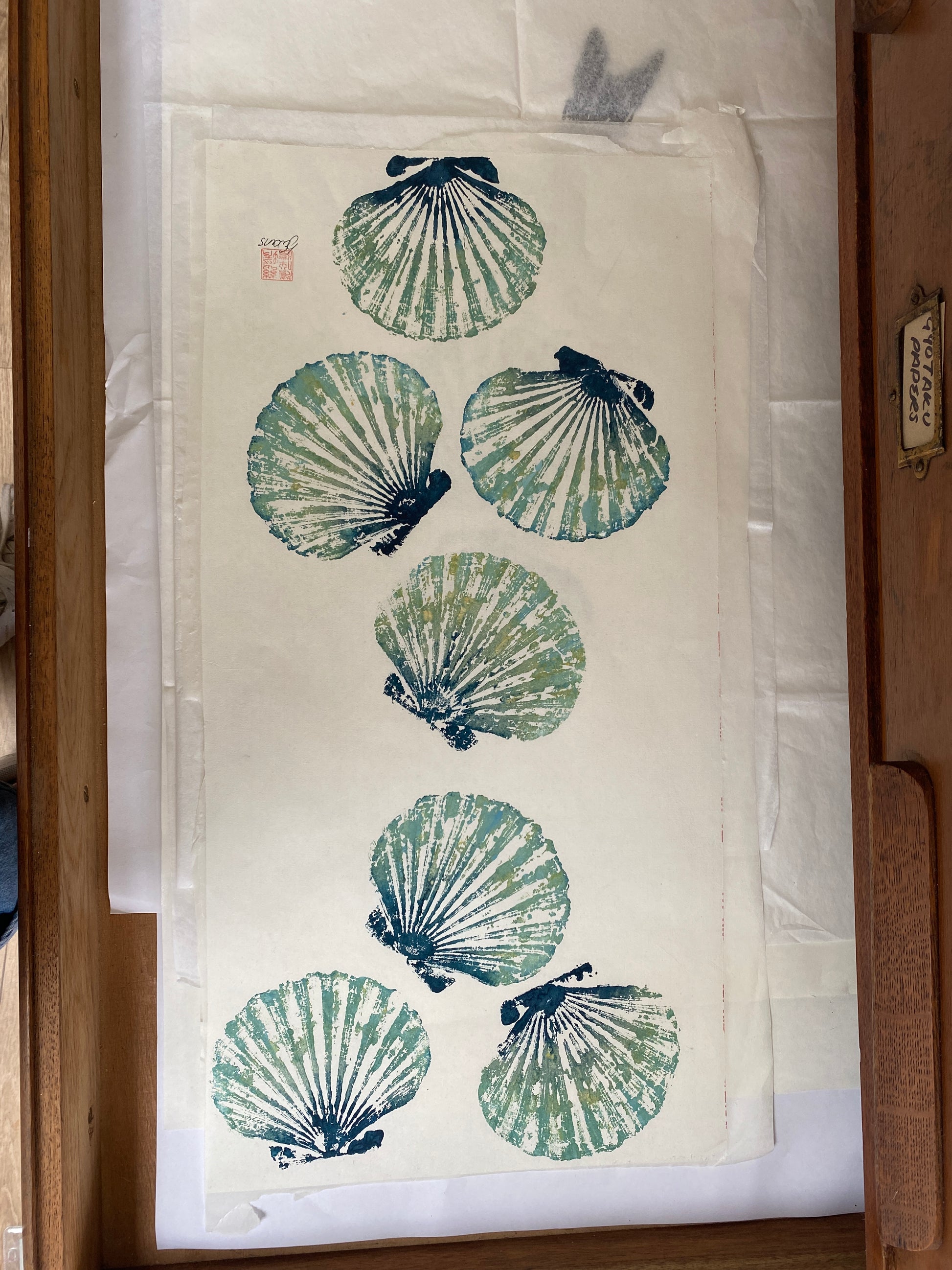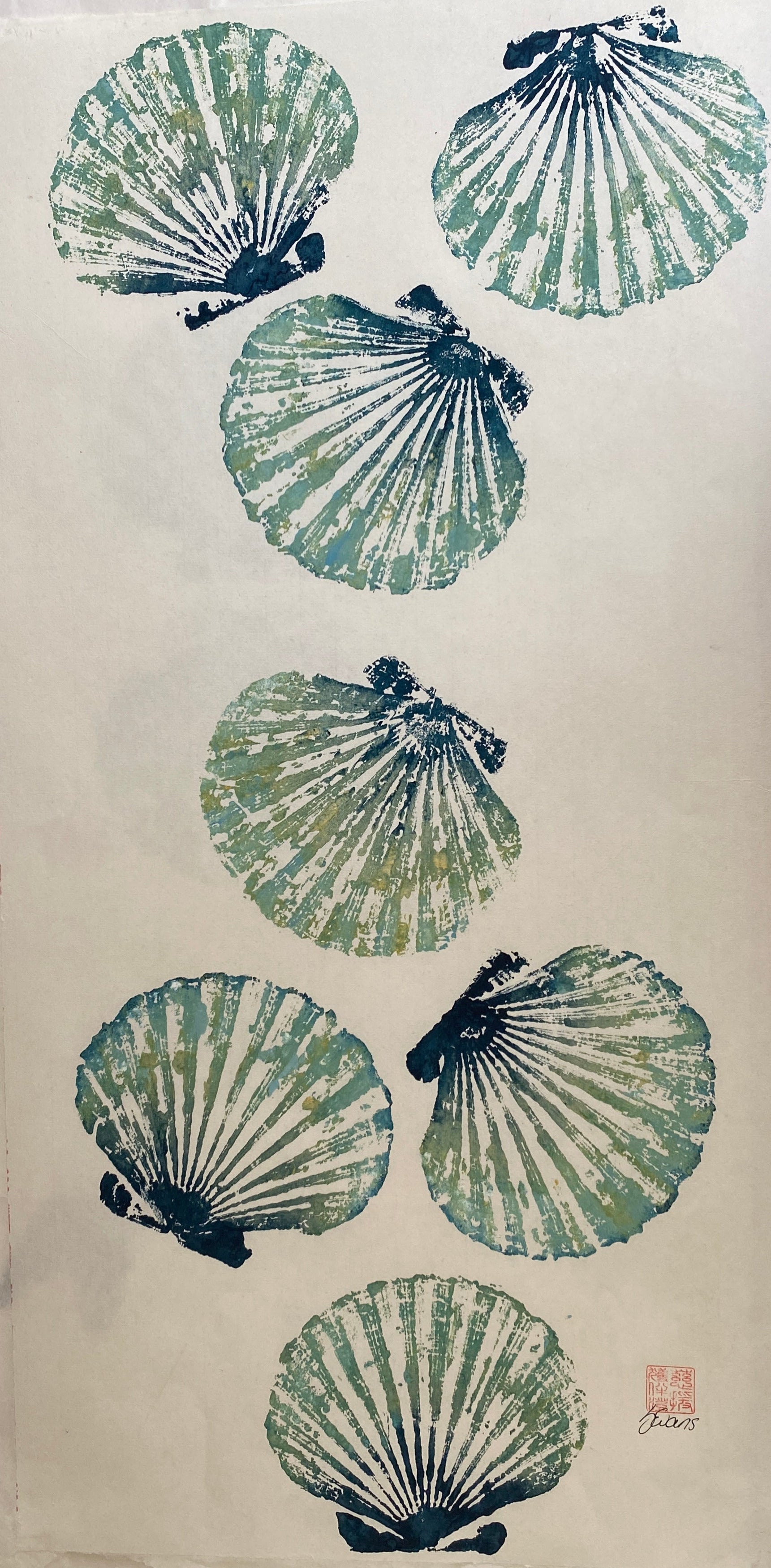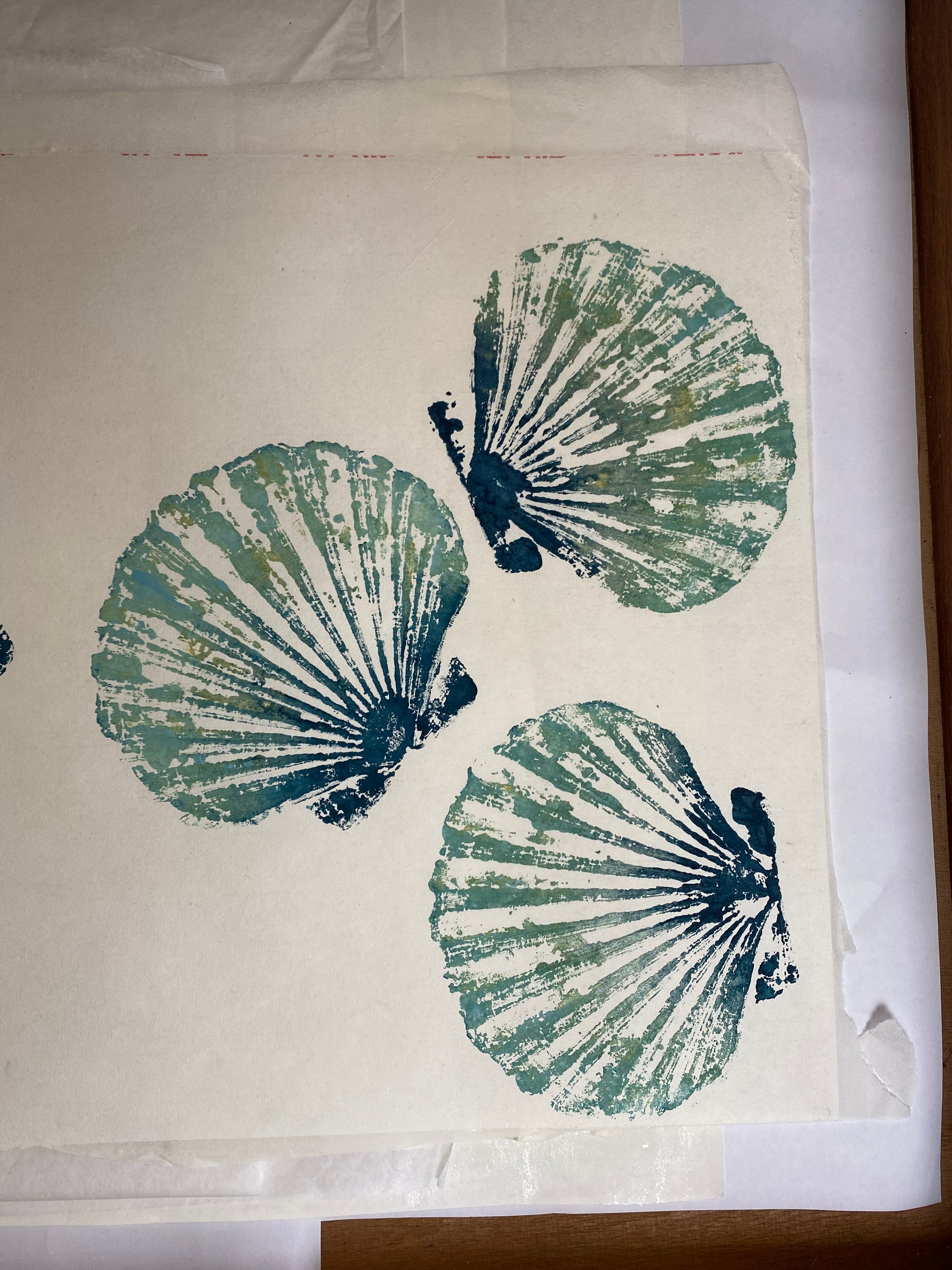 Multiple Scallop Shell Gyotaku Print, Wet Mounted
