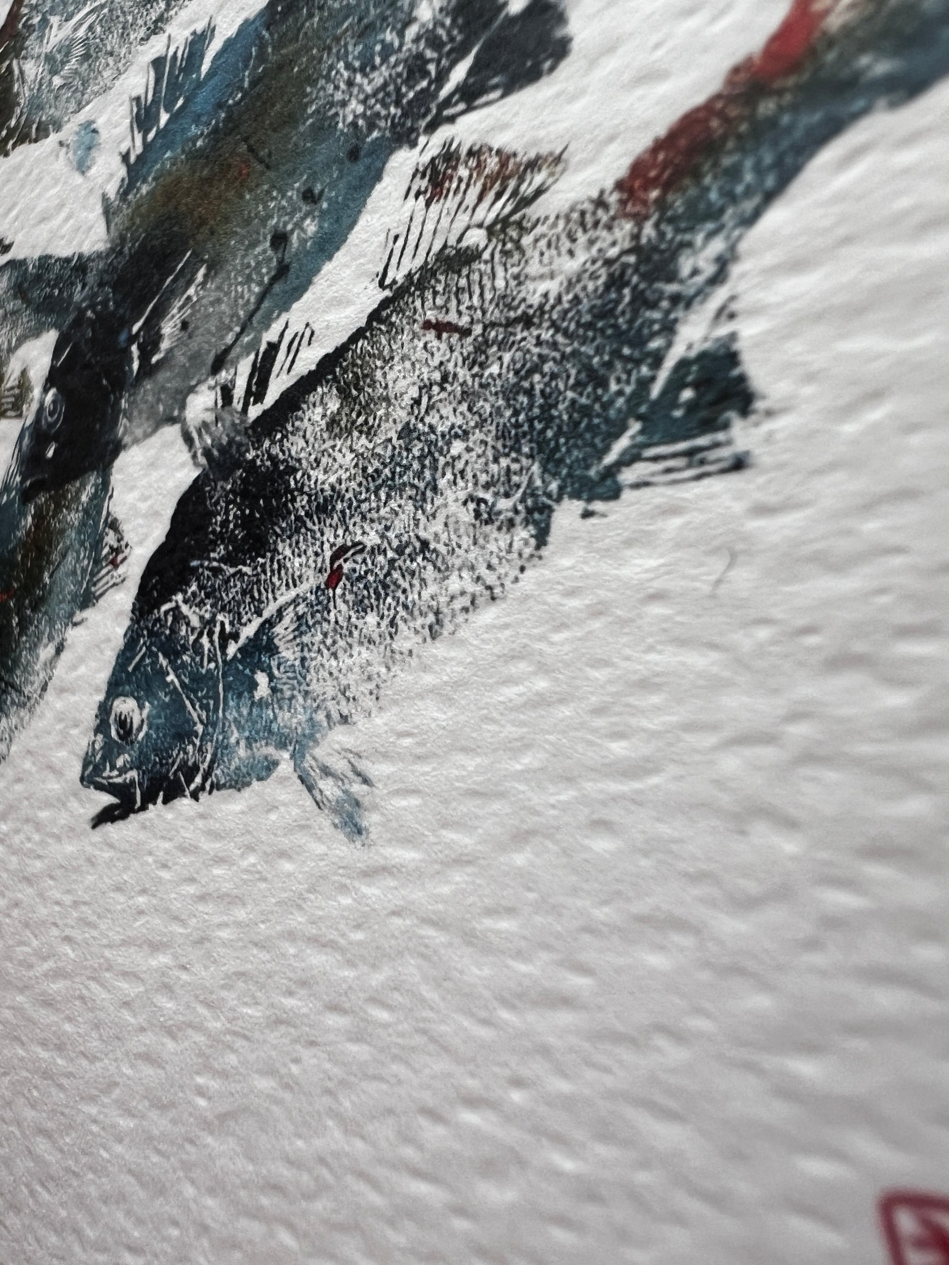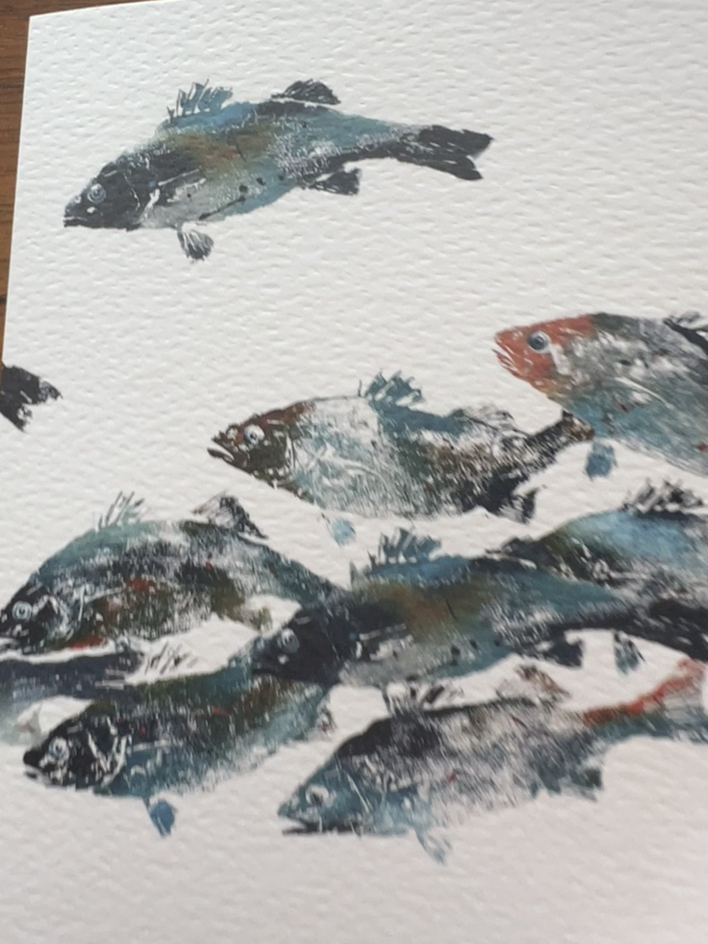 This card is taken from a gyotaku print I made from a single bass. It's a composite of several prints I made on one day.