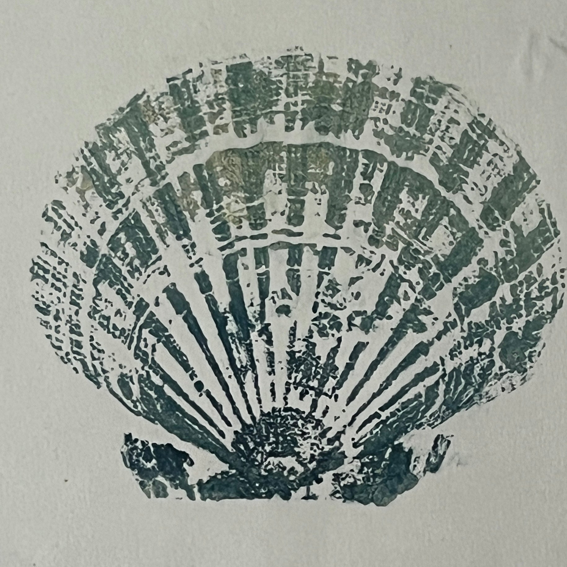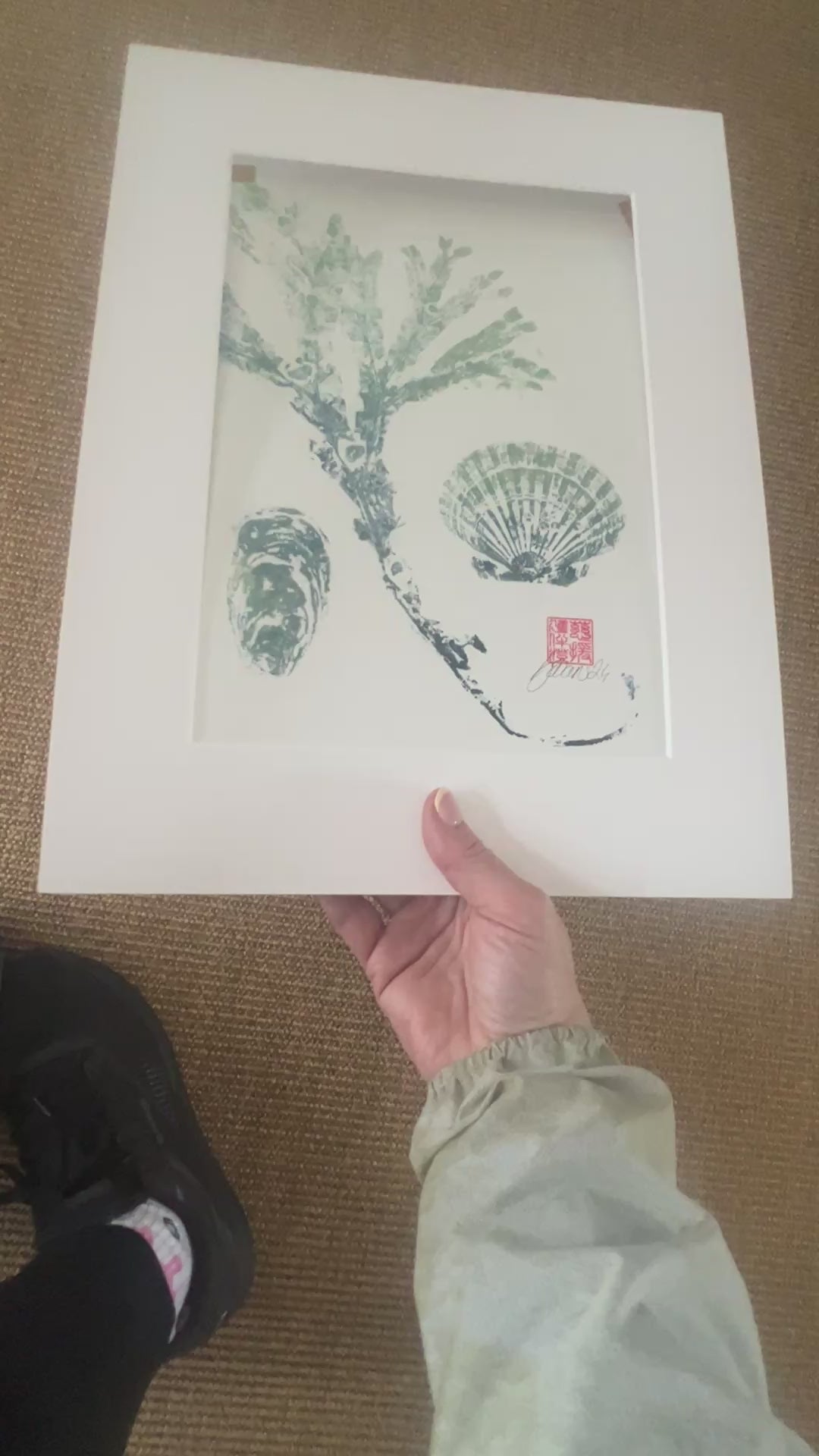 An A4 print from bladderwrack, an oyster and scallop I scooped up off the beach when walking the dog. I've used my regular blue and gold acrylic ink. Measuring around 29x21cm and comes in a mount. If you are interested in the process of Gyotaku, you can find more information here .