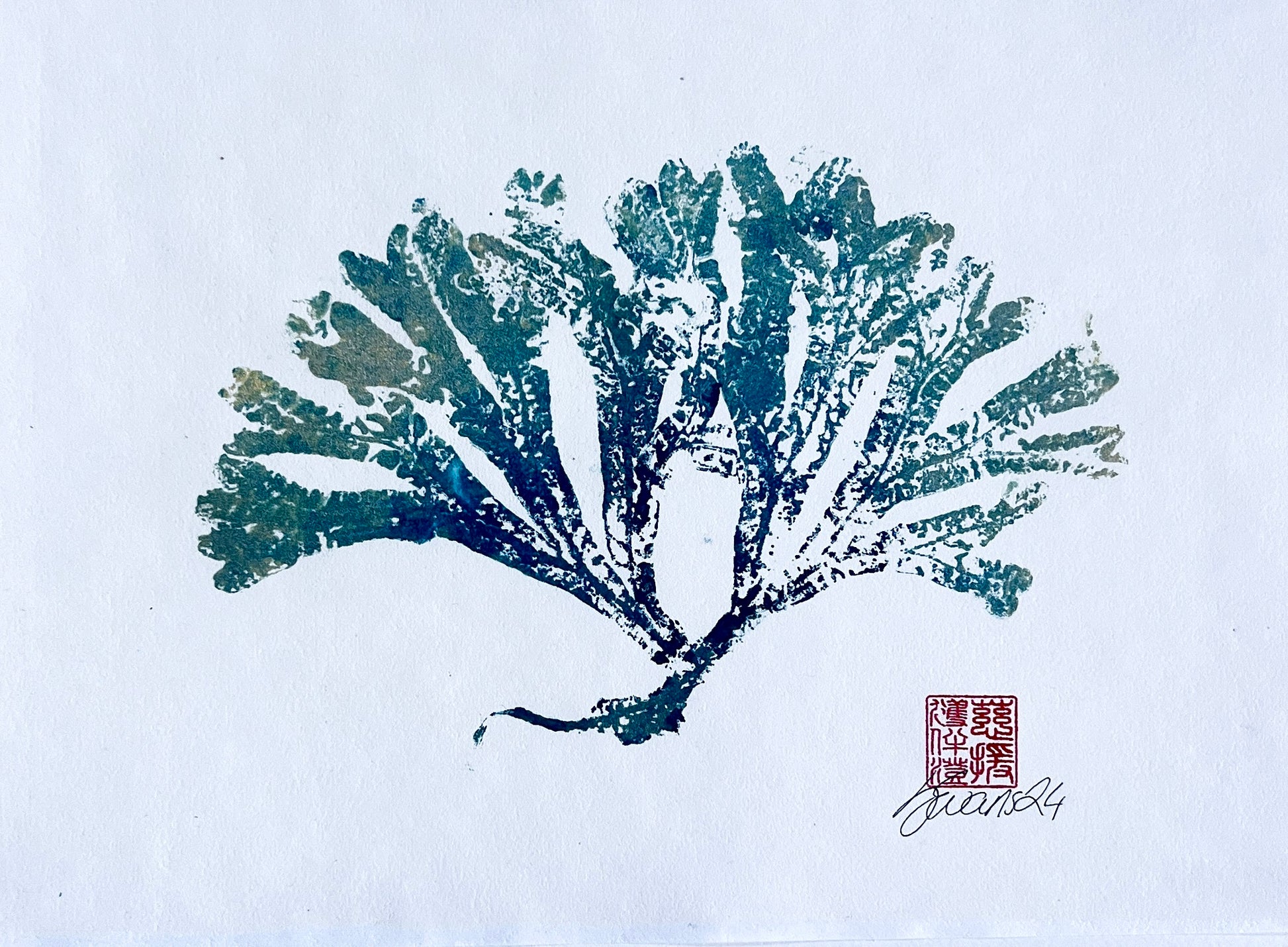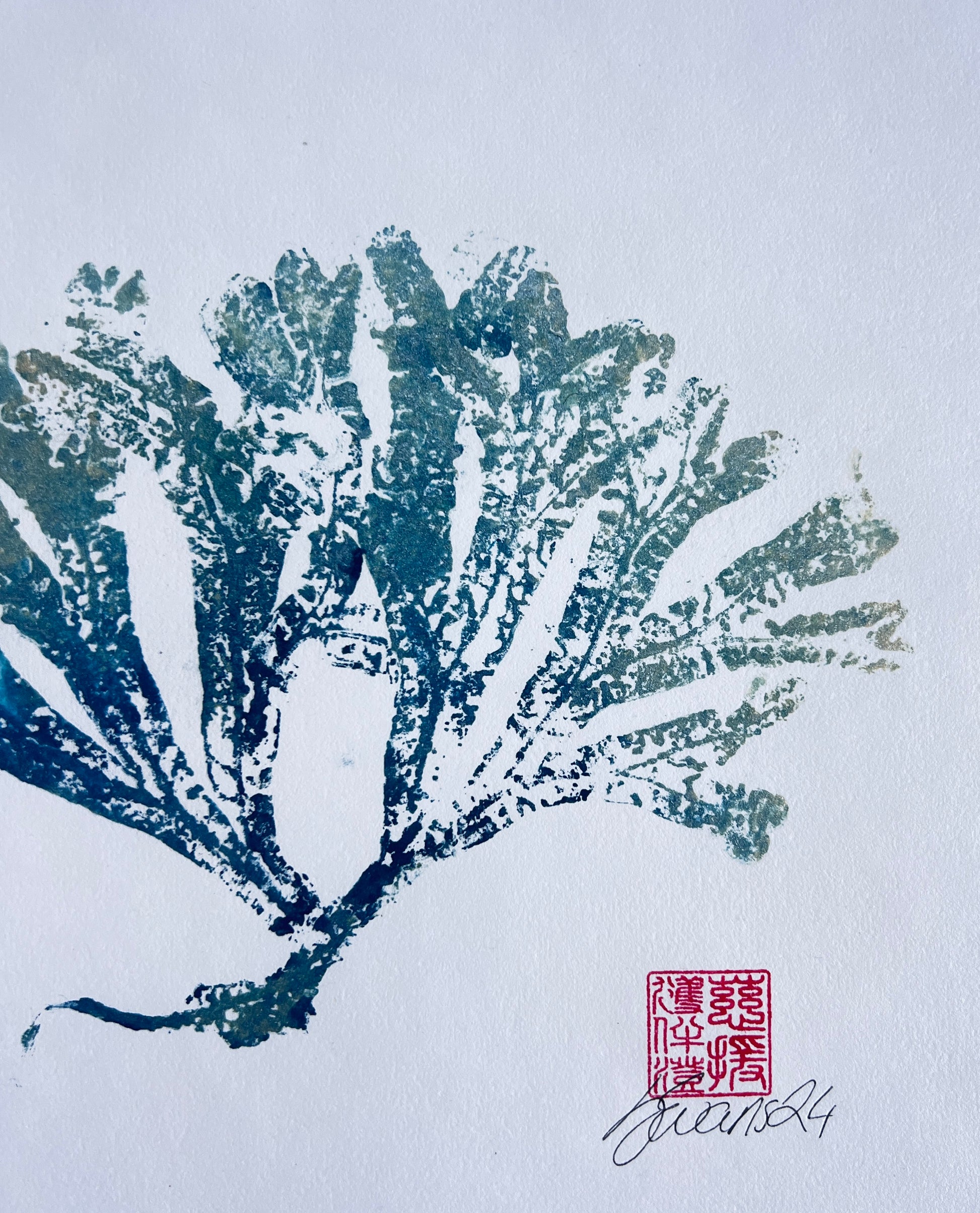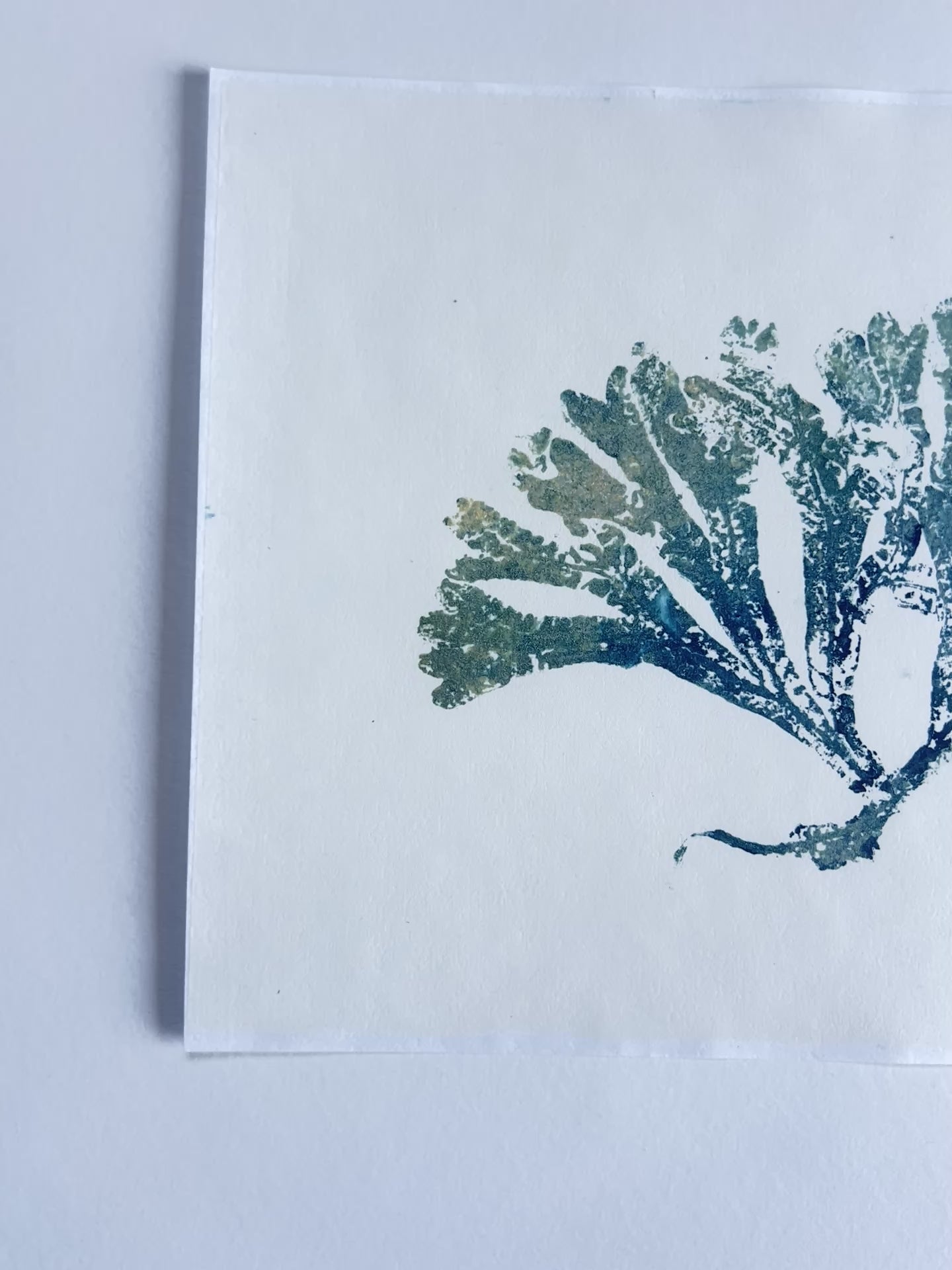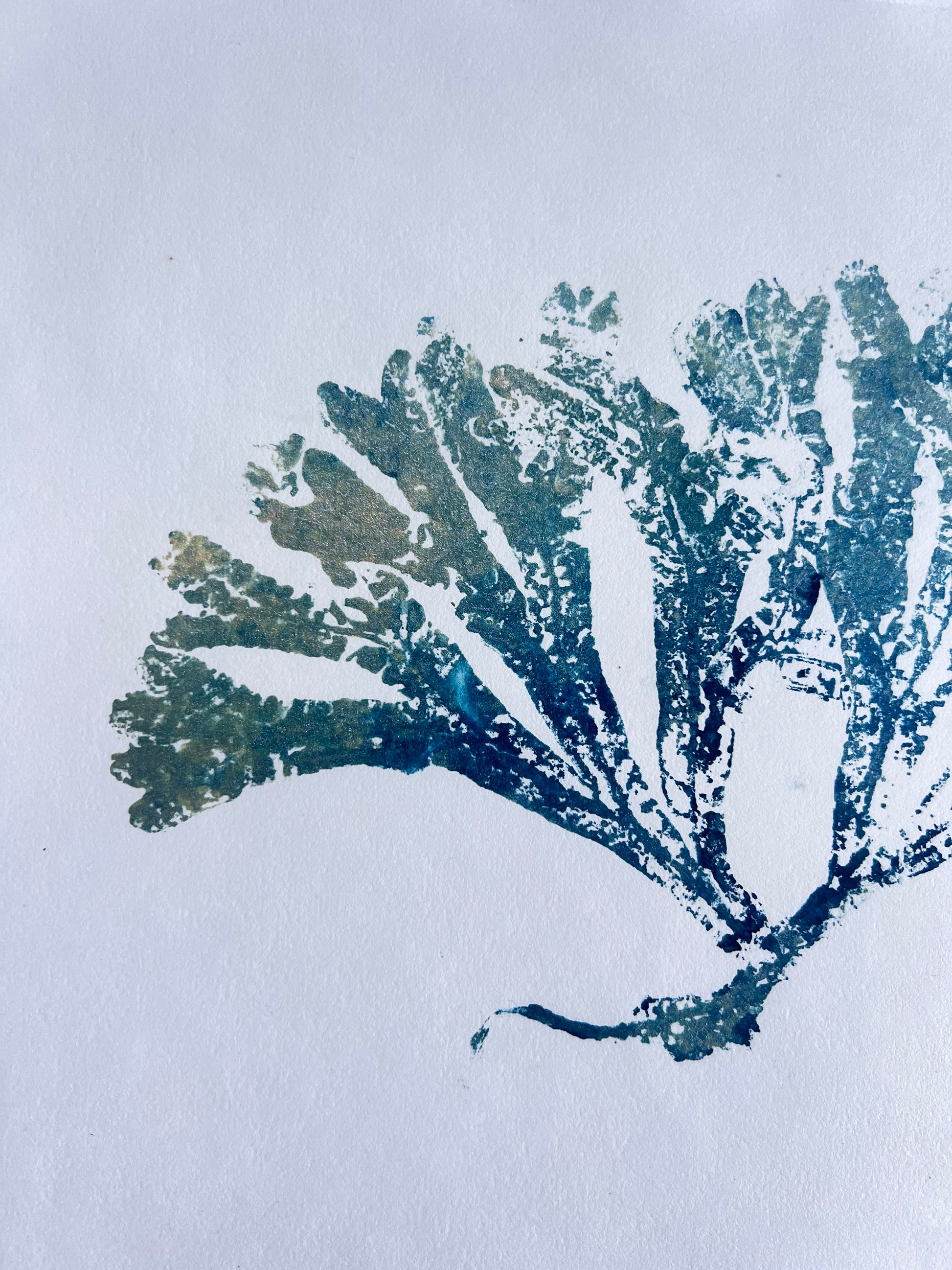 A small print from a seaweed I scooped up off the beach when walking the dog. I've used my regular blue and gold acrylic ink. Measuring around 29x21cm this will fit into an off the shelf A4 frame. If you are interestested in the process of Gyotaku, you can find more information here .