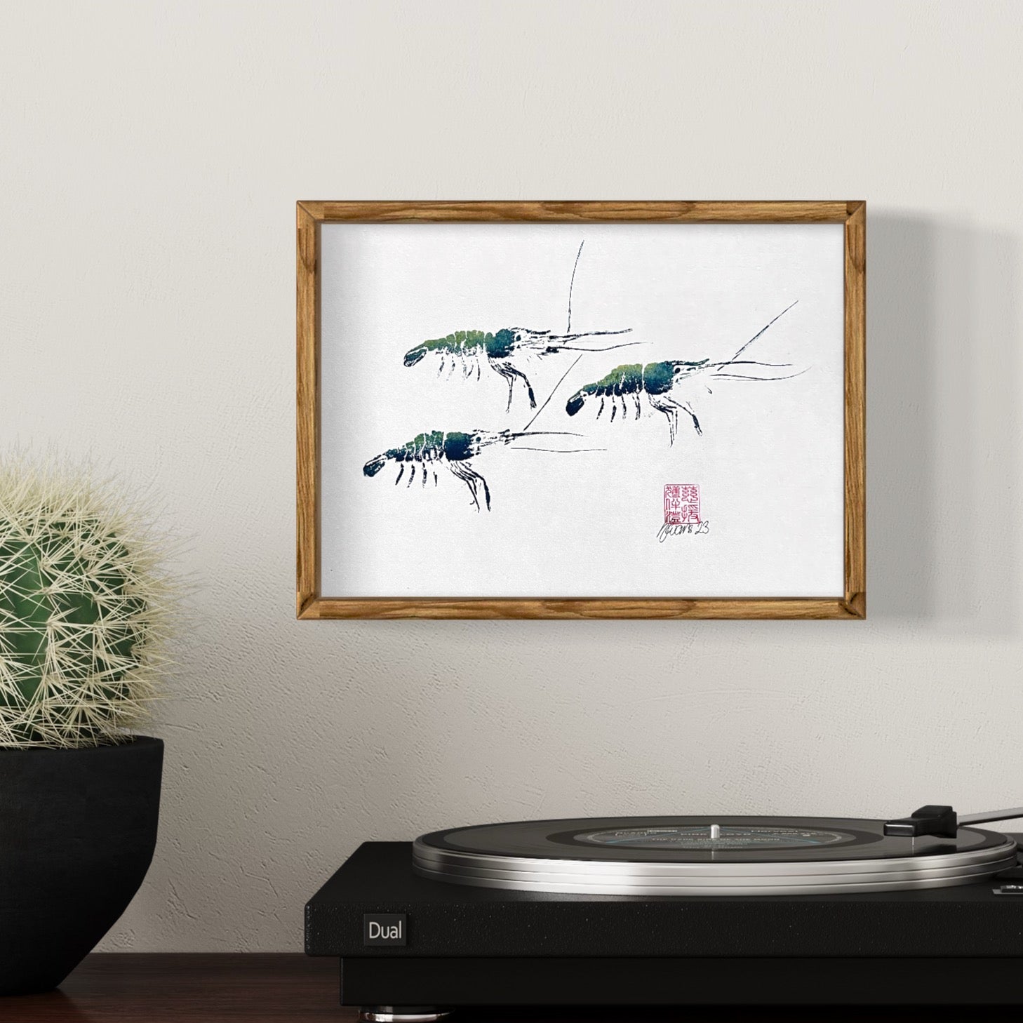 I've printed the same prawn here three times onto an A4 sheet of Chinese calligraphy paper using and dark blue and gold ink. It takes a long time to prepare and ink a prawn and then position it ready to print. So although it's a small print, a lot of work goes into it.