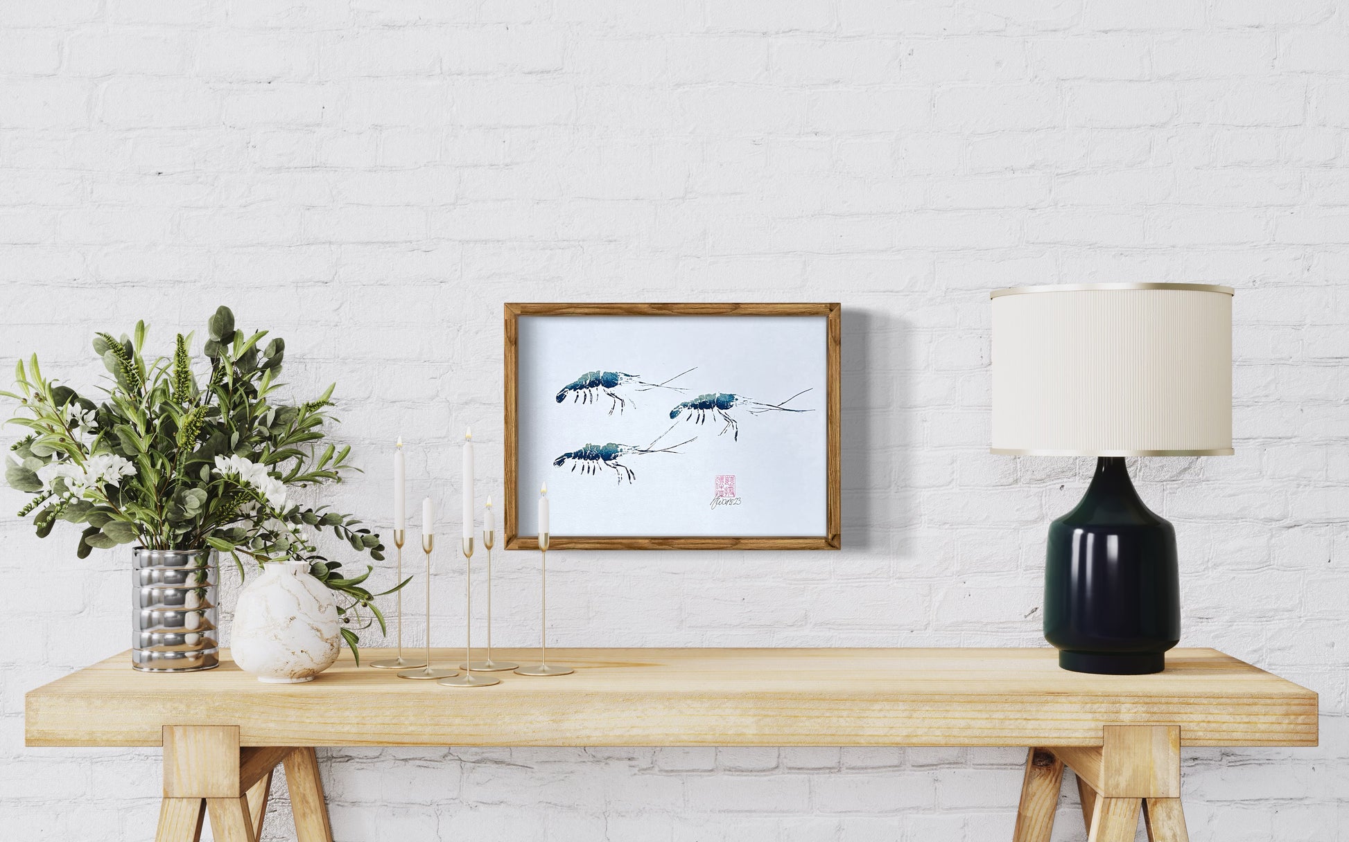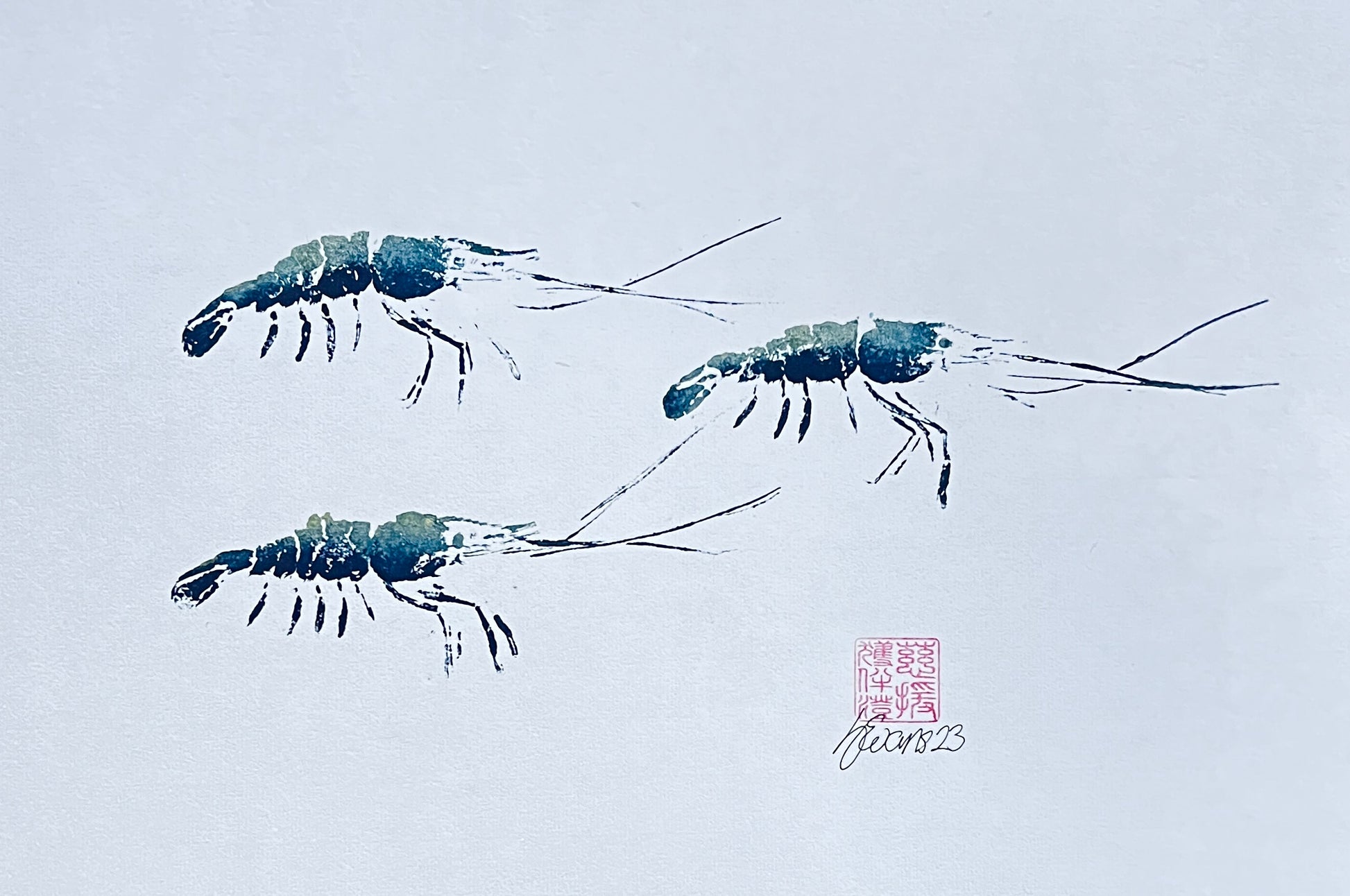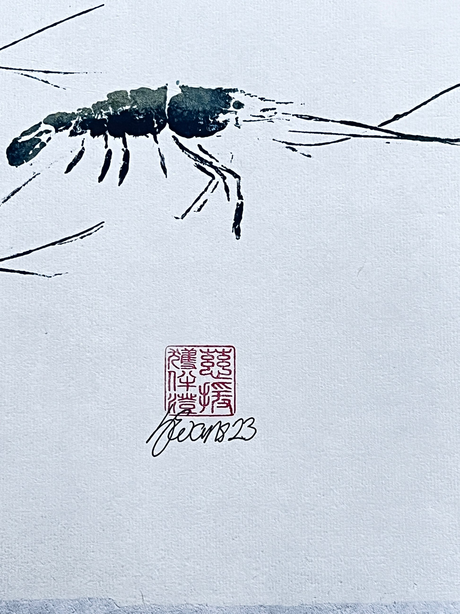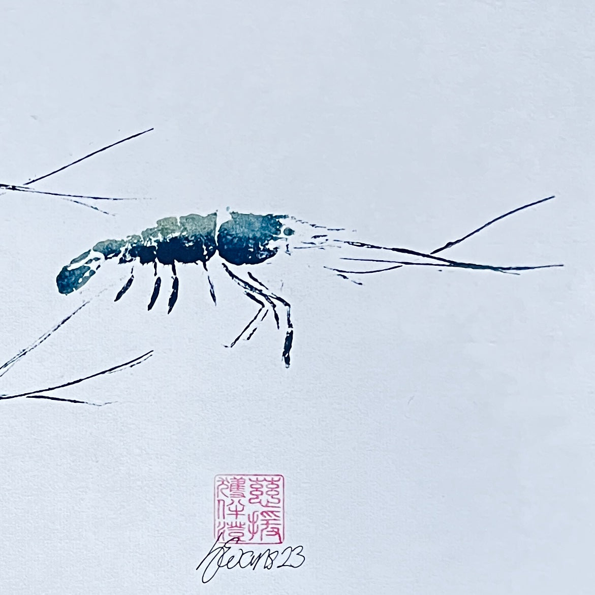 I've printed the same prawn here three times onto an A4 sheet of Chinese calligraphy paper using and dark blue and gold ink.  It takes a long time to prepare and ink a prawn and then position it ready to print.  So although it's a small print, a lot of work goes into it.