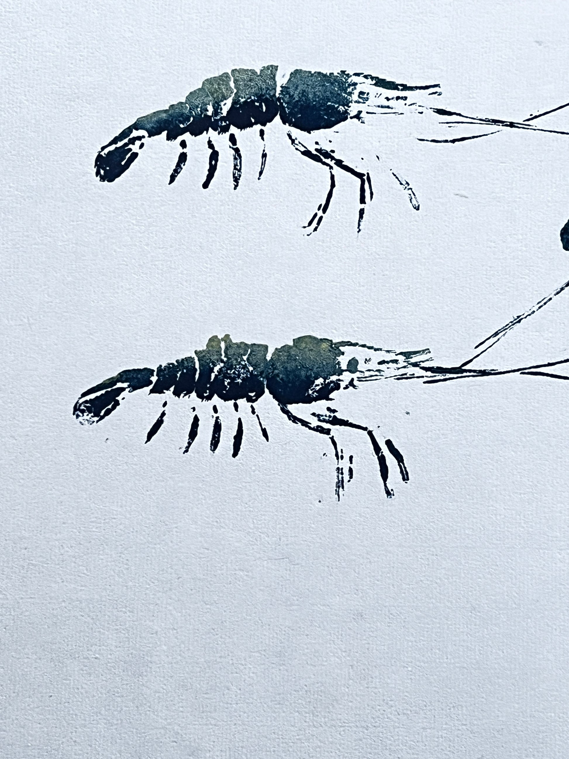 I picked up this prawn from my friend Andy in December, he was clearing down his bait tanks on the Menai and had pulled out half a dozen prawns and a pollock.  He gifted me this little guy and he went in the freezer until I had some time after Christmas to get in the studio and print.